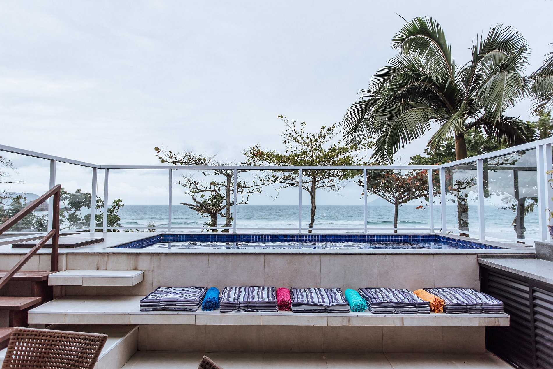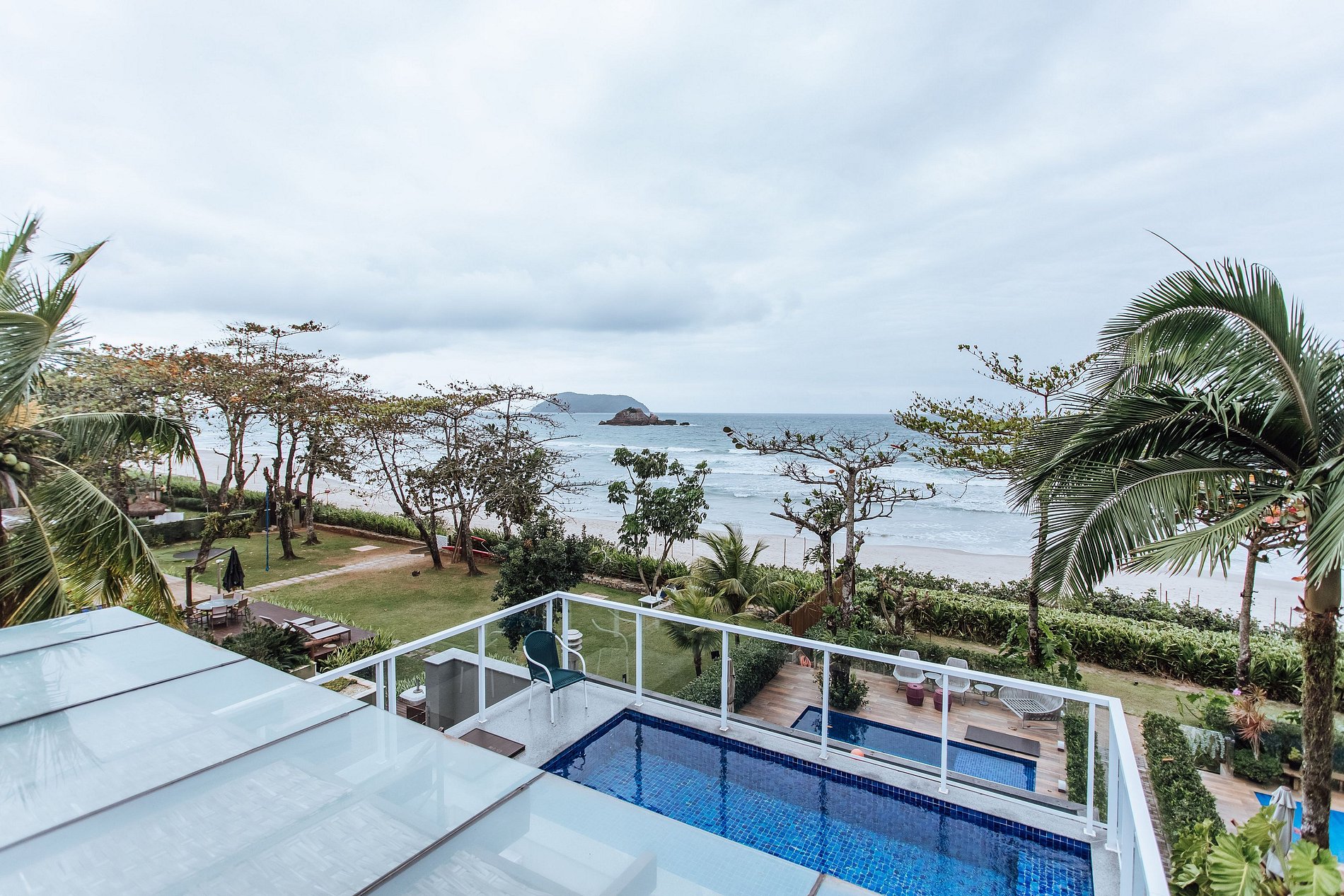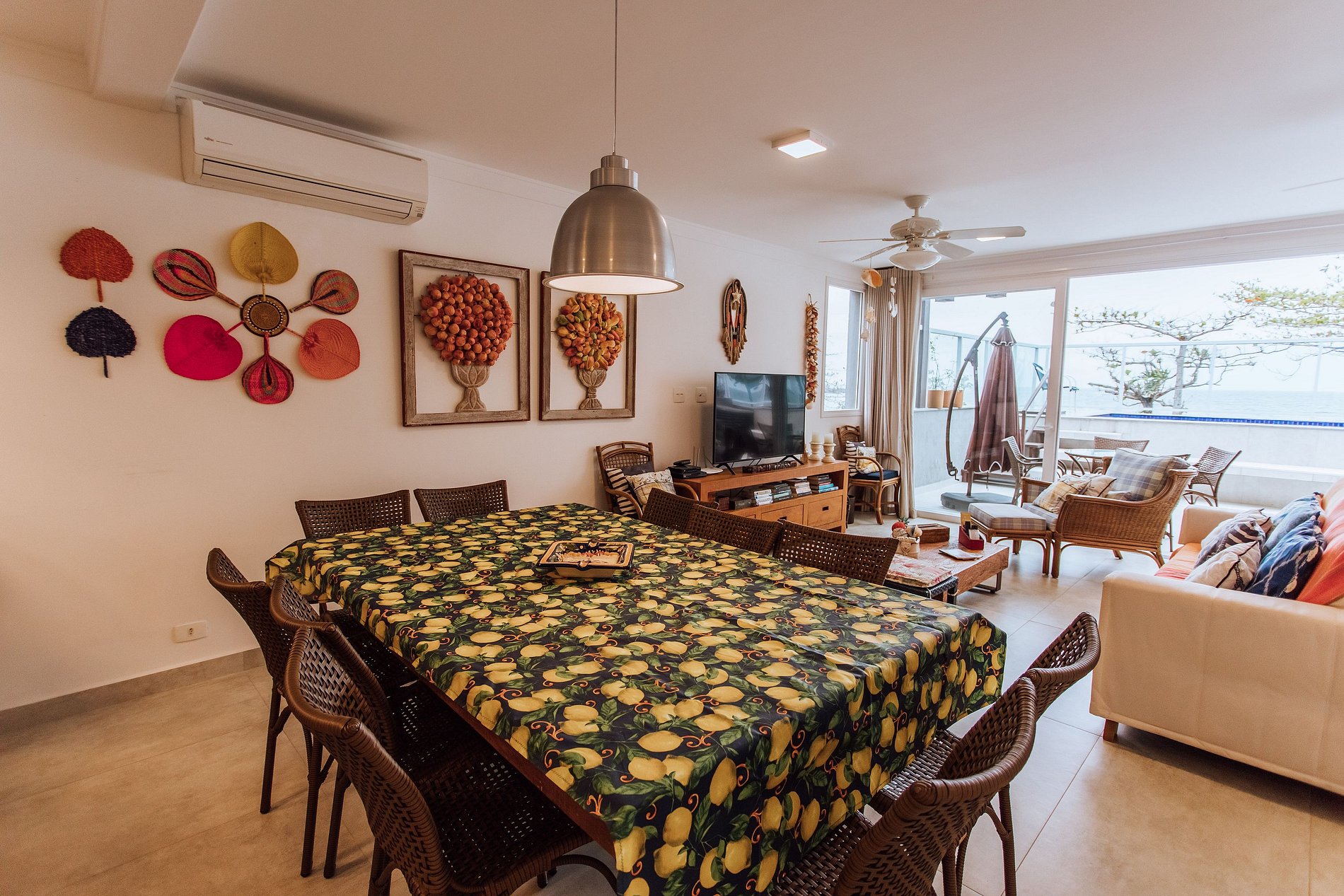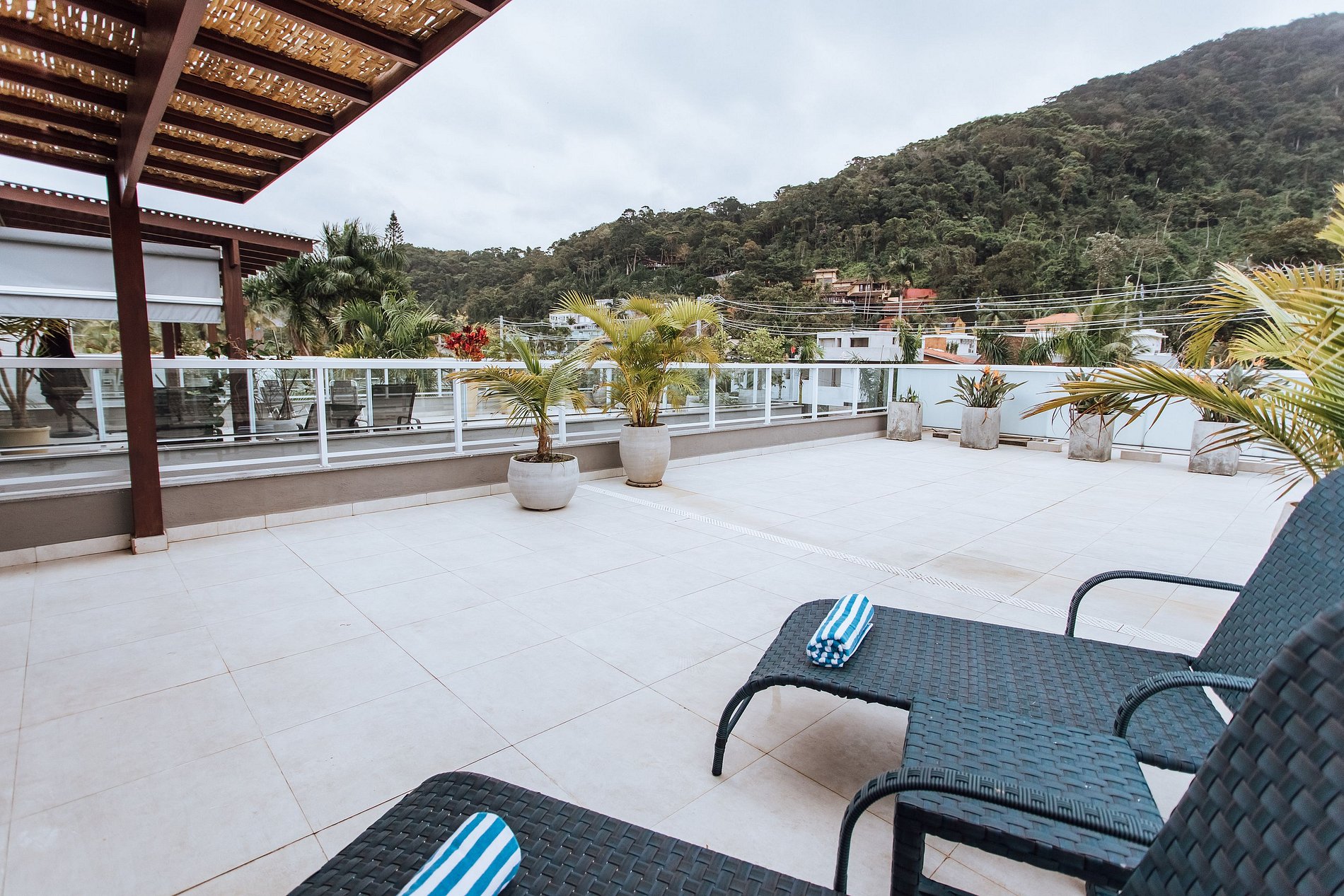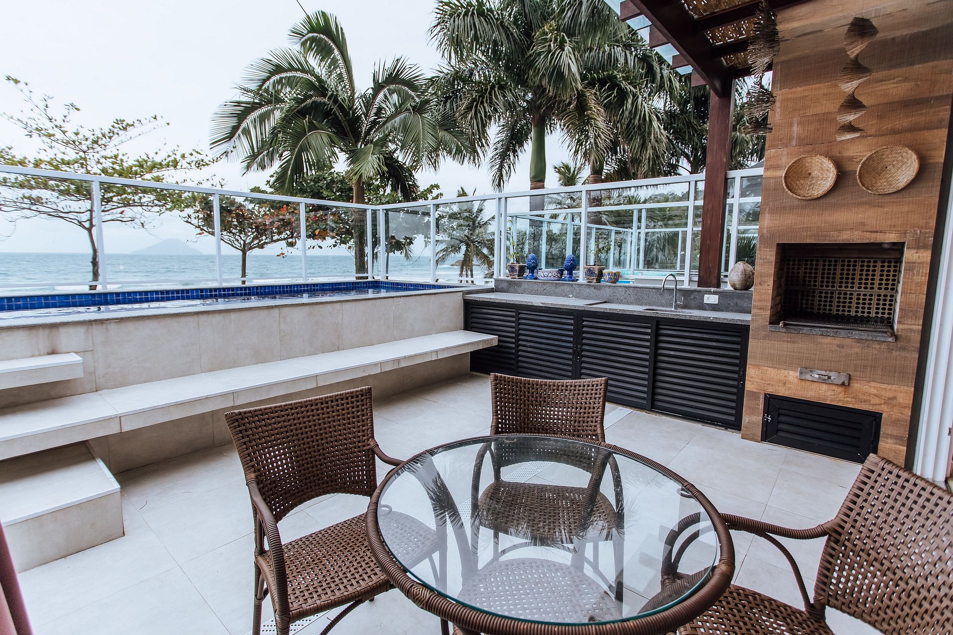 - varanda com mesa, cadeiras e uma vista sensacional da praia de Juquehy;