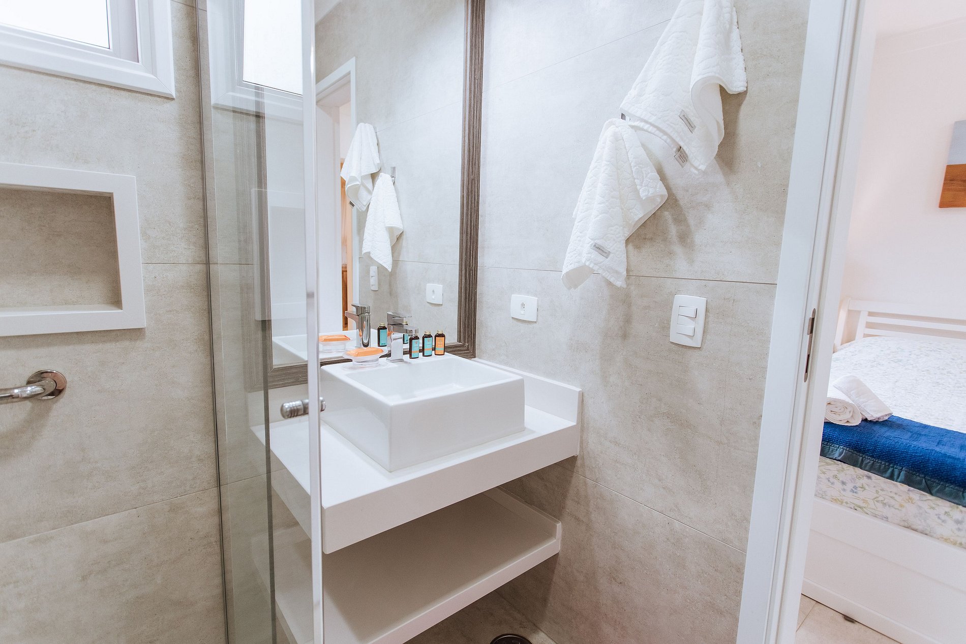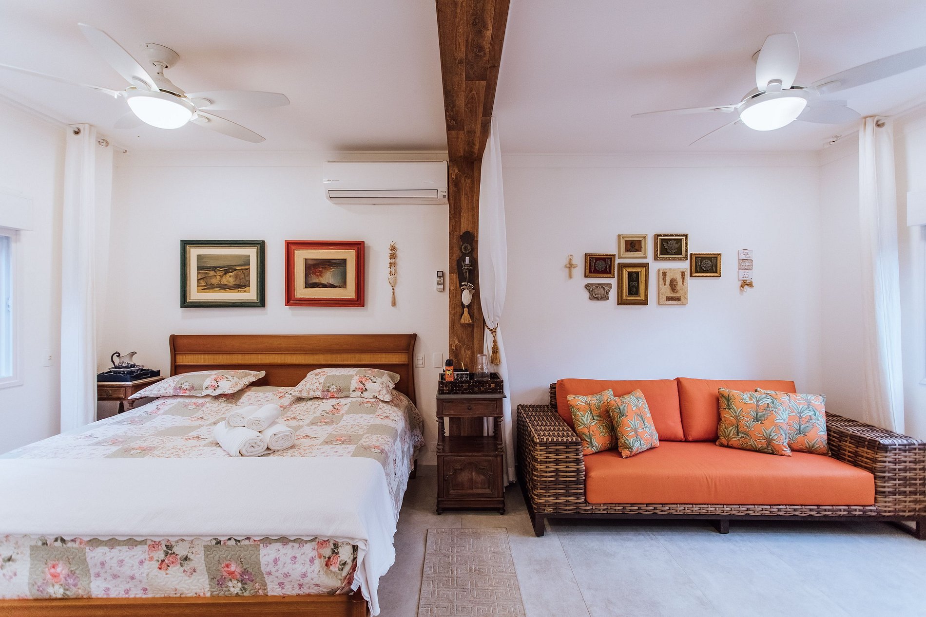 - suíte 1 - master, com 1 cama de casal, armário, sofá, enxoval completo, 2 banheiros e ar-condicionado;