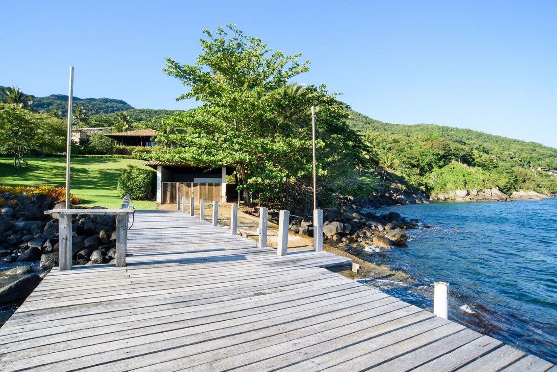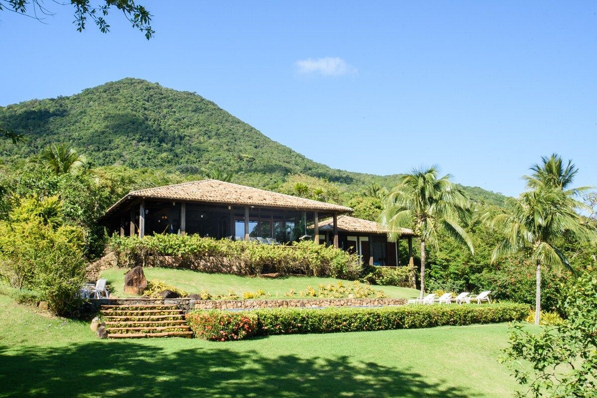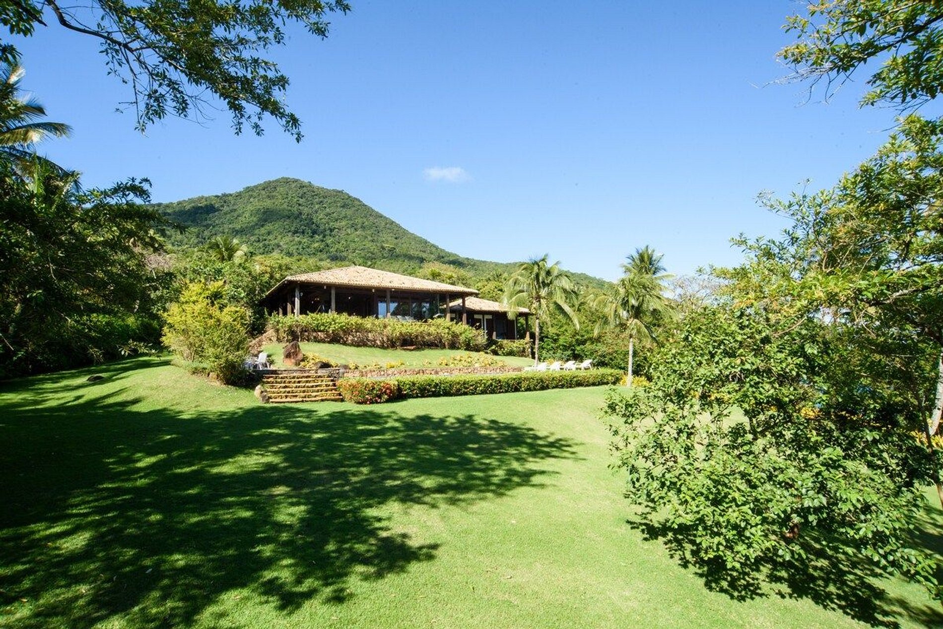 Uma das melhores experiências de Ilhabela! Propriedade exclusiva, vista deslumbrante, luxo, conforto e privacidade à beira-mar. Localizada ao Norte de Ilhabela, na bela Pacoíba, com terreno de 7.000m2 e 1.200m2 de área construída. Casa principal, com 5 suítes, sala com pé direito triplo e casa de hóspede, próxima ao mar, com mais 2 suítes. Smart TV e Wi-fi. Área externa com piscina, sauna, jardim, churrasqueira, píer privativo com acesso ao mar. OBRIGATÓRIA A CONTRATAÇÃO DOS 3 FUNCIONÁRIOS.