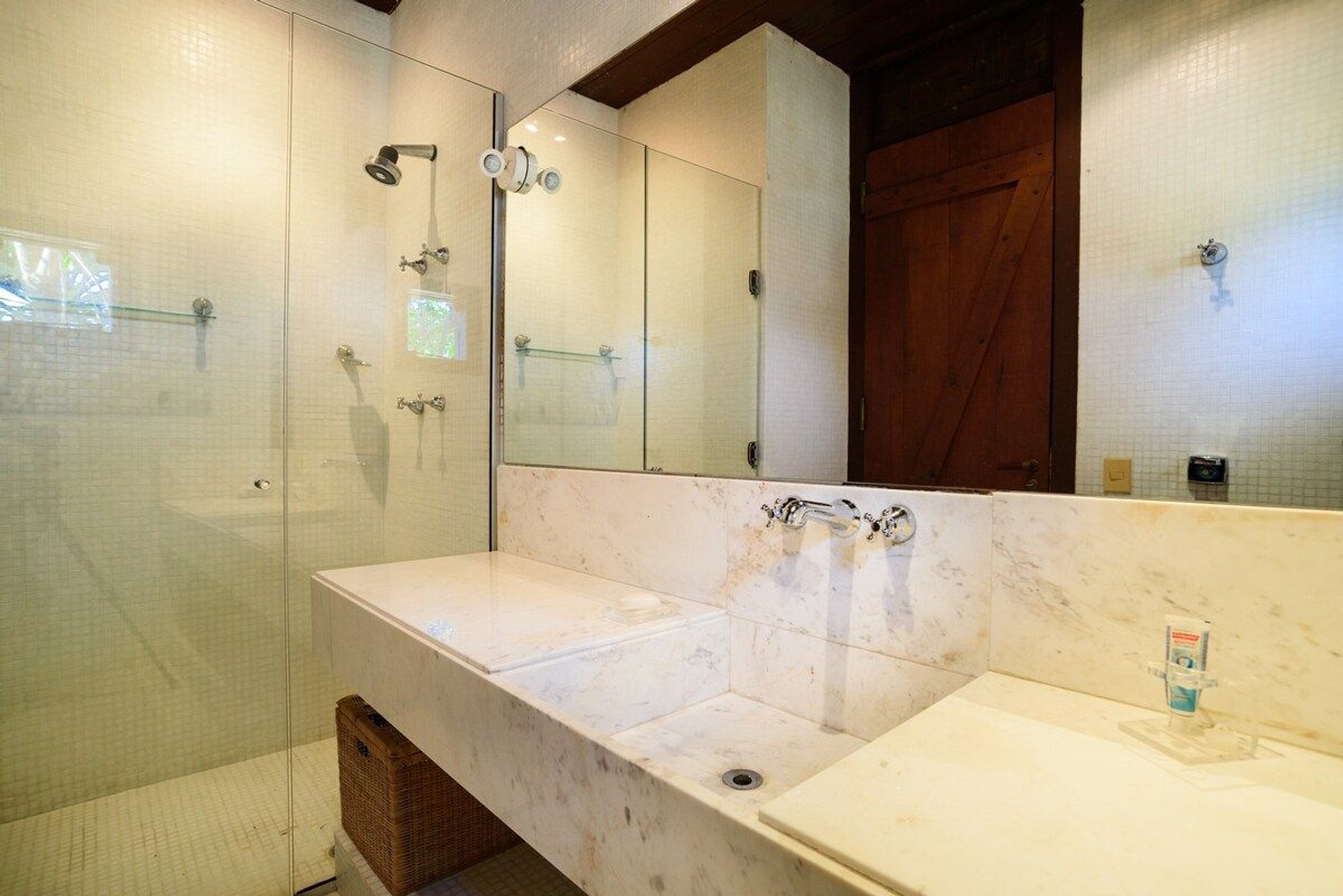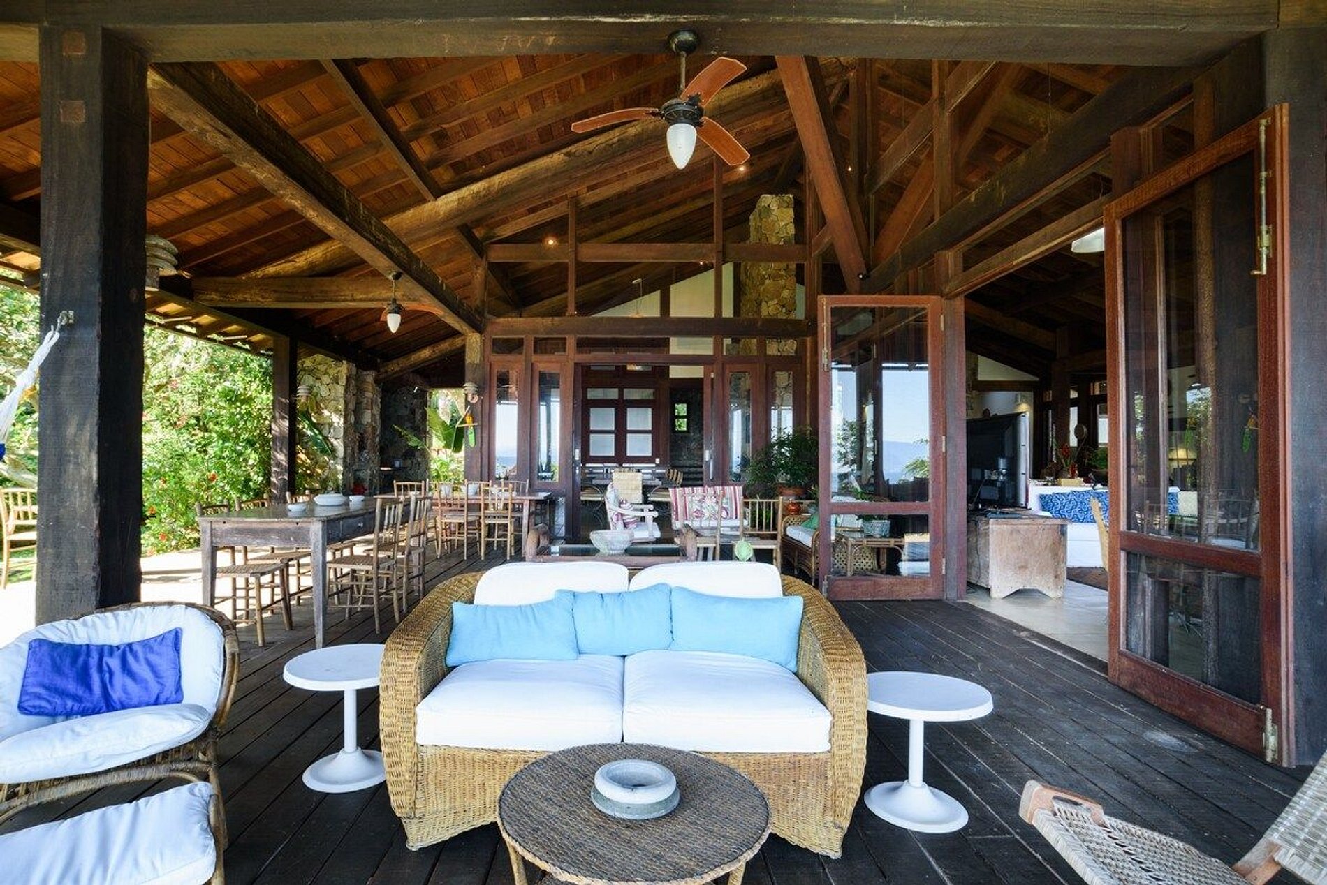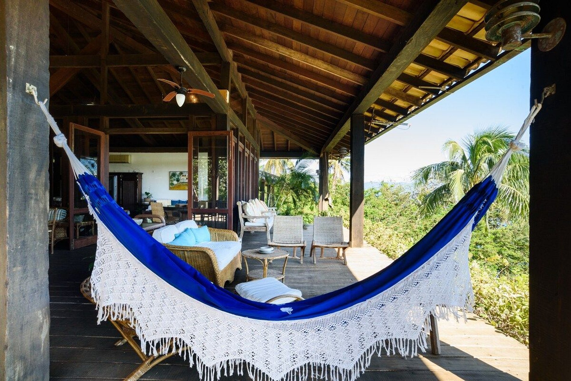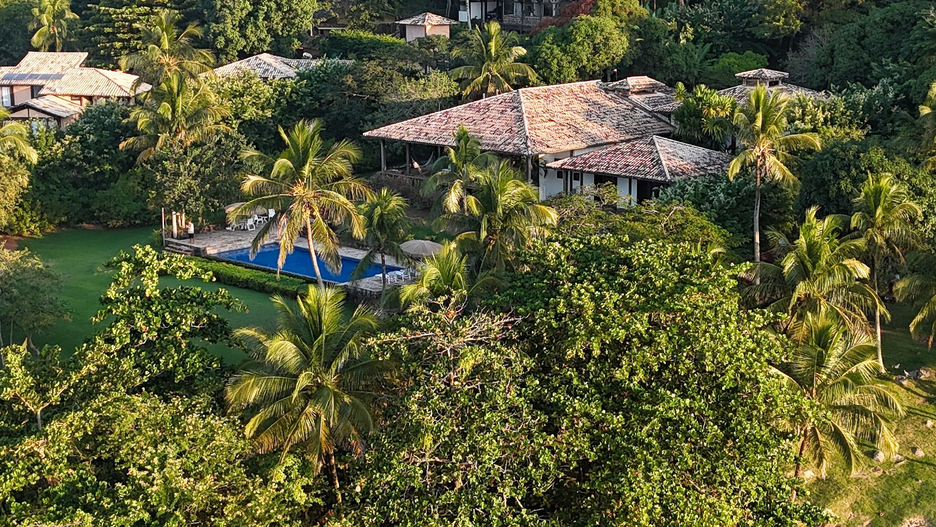 A casa principal dispõe de 5 suítes que acomodam confortavelmente 10 pessoas. Na casa de hóspedes, bem próxima ao mar, são mais 2 suítes com mais uma cozinha e varandas, que acomodam mais 4 pessoas.