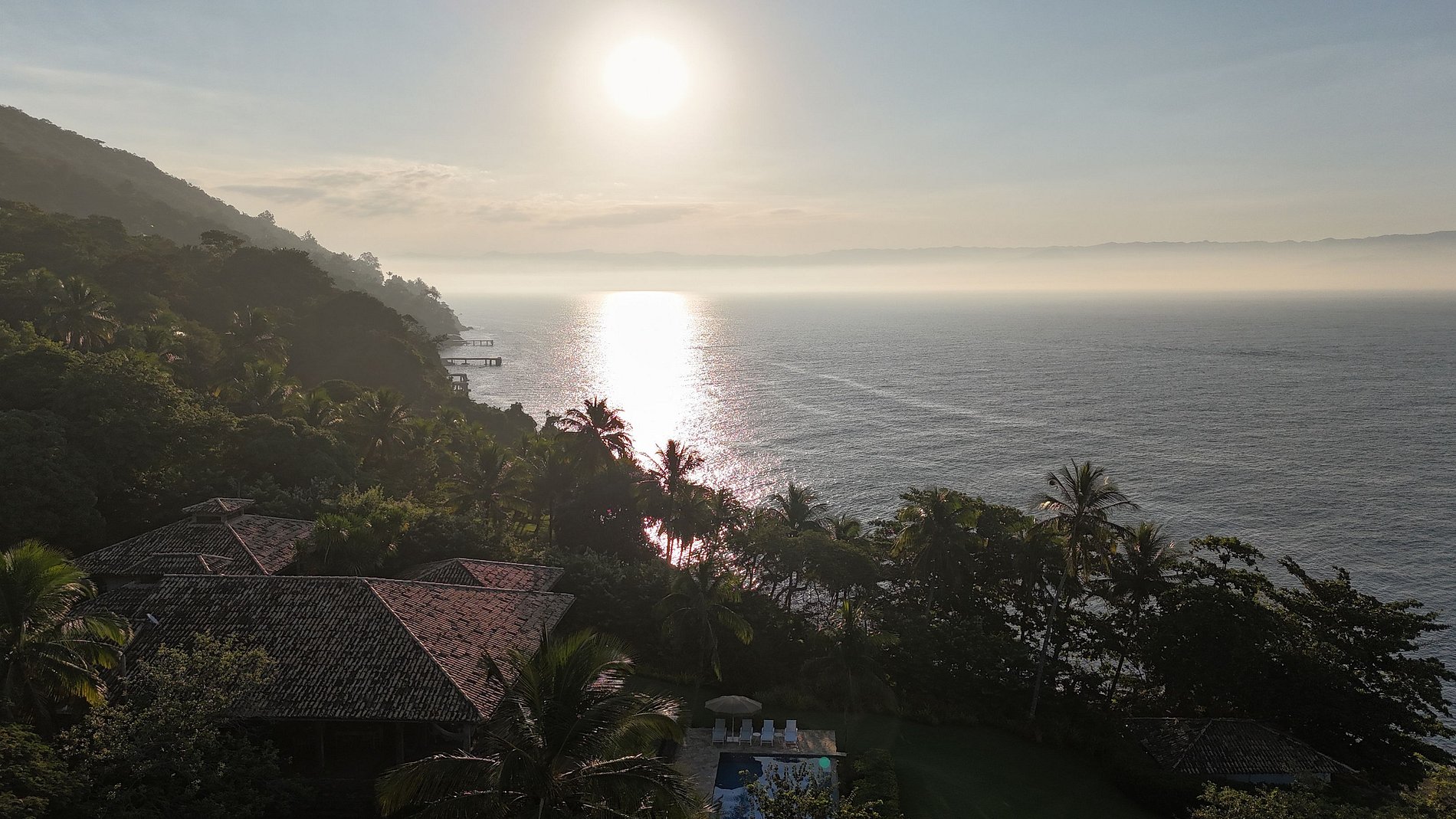 Casa costeira cinematográfica, piscina, píer e mar