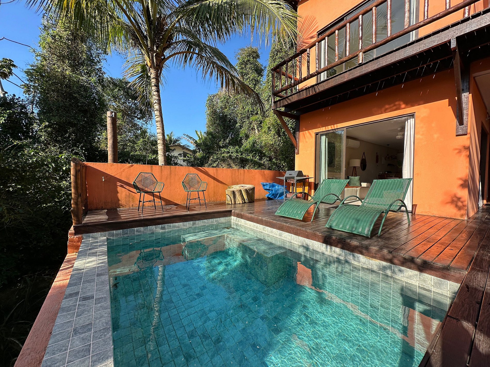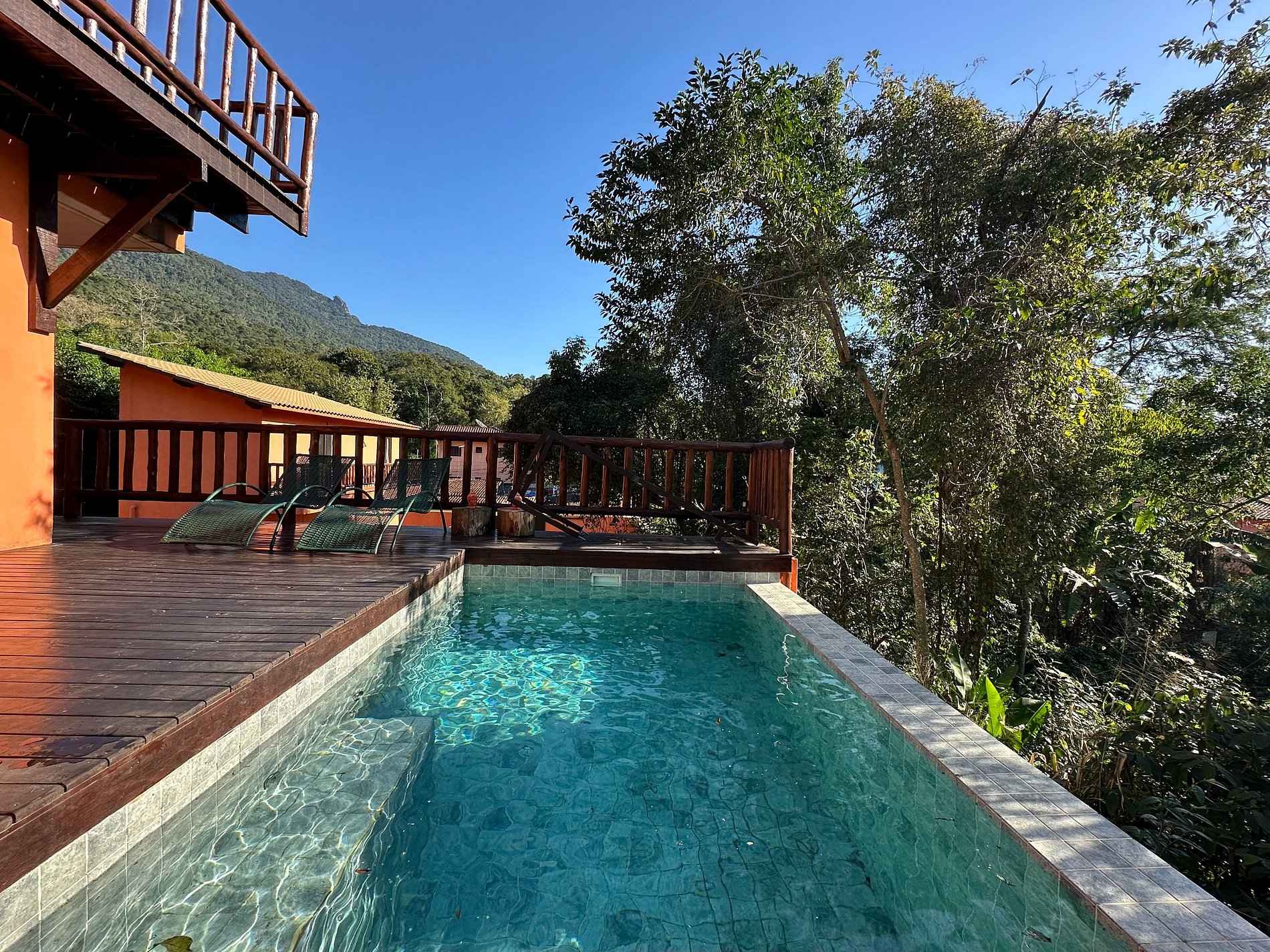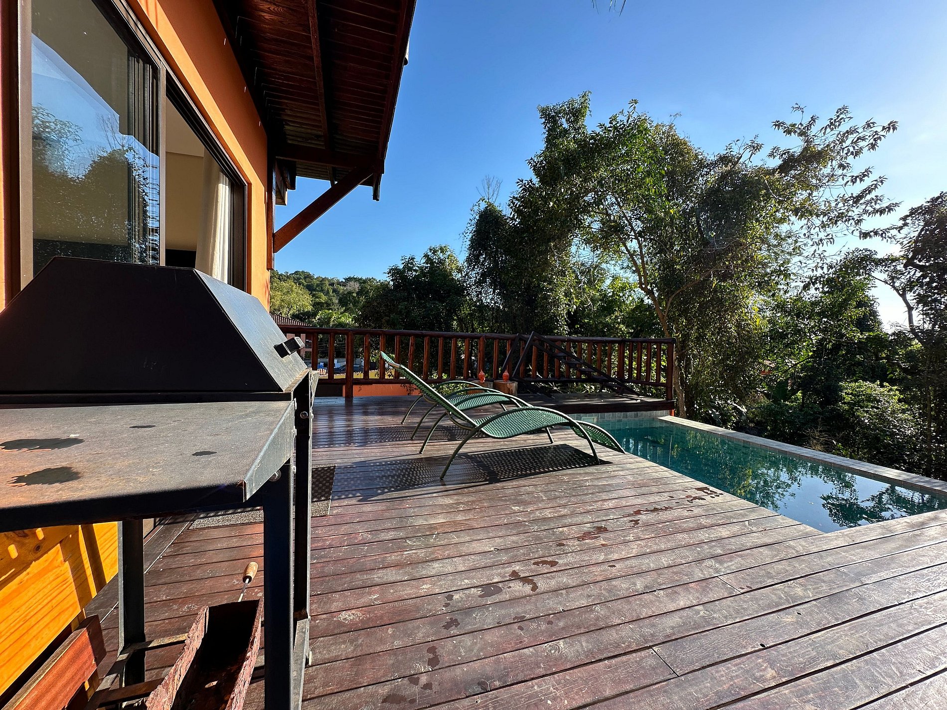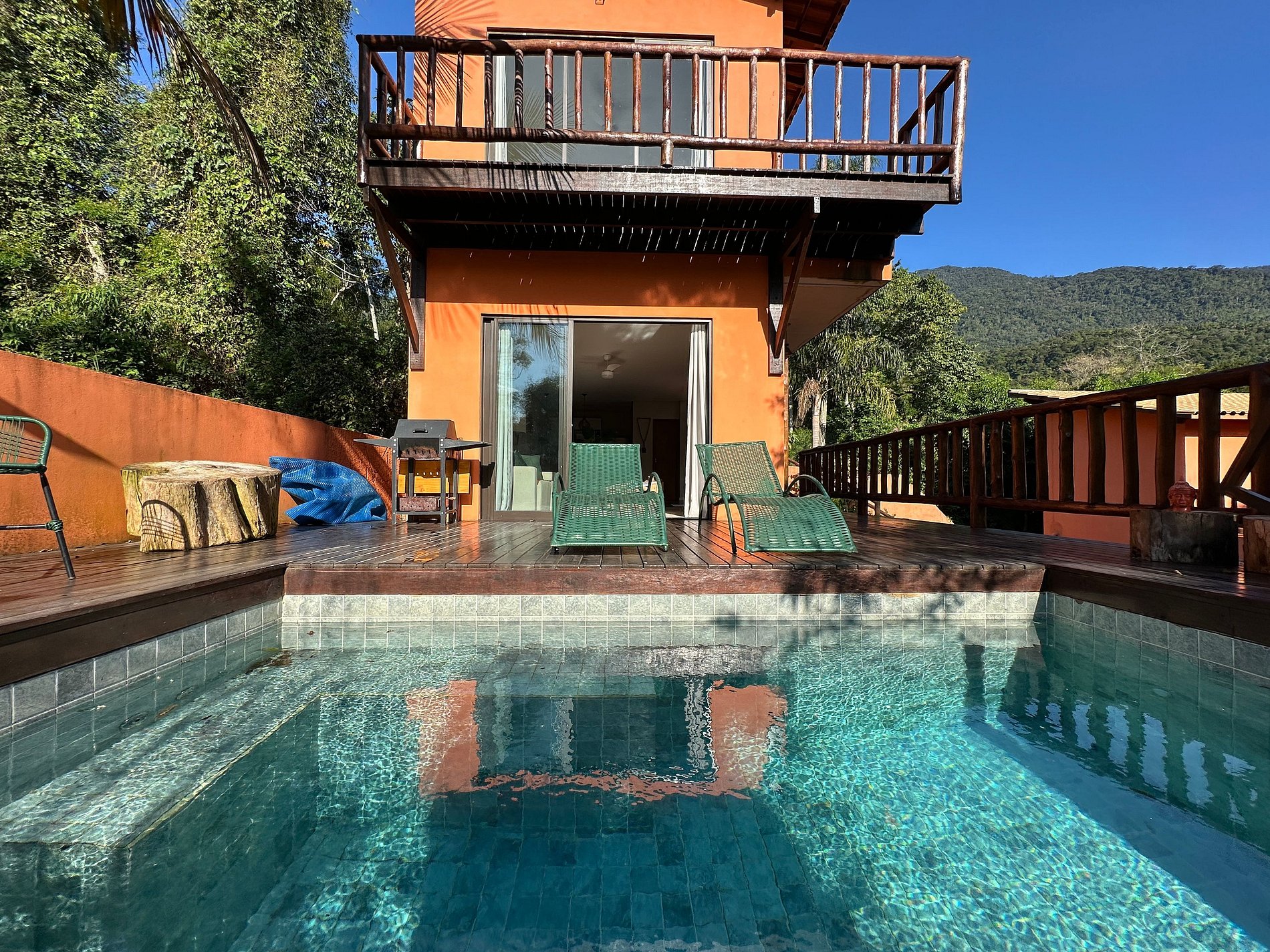 - Área externa sensacional, cercada pela mata, vista para a montanha, uma pequena piscina estilo balinesa, com móveis externos, churrasqueira portátil, deck de madeira, espreguiçadeiras, cadeiras e mesinha de apoio. Perfeito para reunir a todos, curtir o espaço e assistir ao pôr do sol;