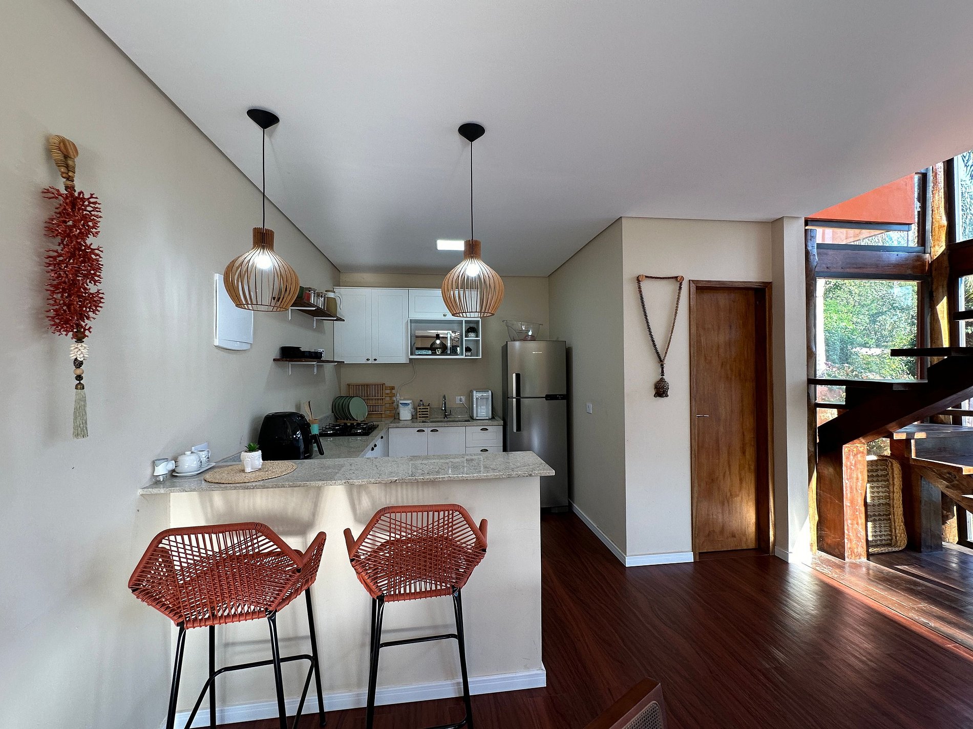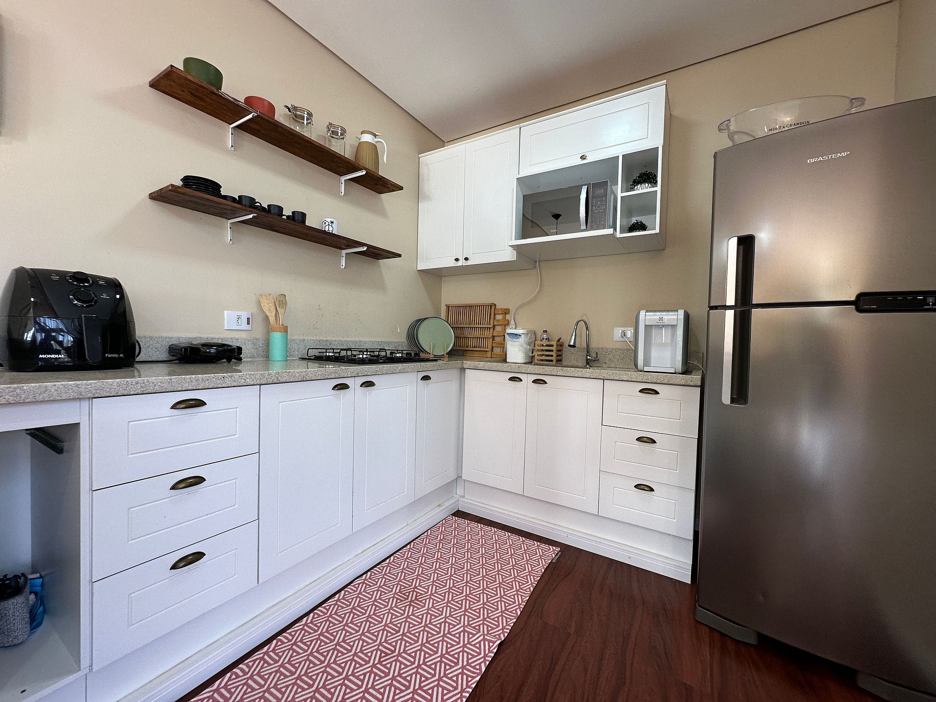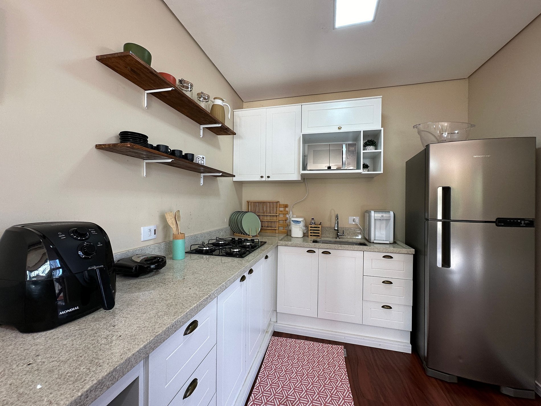 - Itens da cozinha: fogão, forno, geladeira com freezer, micro-ondas, liquidificador, torradeira, Airfryer, louças, talheres, panelas e demais utensílios necessários para uma boa estadia;