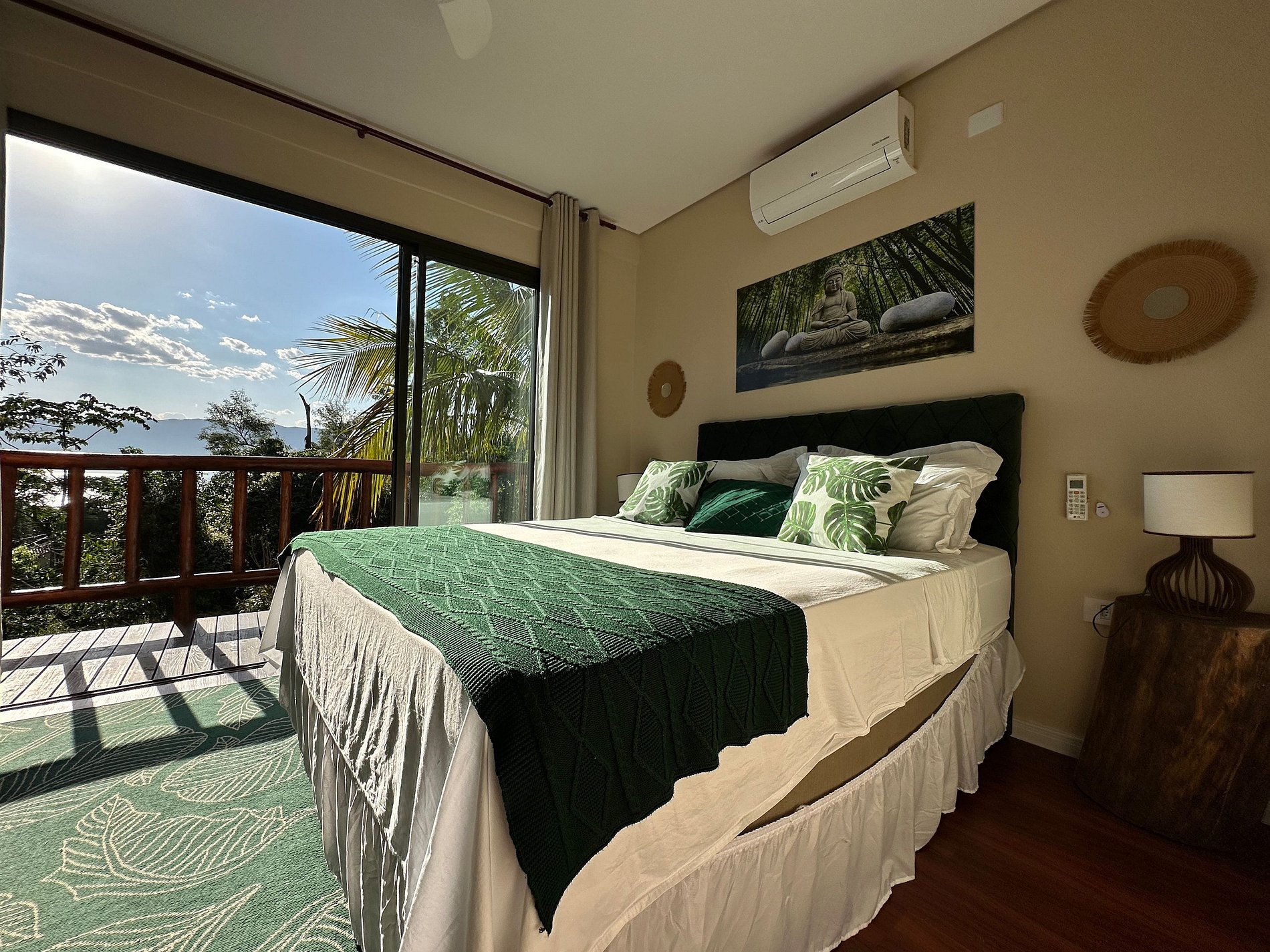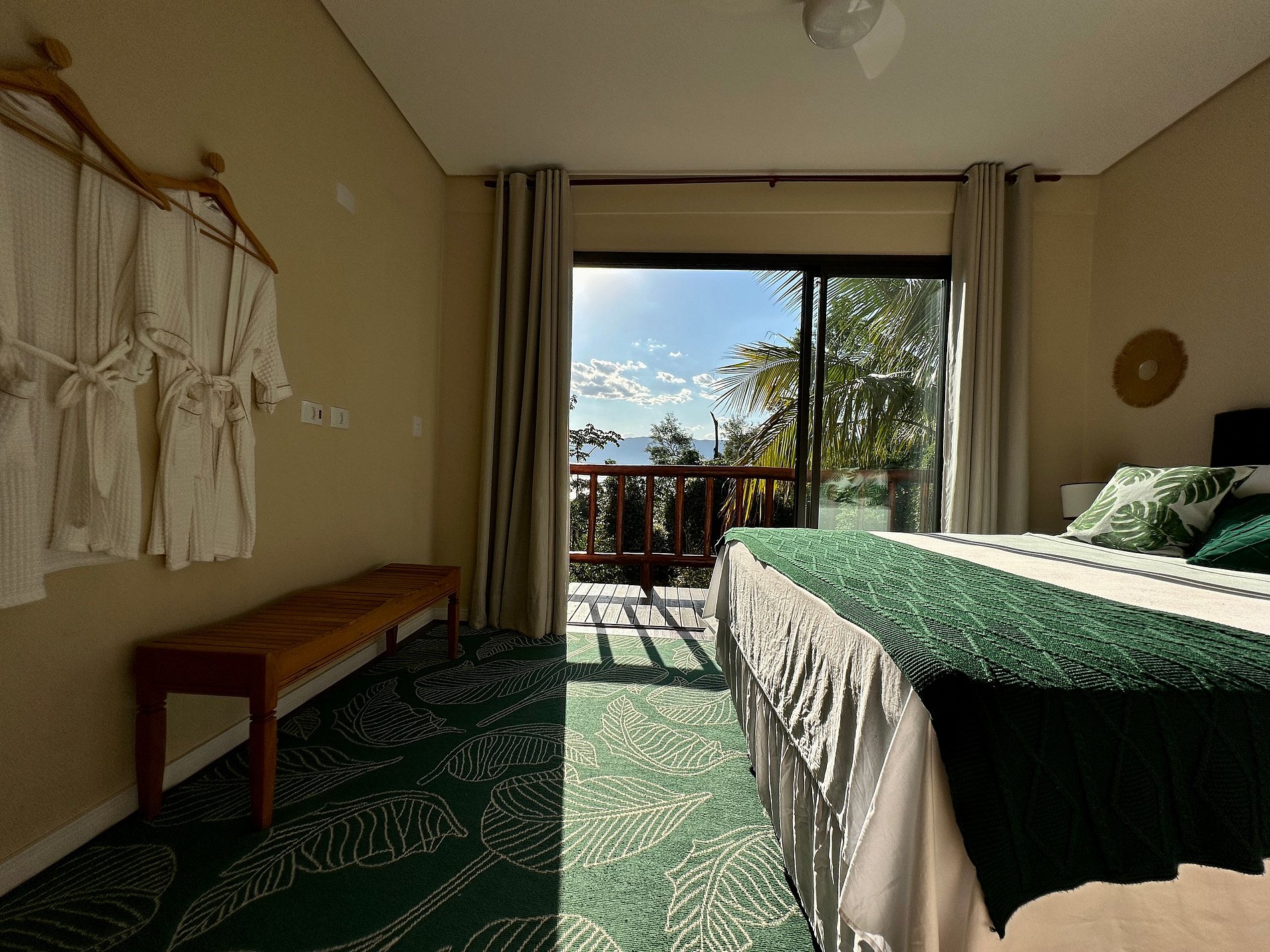 Suíte 1 - 1 cama de casal queen, varanda com vista para montanha e área da piscina;