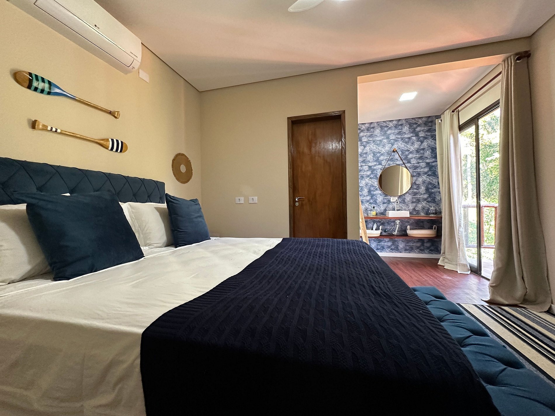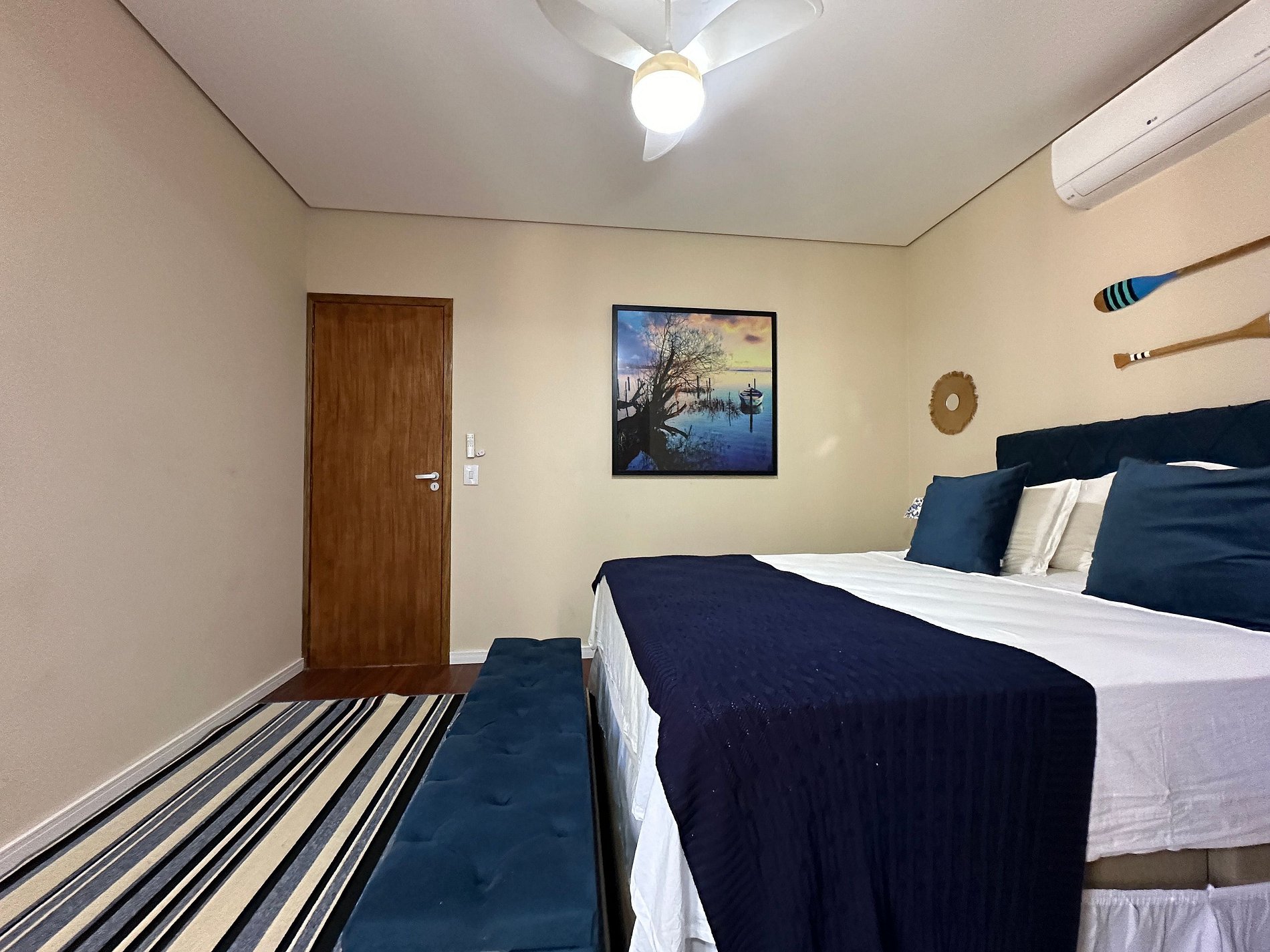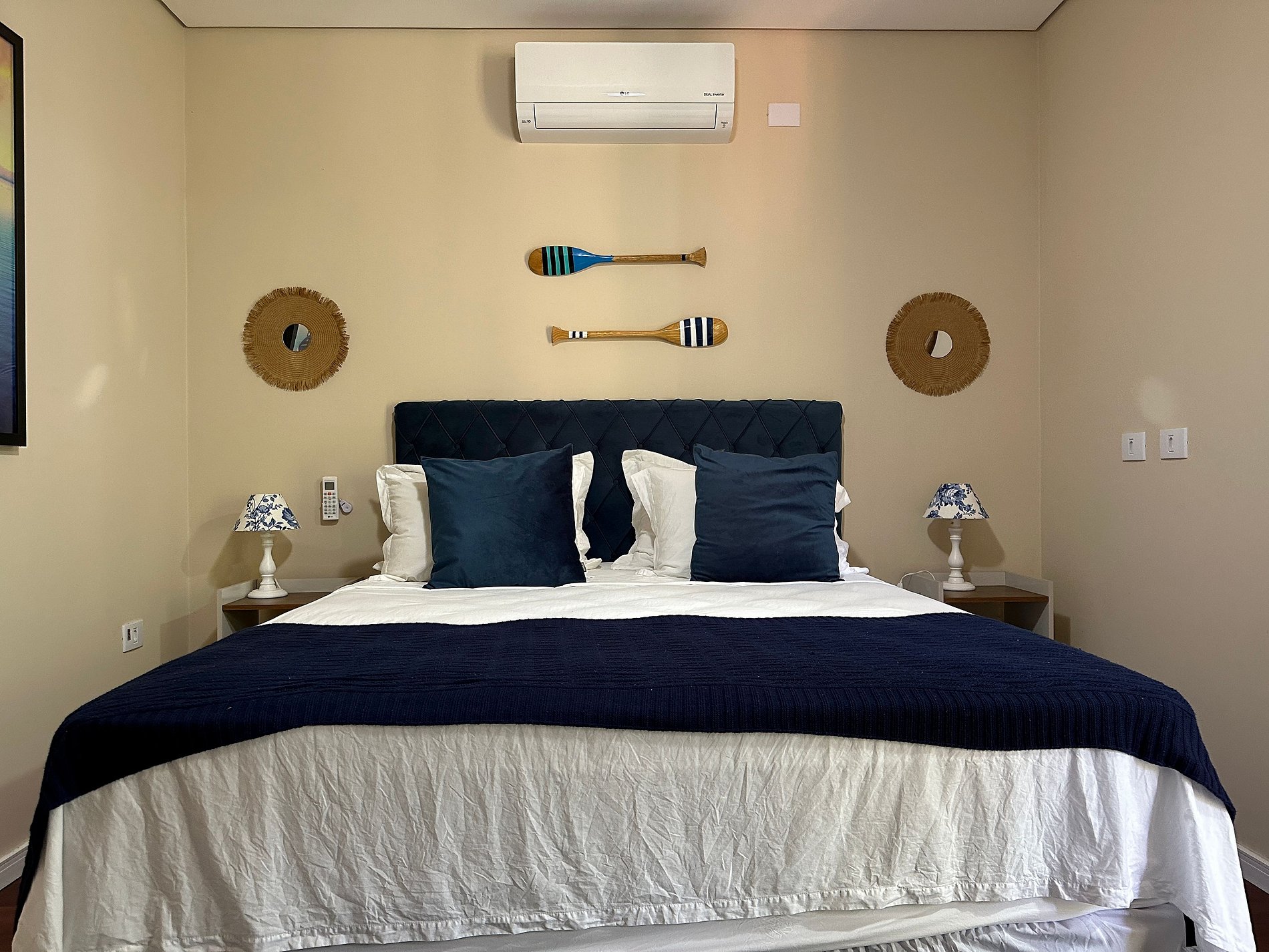 São 2 suítes, ambas com ar-condicionado, enxoval completo e secador de cabelo, na seguinte configuração: