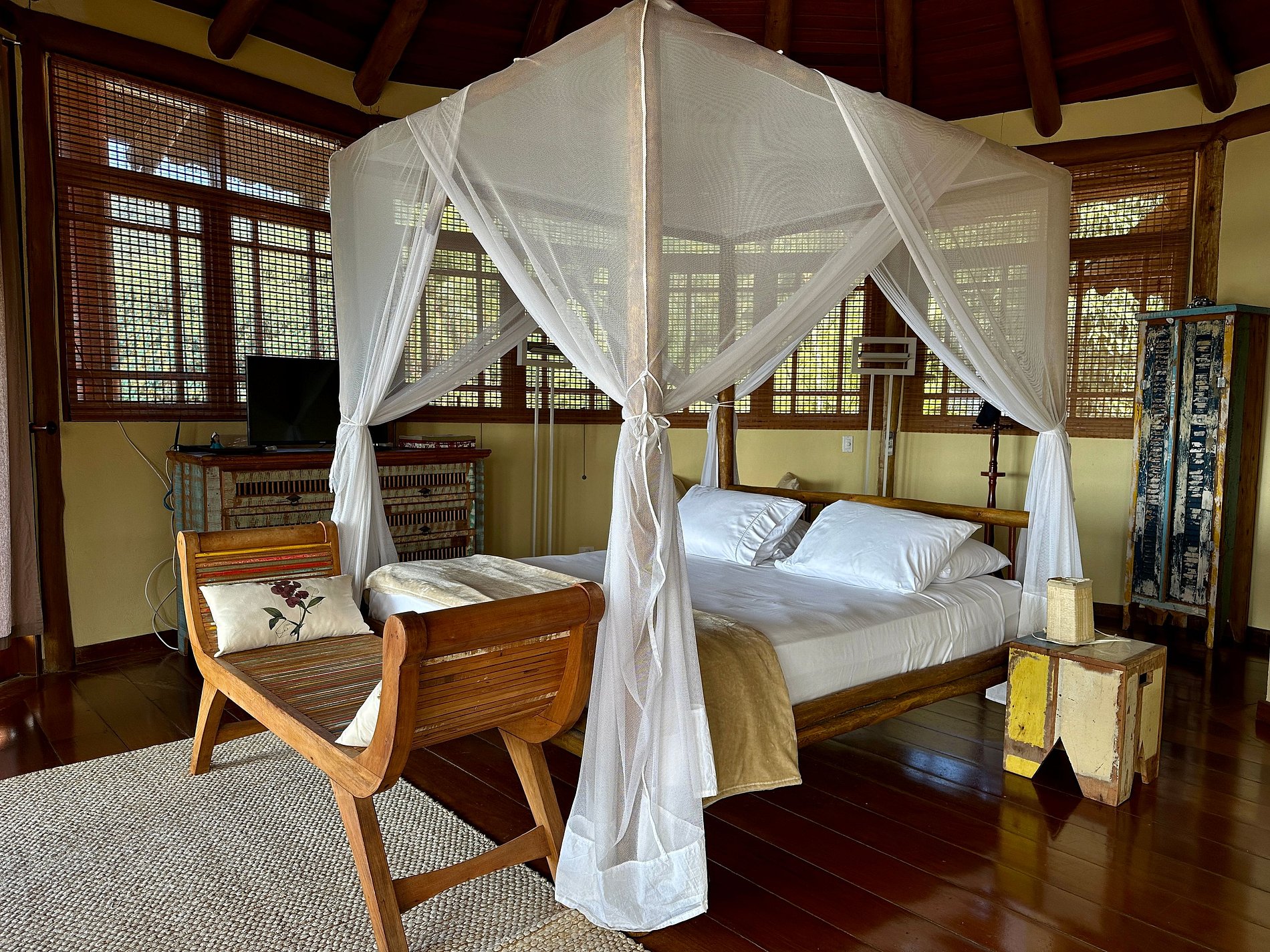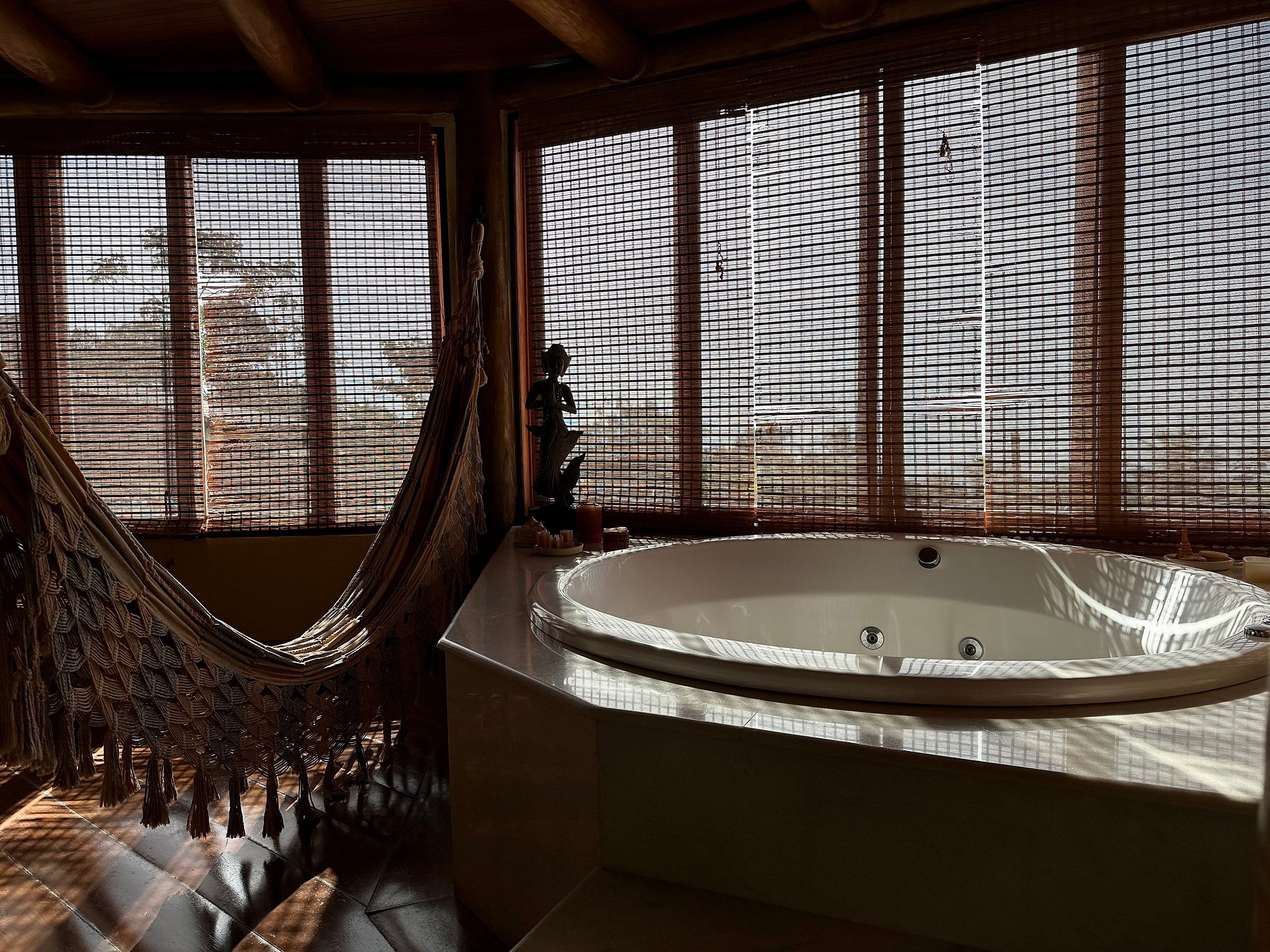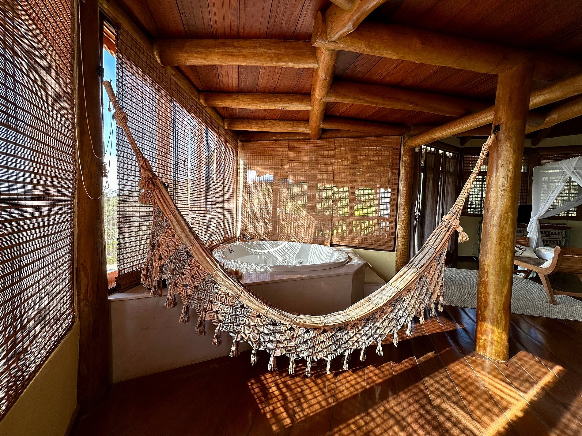 Suíte interna 1 - 1 cama de casal queen dossel, Smart TV, banheira de hidromassagem, mezanino com espaço home office e varanda;