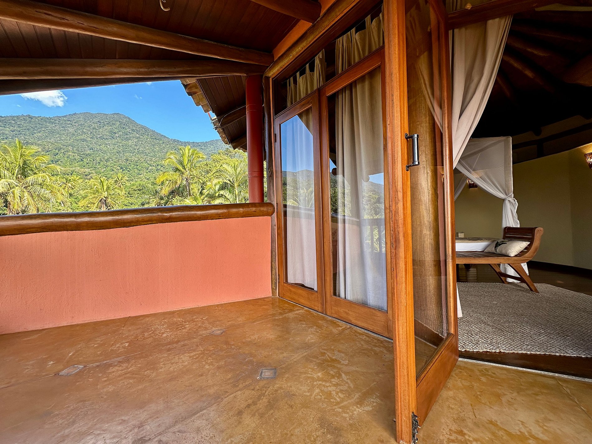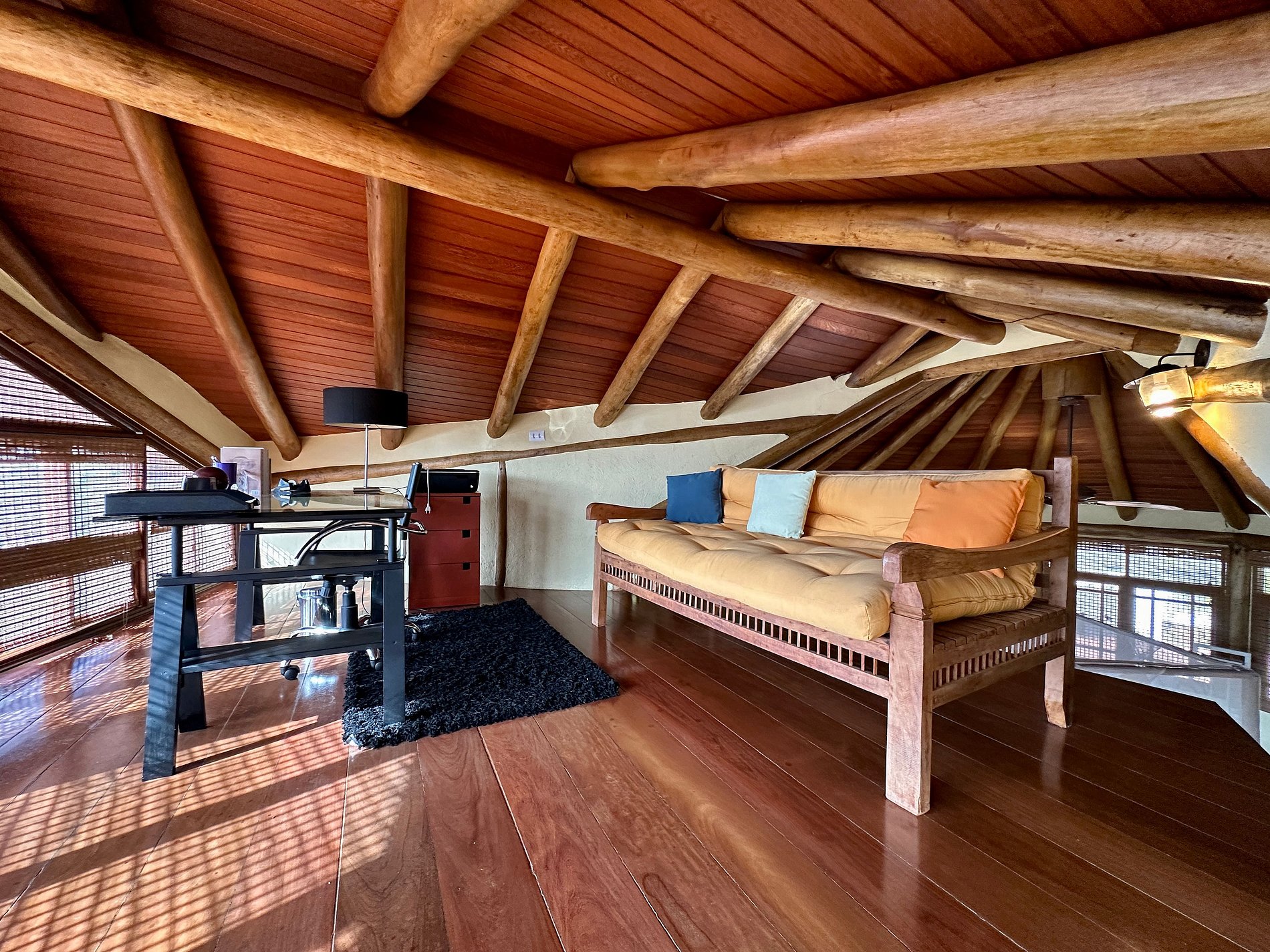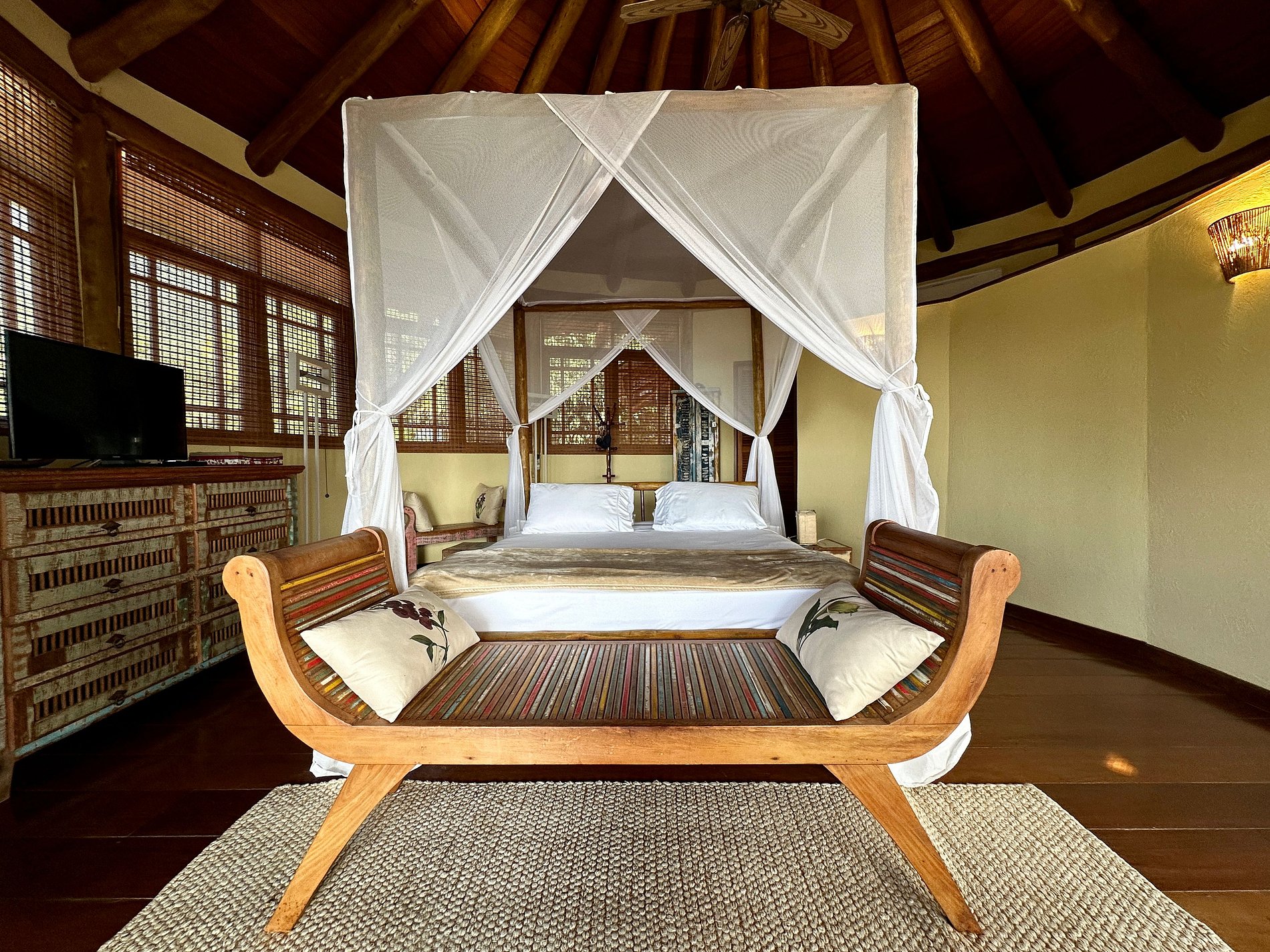 Suíte interna 1 - 1 cama de casal queen dossel, Smart TV, banheira de hidromassagem, mezanino com espaço home office e varanda;