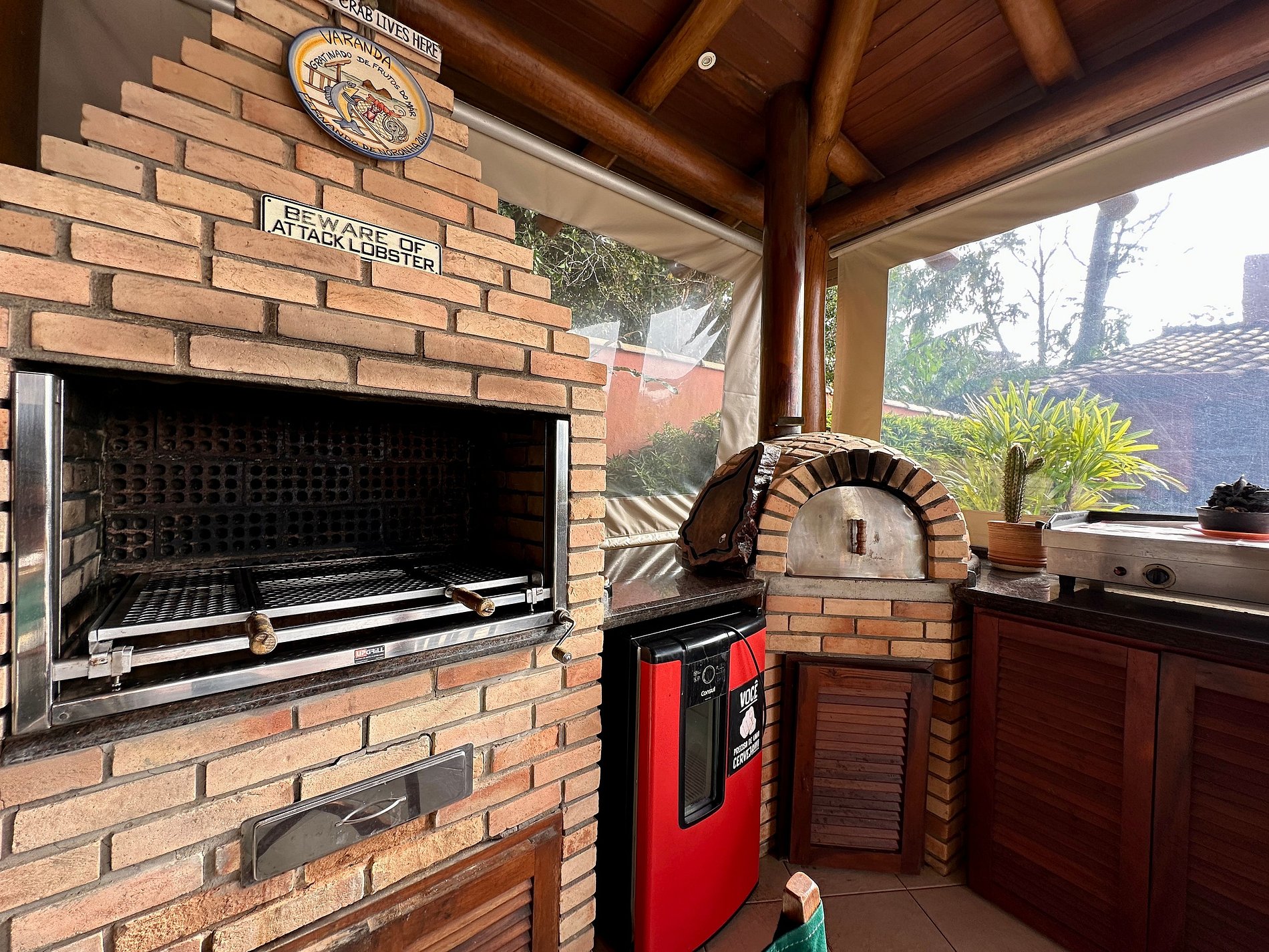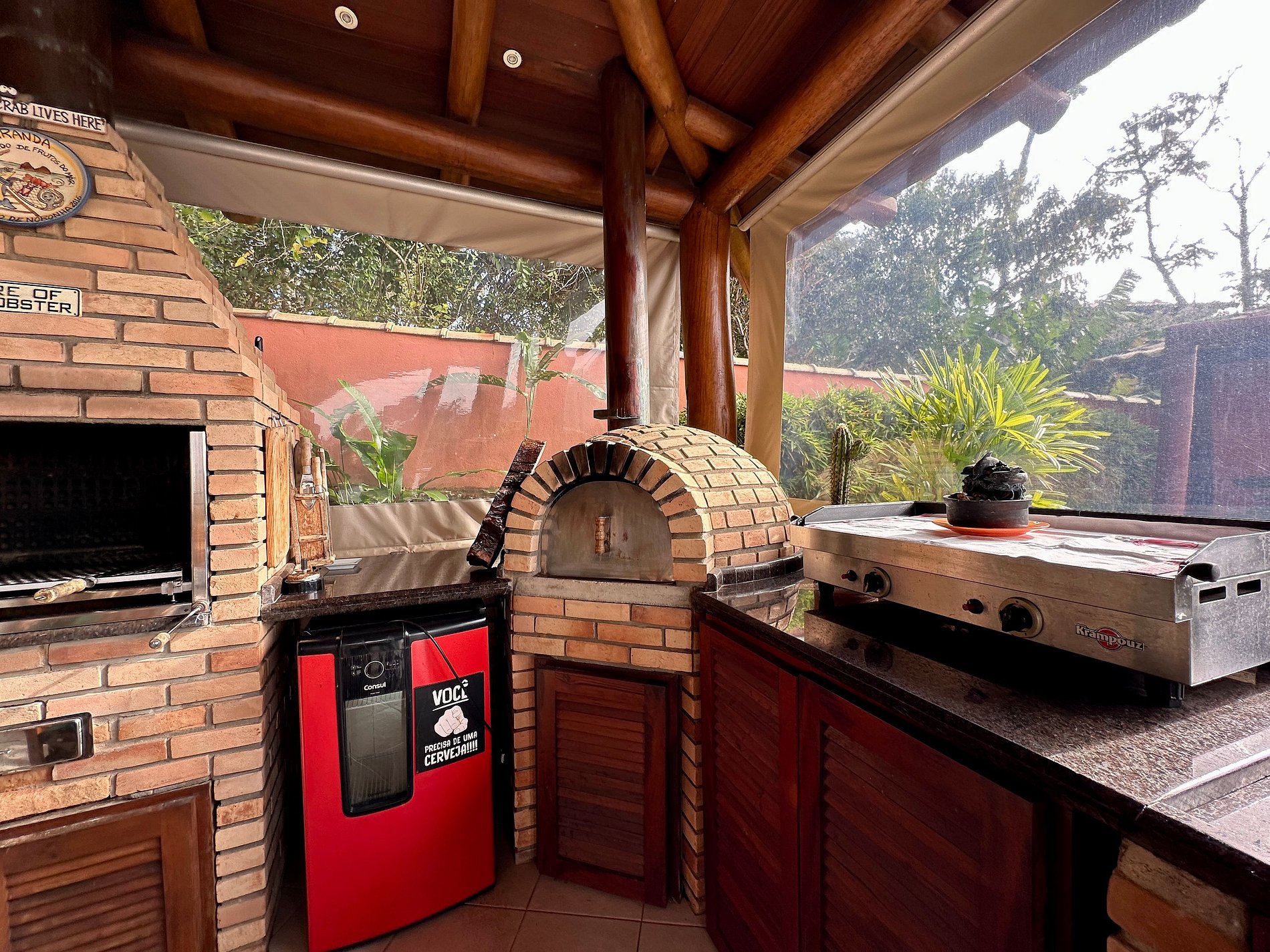 - A área gourmet é coberta e conta com churrasqueira, forno de pizza, forno a lenha, chapa, mesa para refeições e cervejeira;