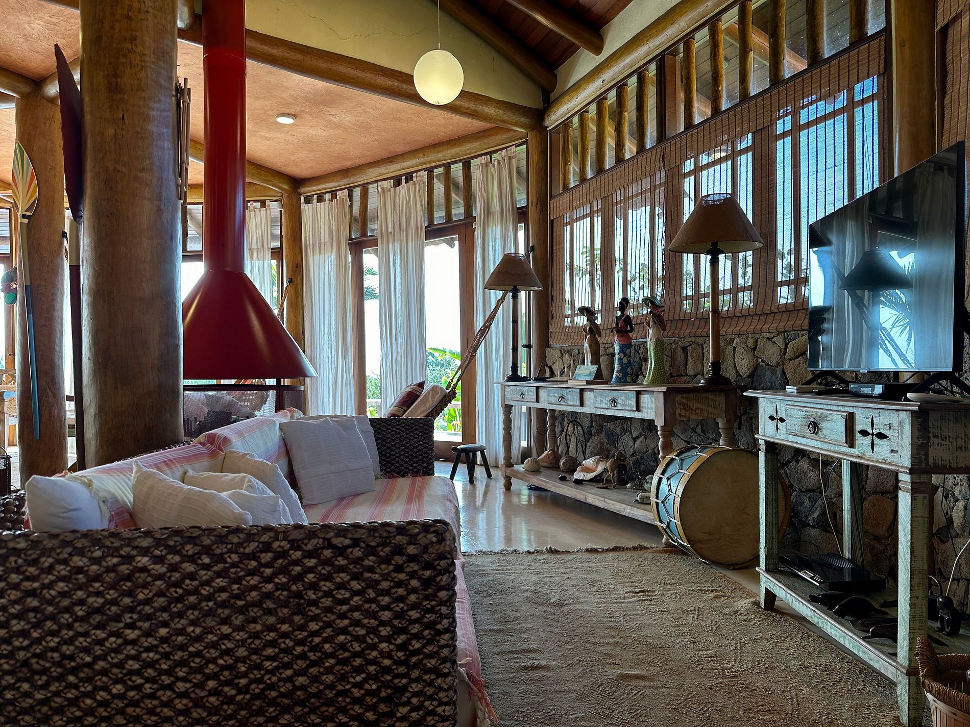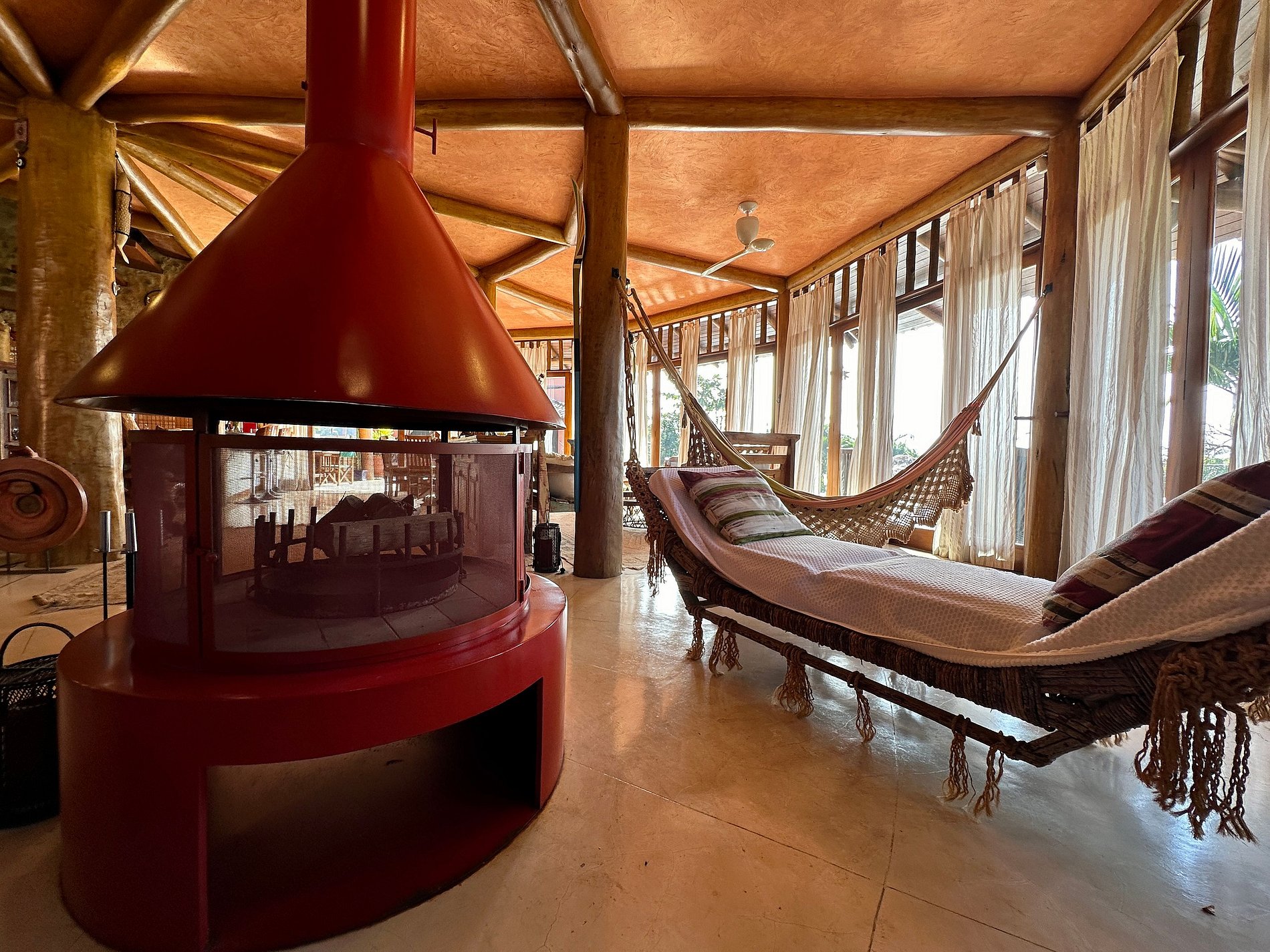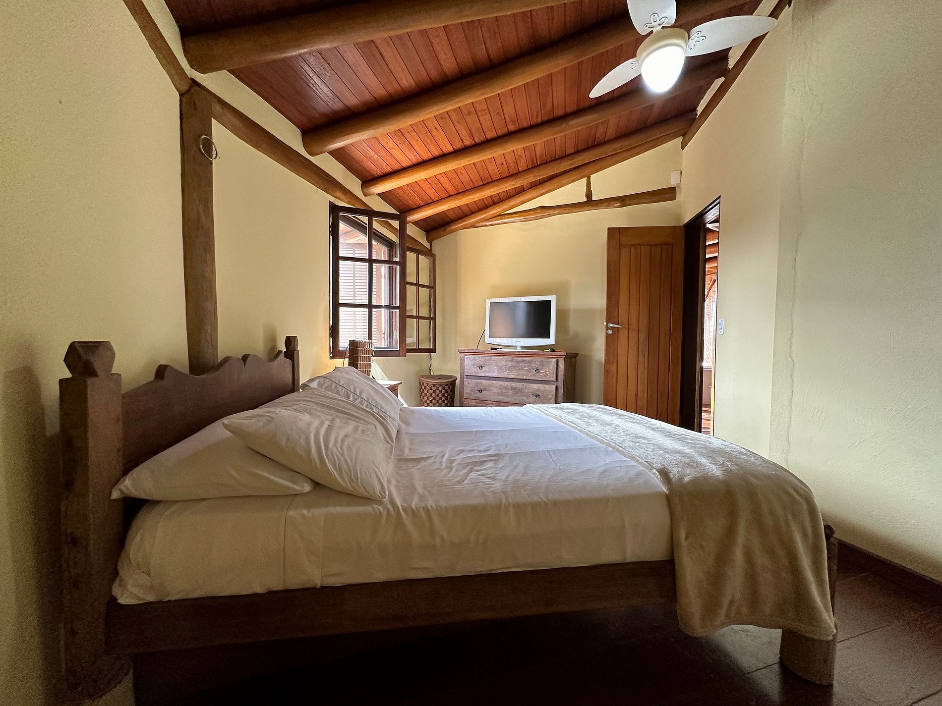 - Ambiente interno com sala ampla e arejada, com claridade natural por todo o espaço, além de lavabo, lareira, decoração rústica e uma Smart TV com acesso a canais a cabo e que permite uso de streamings;