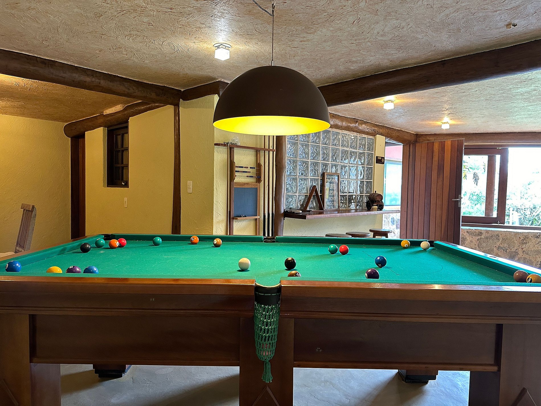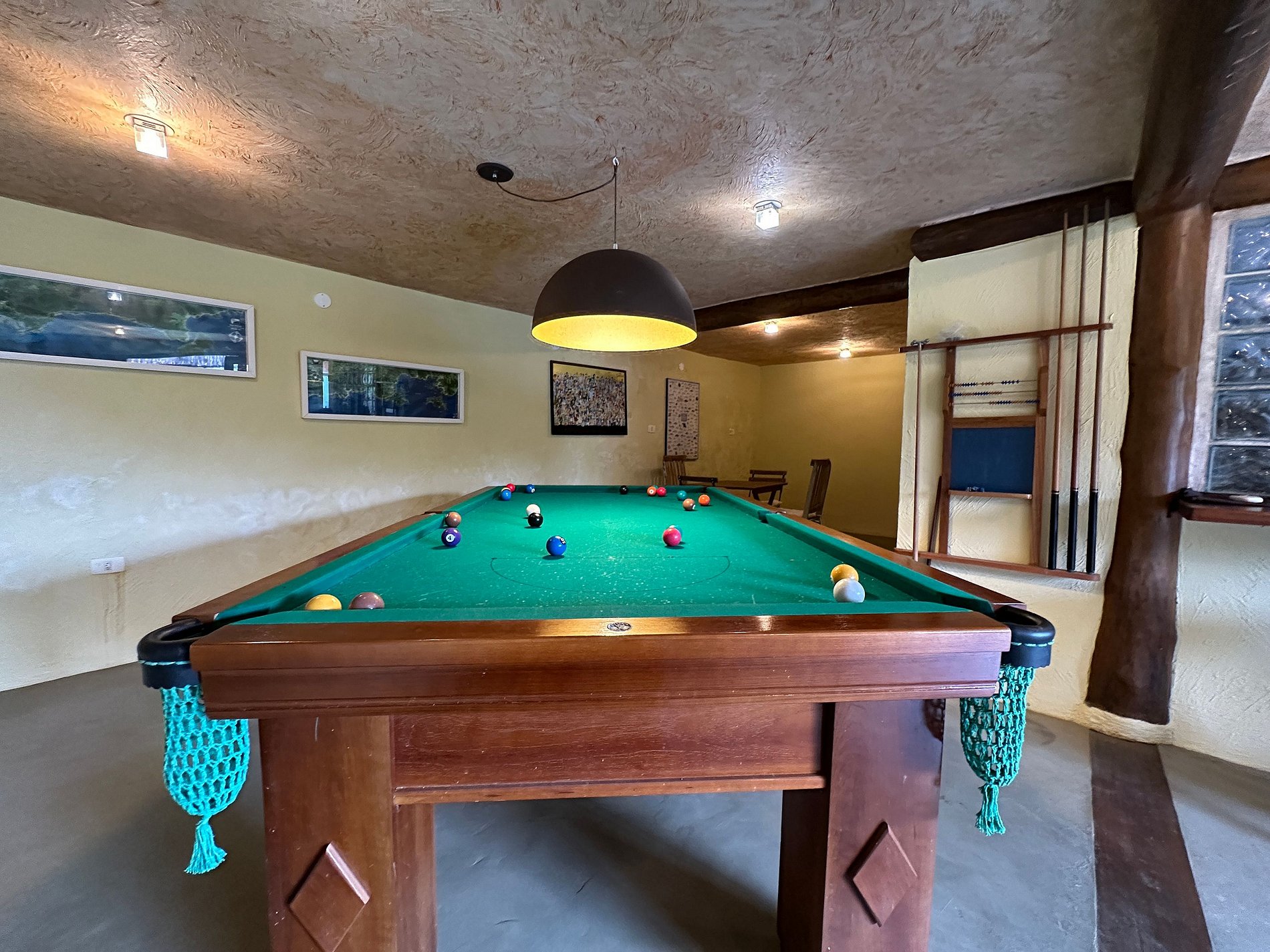- Sala de jogos com mesa de sinuca, mesa para carteado e espaço para as crianças, ambiente com ar-condicionado;