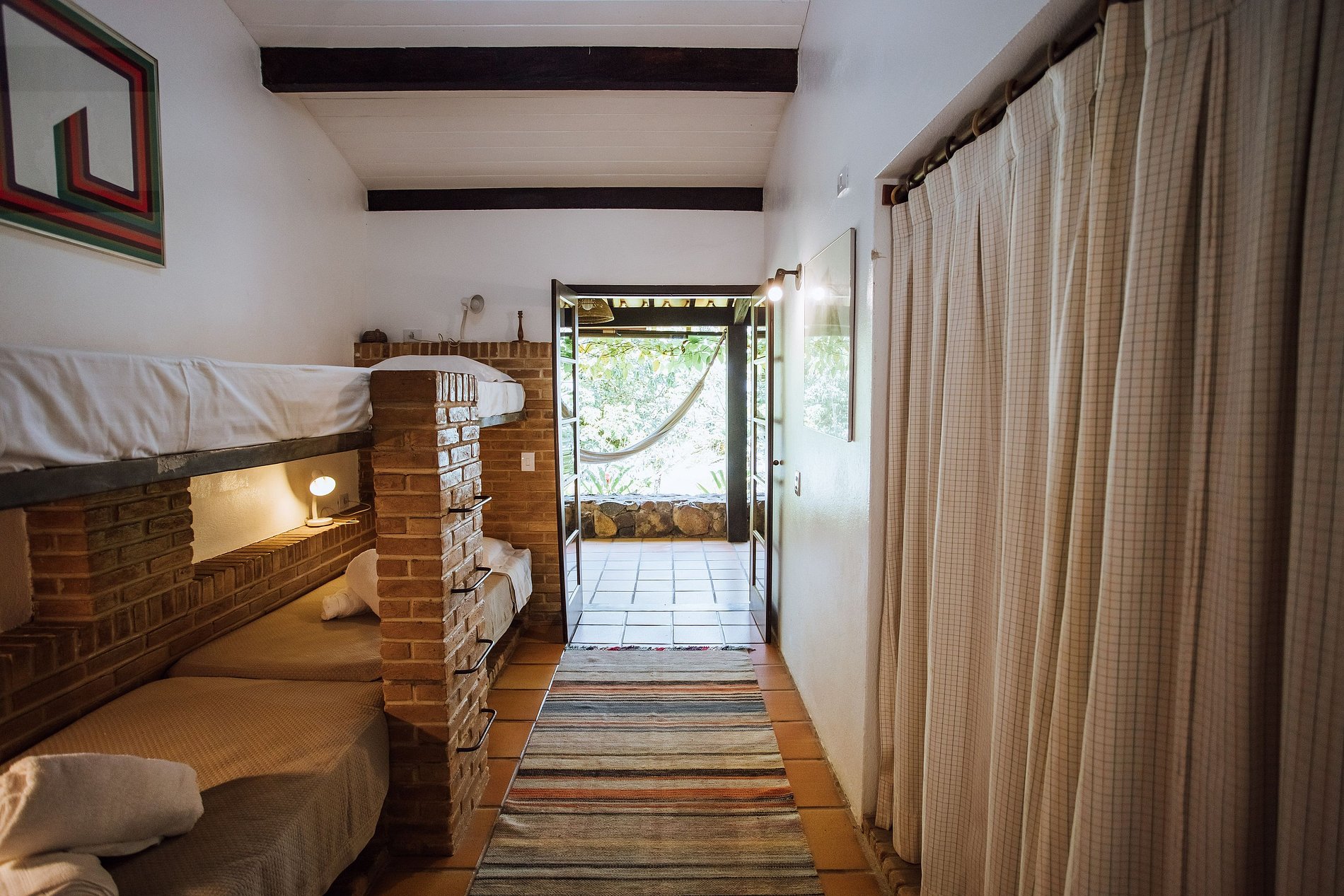 Suíte 4 - 2 beliches, guarda-roupa e acesso à varanda com vista para o jardim.