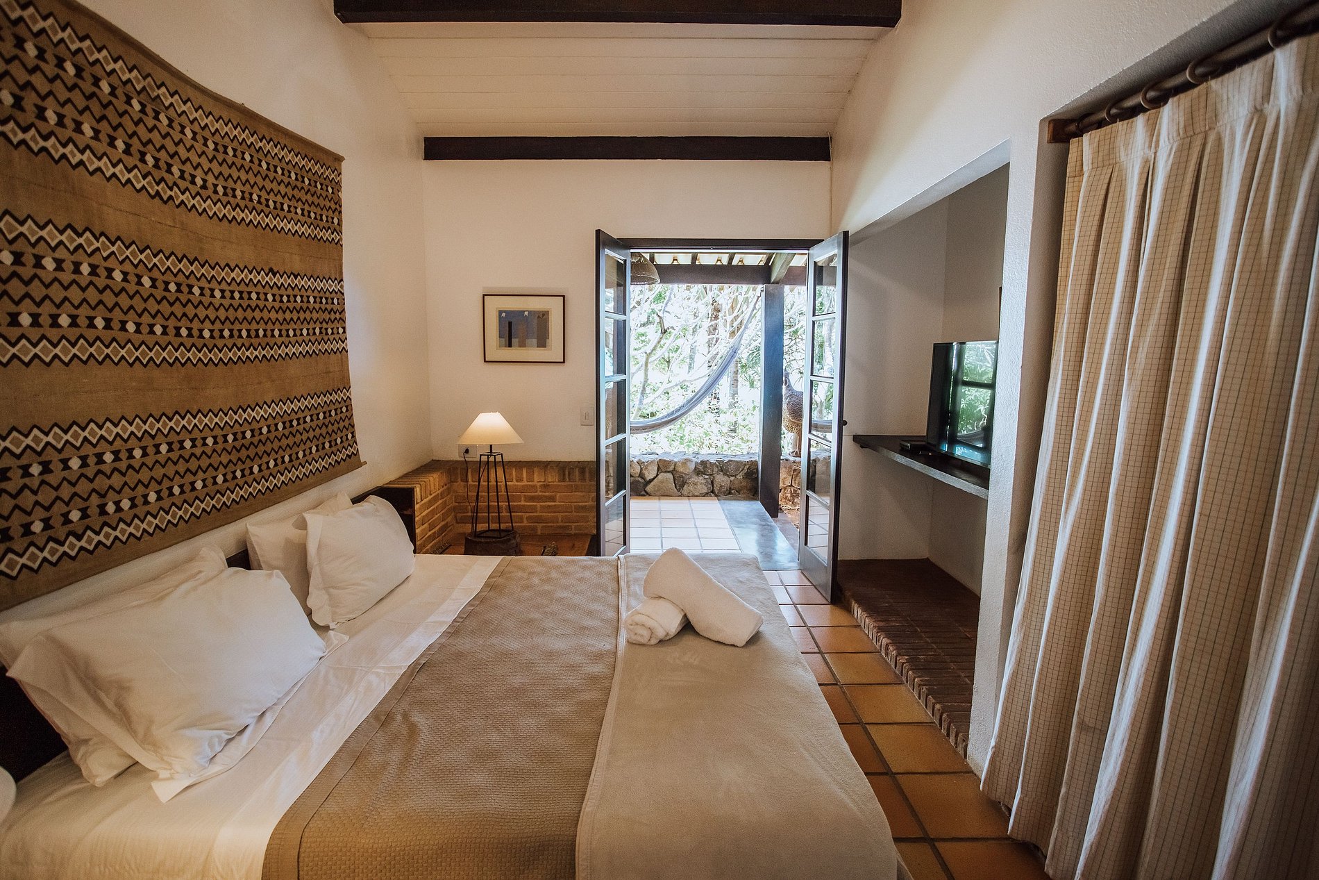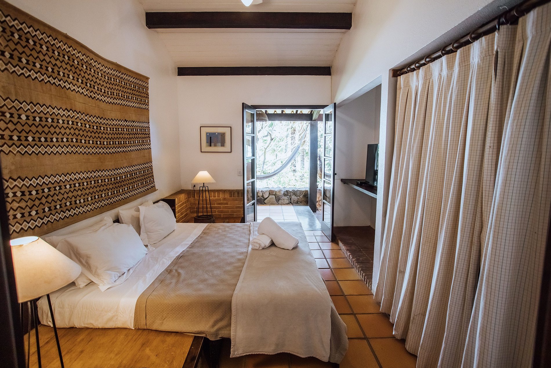 Suíte 1 - 1 cama de casal, guarda-roupa, TV e acesso à varanda com vista para o jardim;