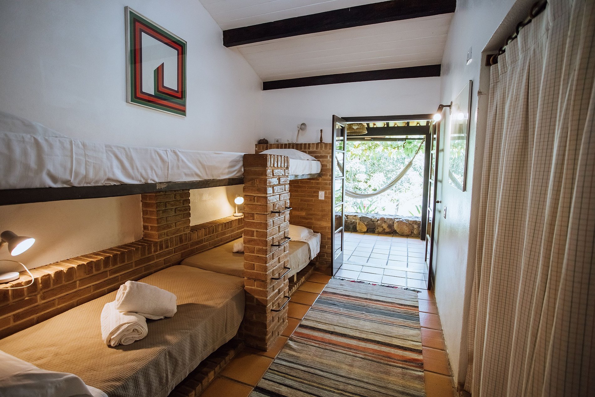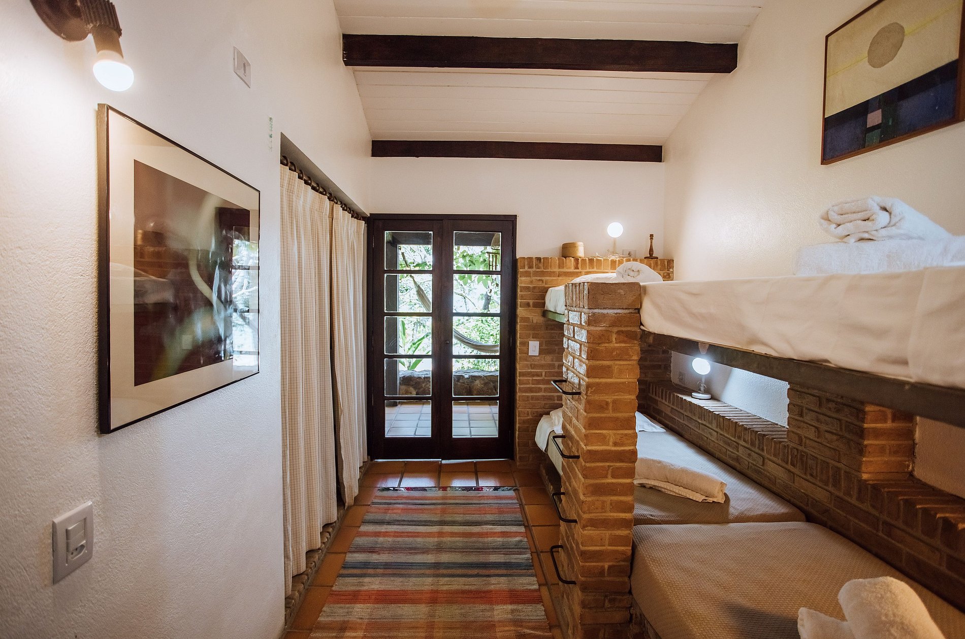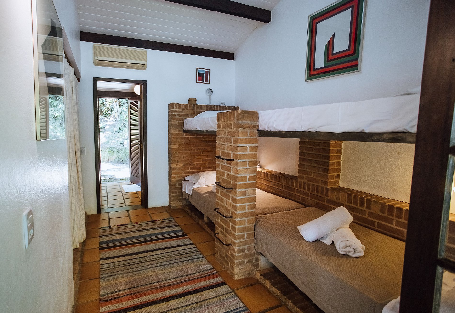 Suíte 4 - 2 beliches, guarda-roupa e acesso à varanda com vista para o jardim.