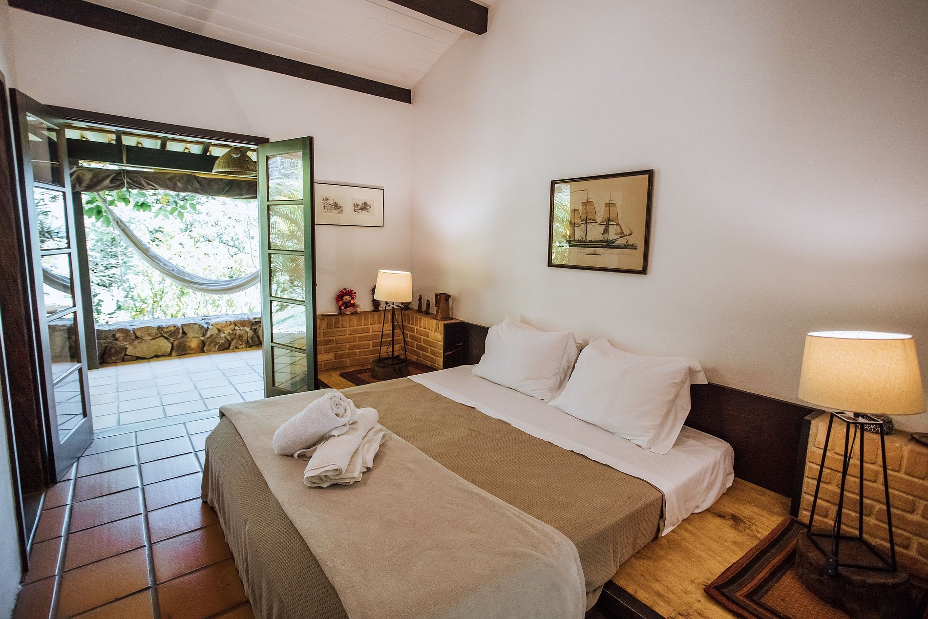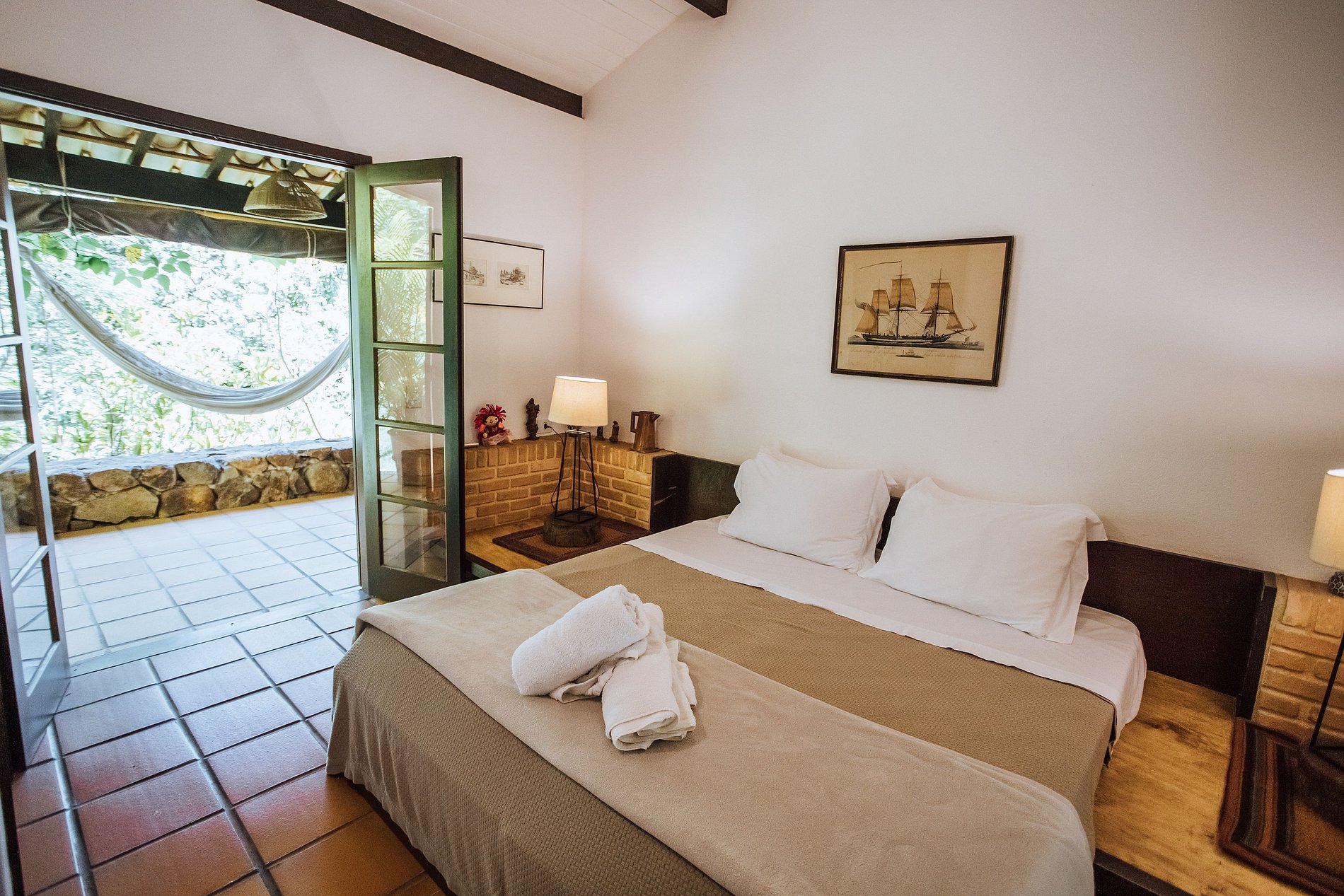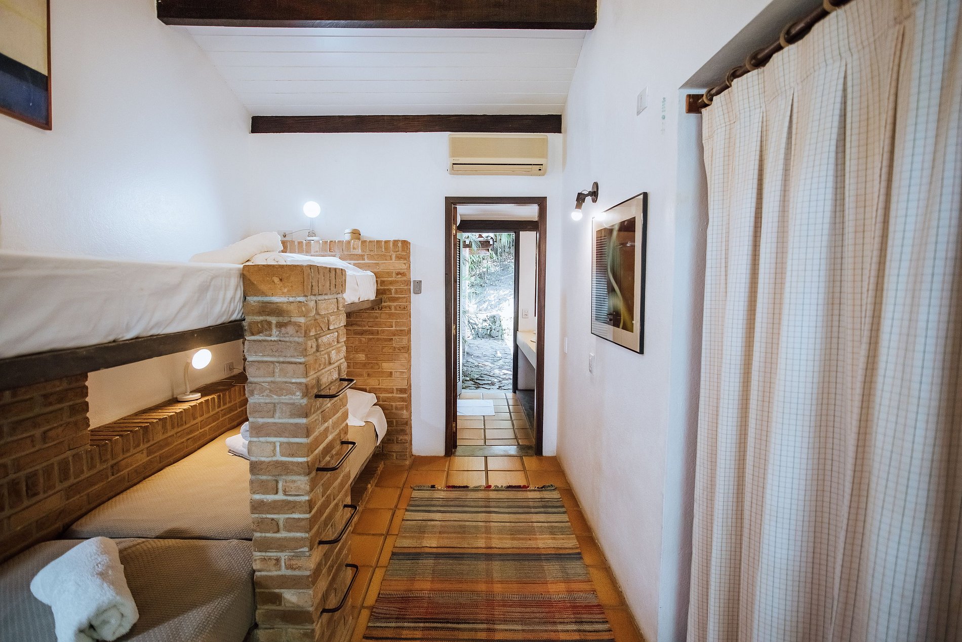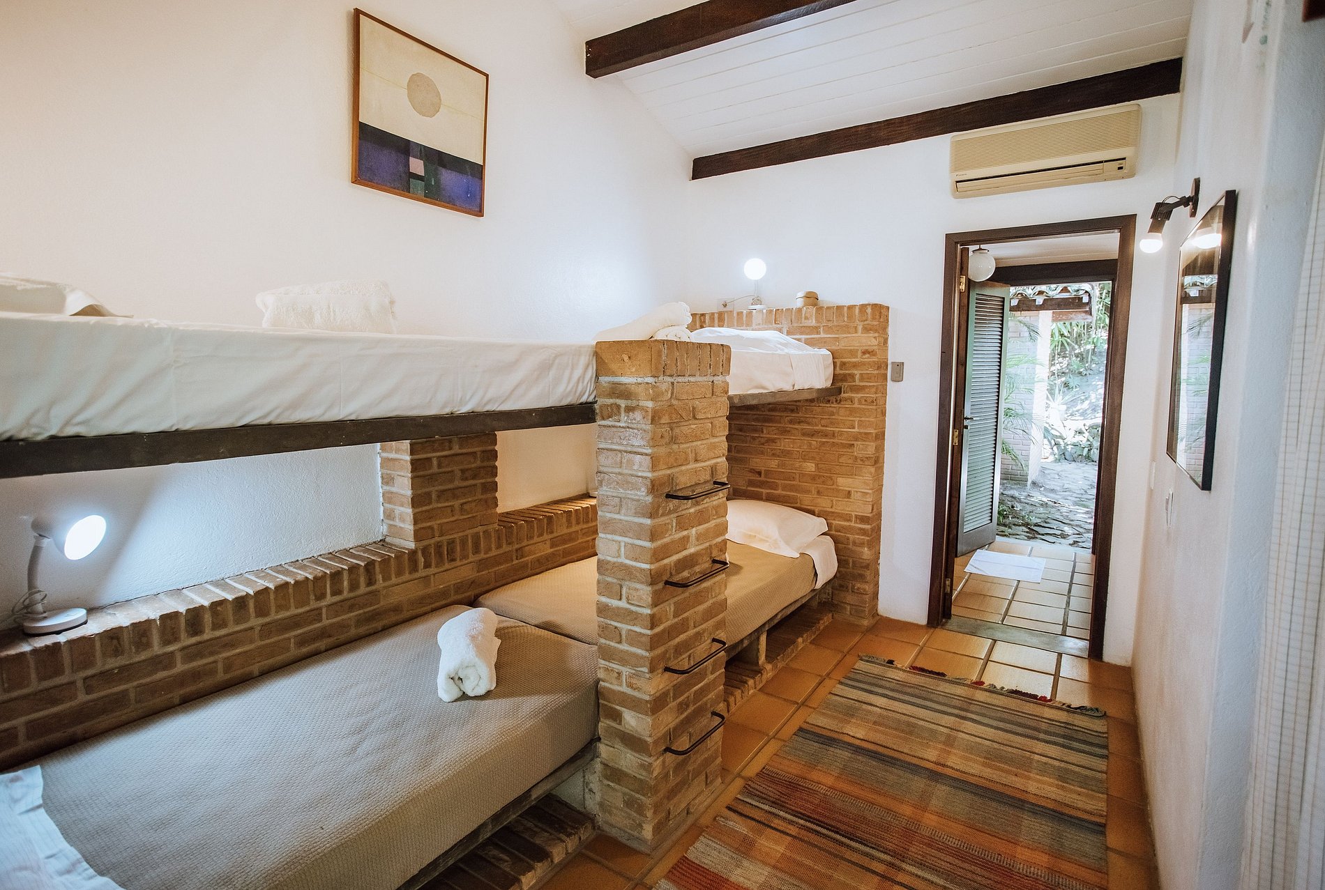 Suíte 4 - 2 beliches, guarda-roupa e acesso à varanda com vista para o jardim.