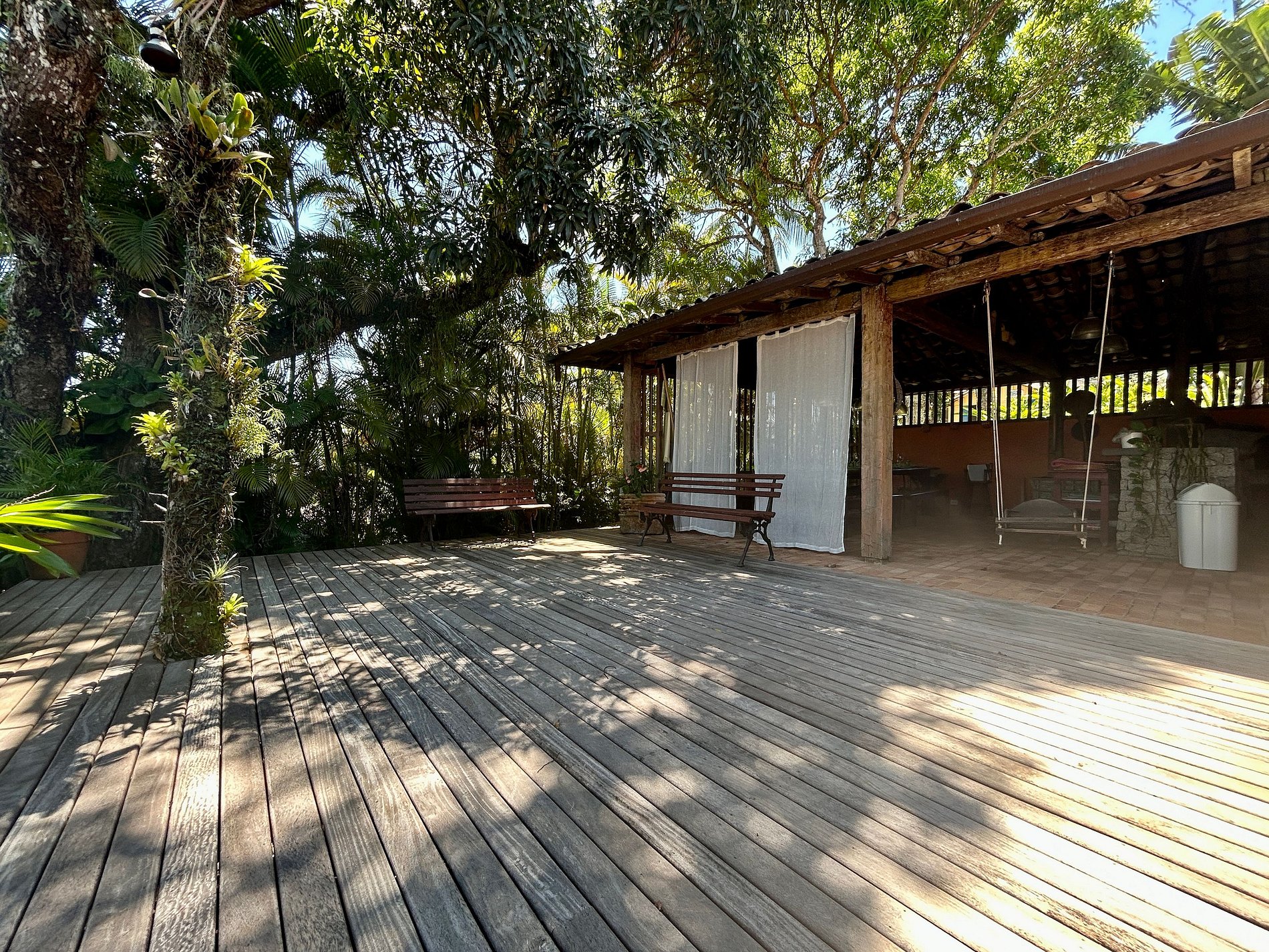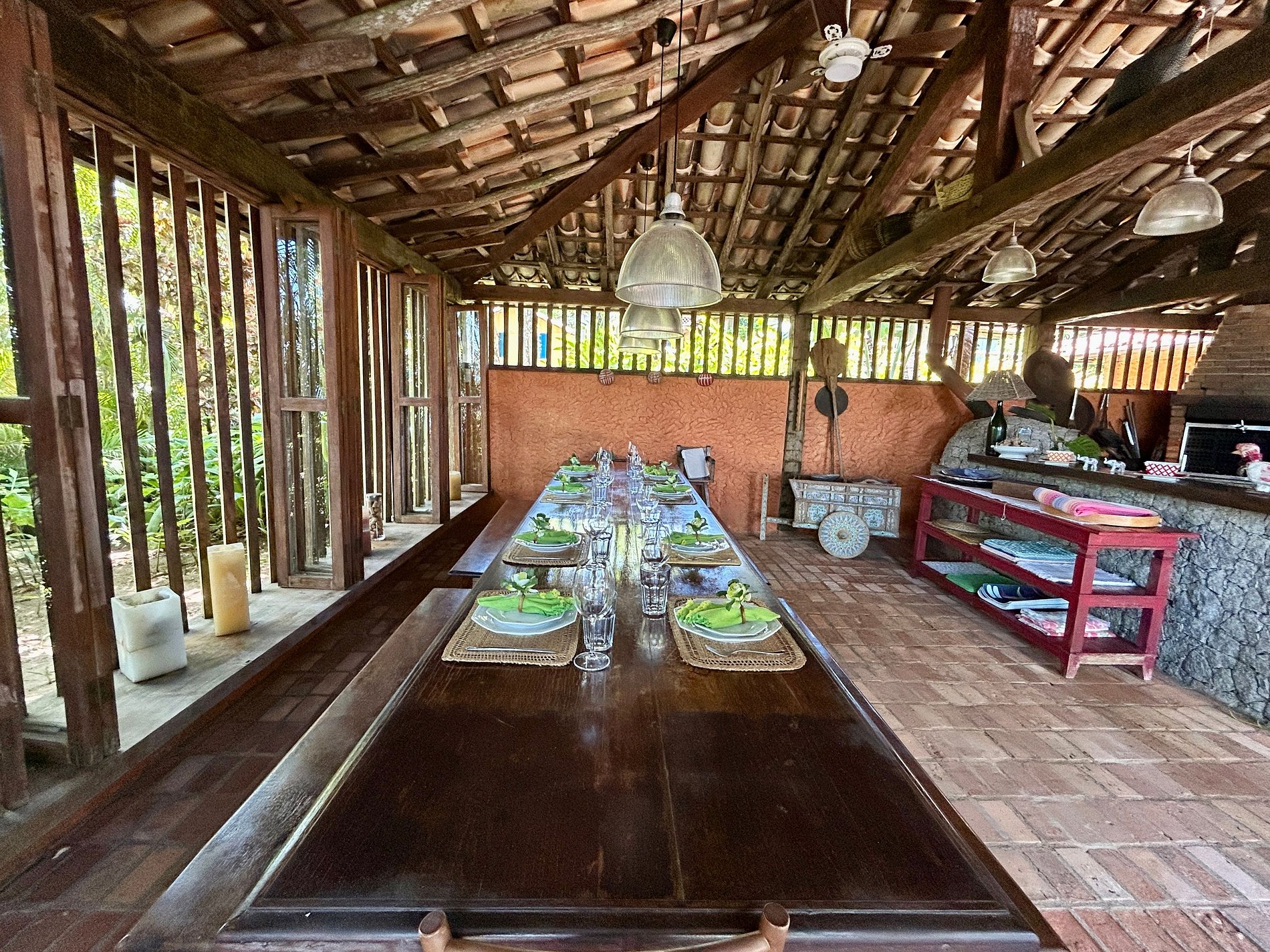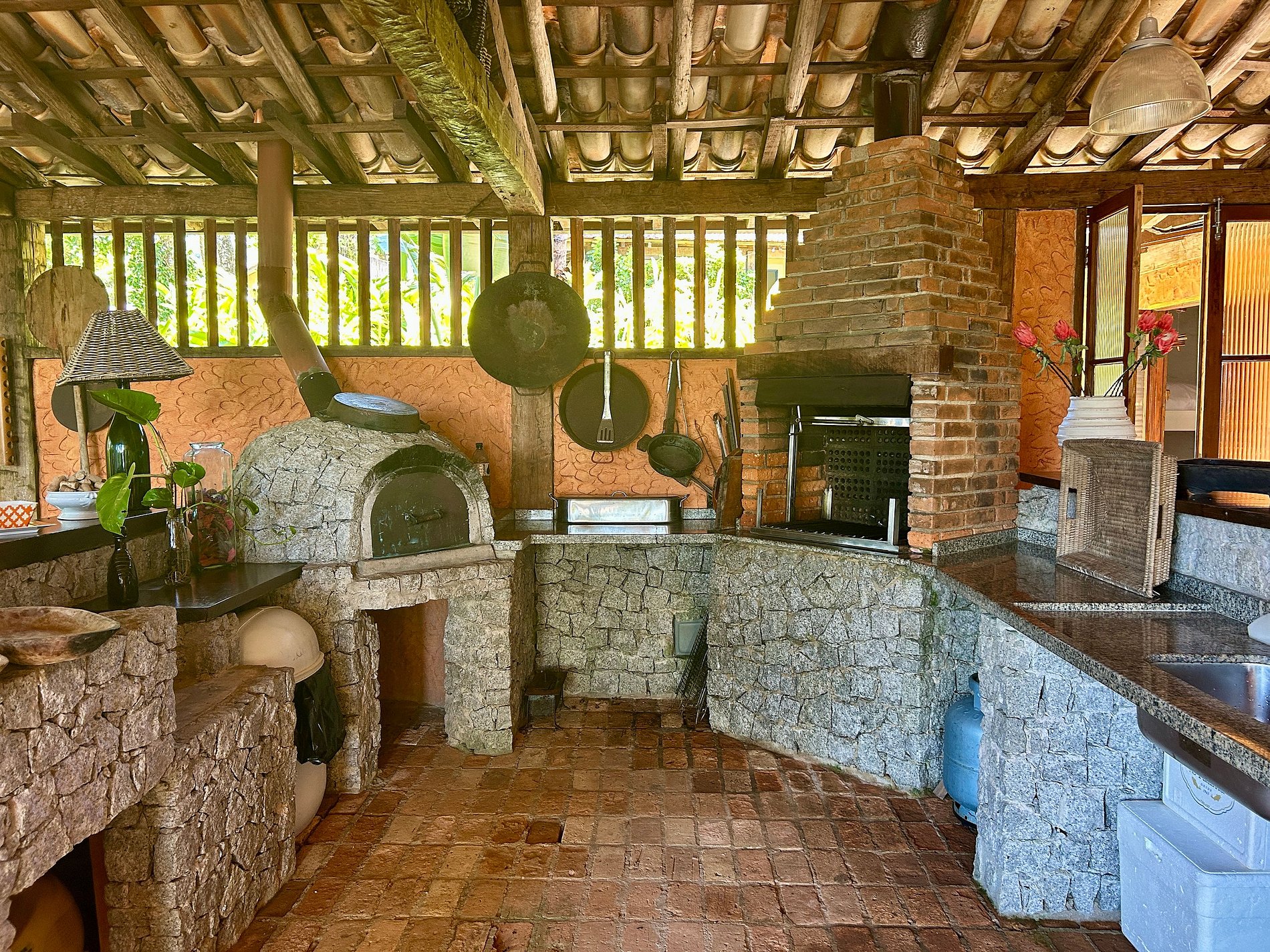 - Área externa sensacional, amplas varandas mobiliadas, belo e bem cuidado jardim, sauna, deck de madeira com espreguiçadeiras e guarda-sol, espaço gourmet completo, com churrasqueira, forno a lenha e pizza, mesa para refeições, mobiliário completo, aconchegante e confortável, que irão garantir momentos inesquecíveis entre familiares e amigos;