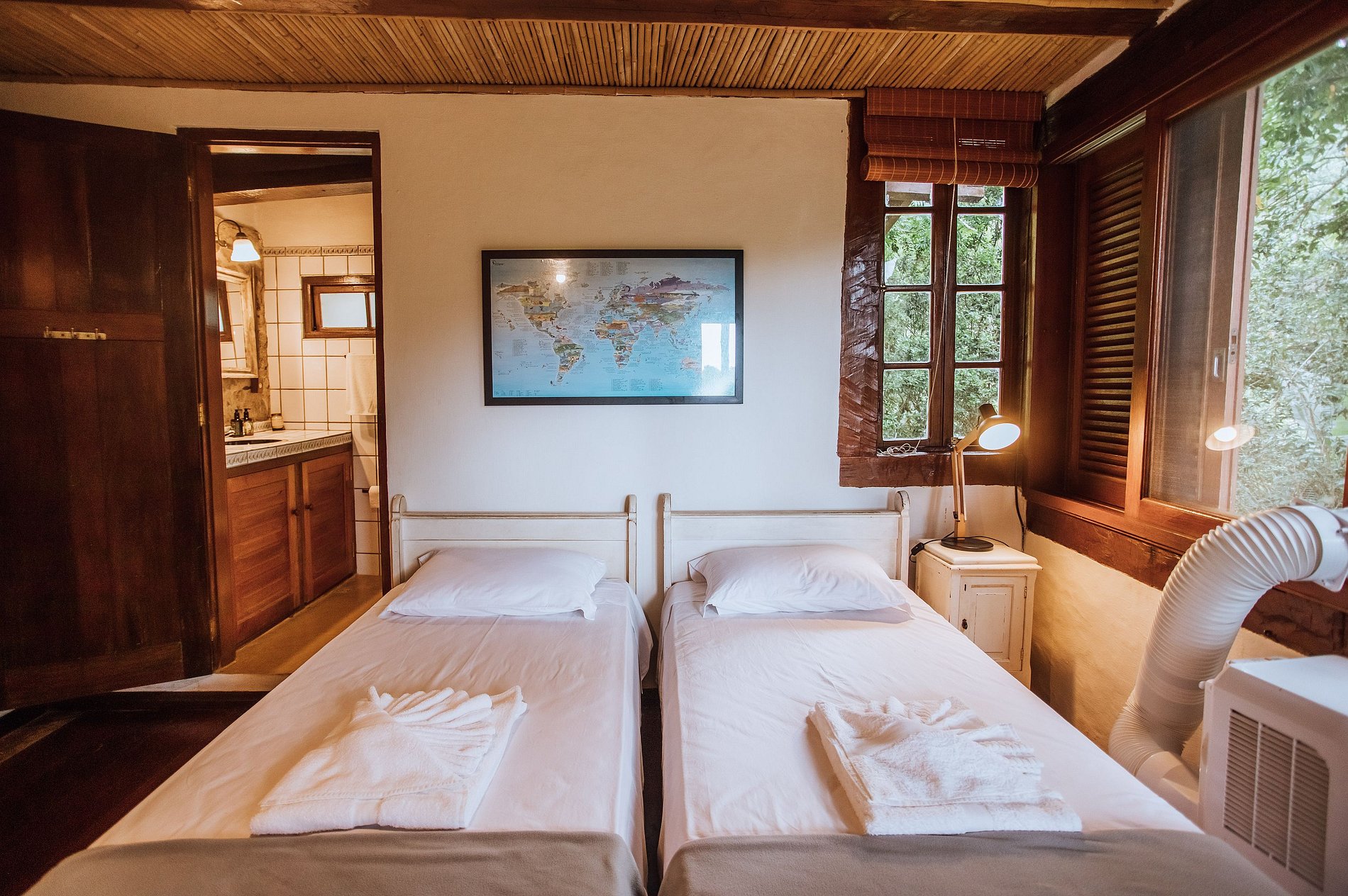 São 4 suítes, todas com bela vista, enxoval completo, secador de cabelos e ar-condicionado, na seguinte configuração: