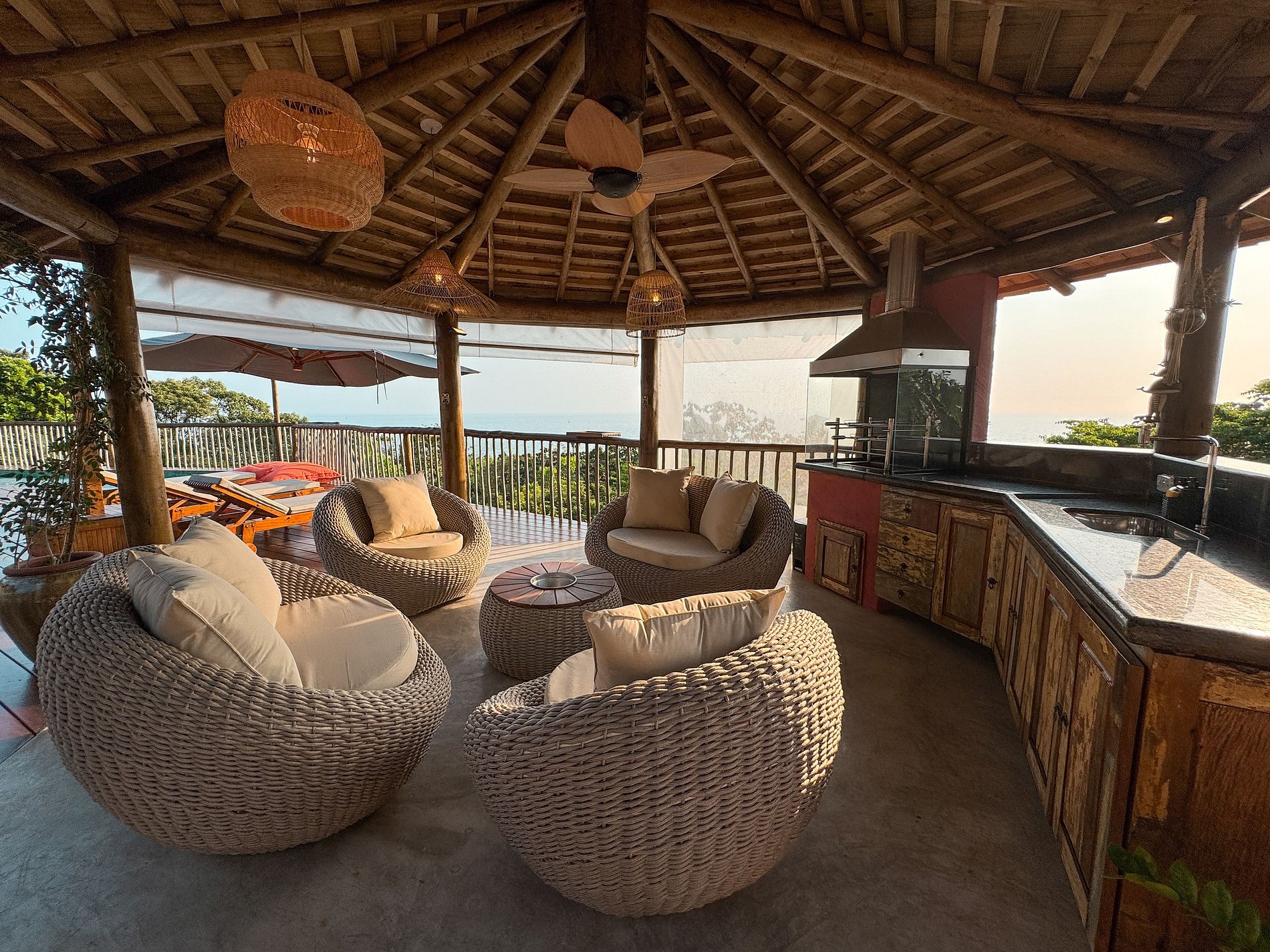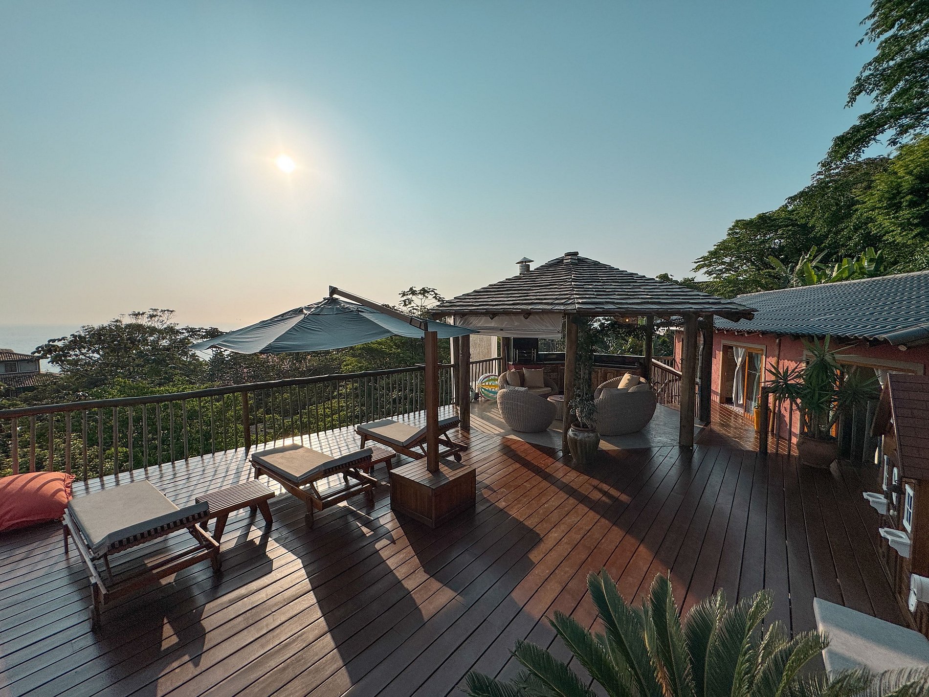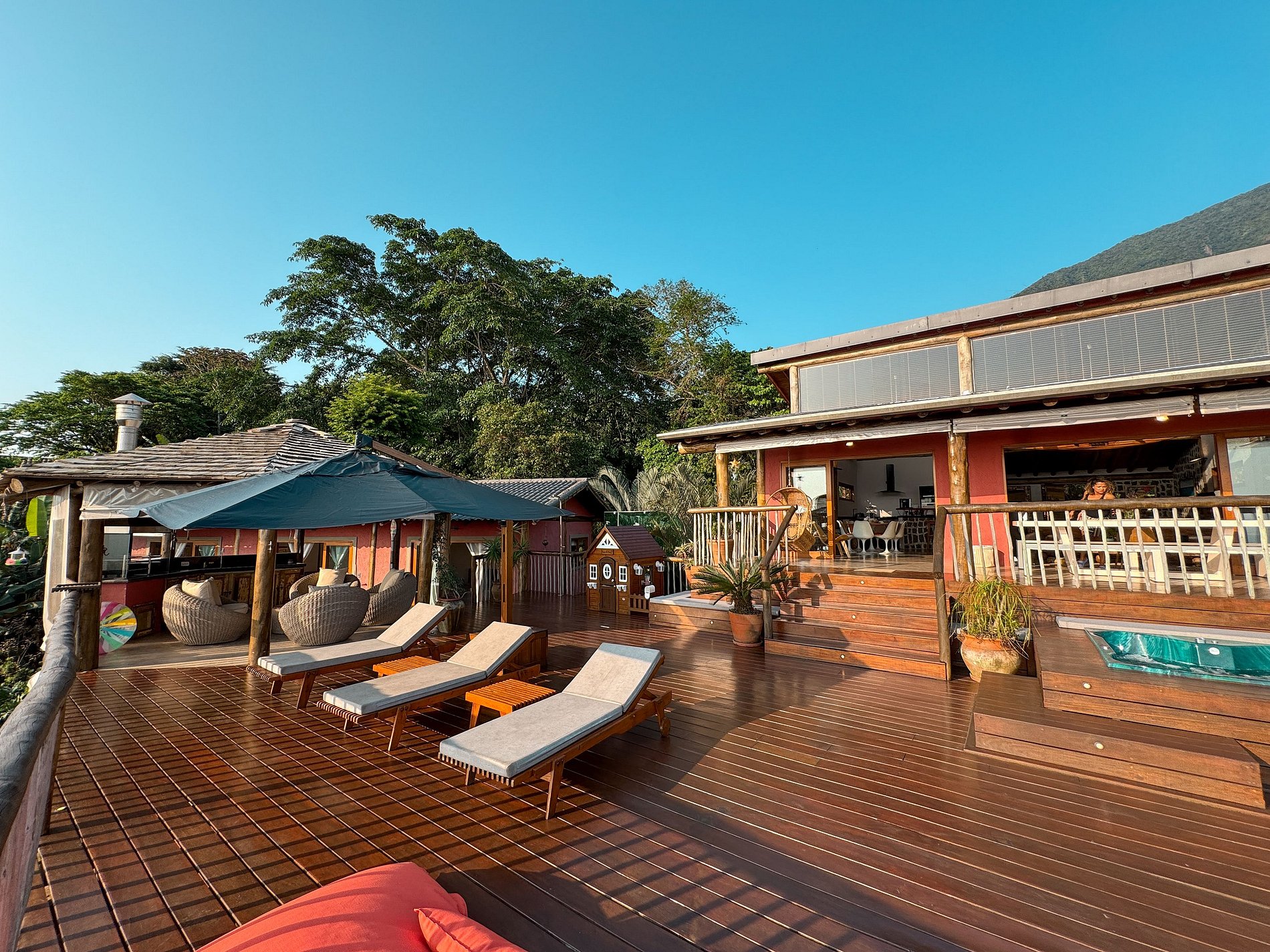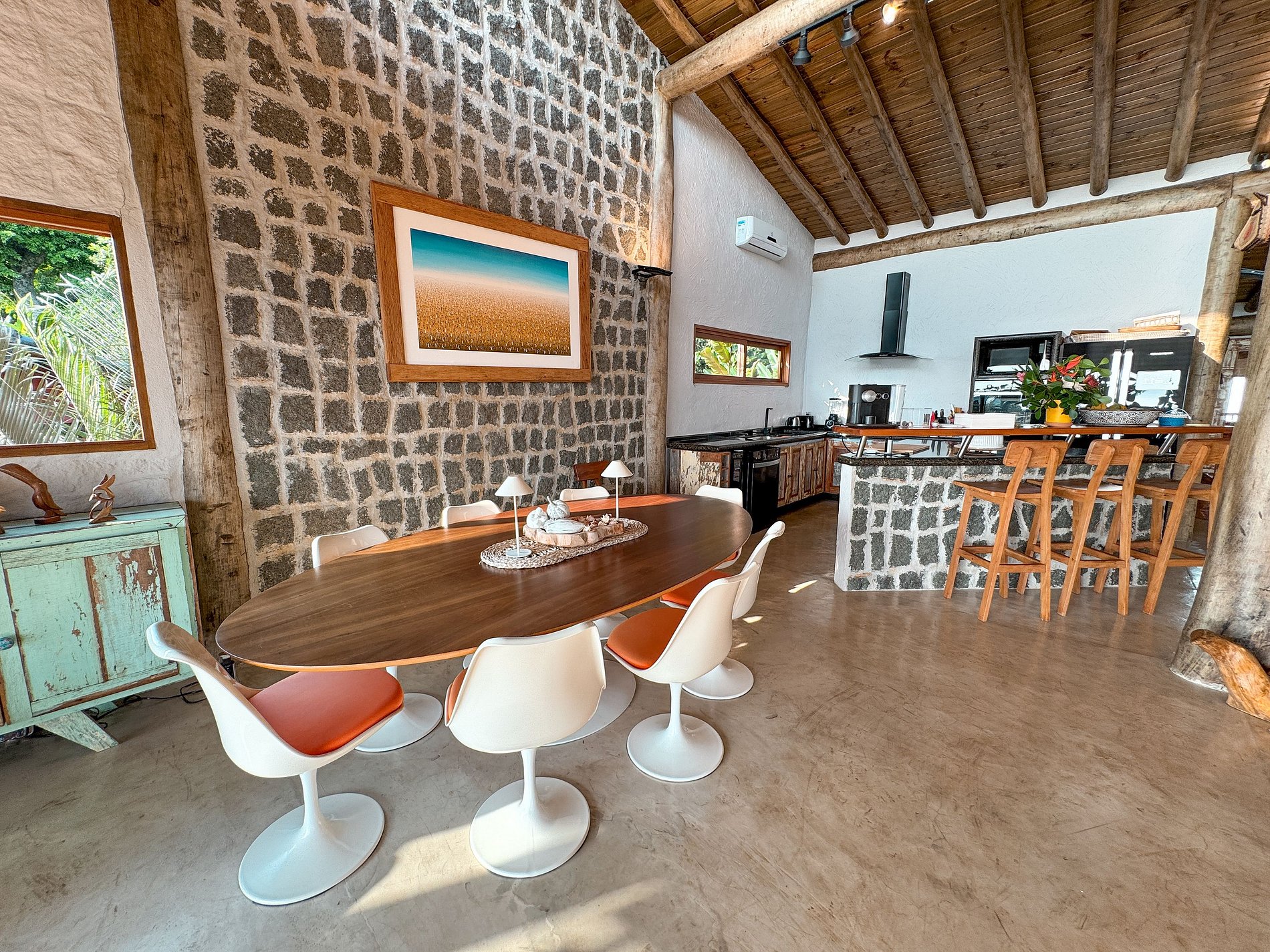 - Área interna ampla, arejada e iluminada, toda voltada para o mar, com salas de estar, TV, jantar e cozinha em ambiente integrado, com lareira, ar-condicionado e uma decoração de muito bom gosto;