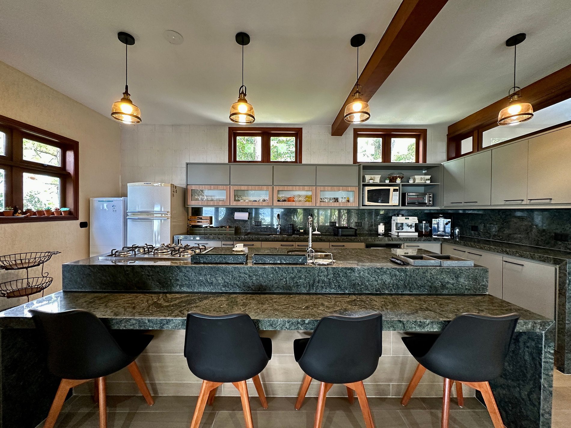- Cozinha completa, com fogão, forno, geladeira, freezer, micro-ondas, filtro de água, liquidificador, torradeira, cafeteira, louças, talheres e demais utensílios necessários;