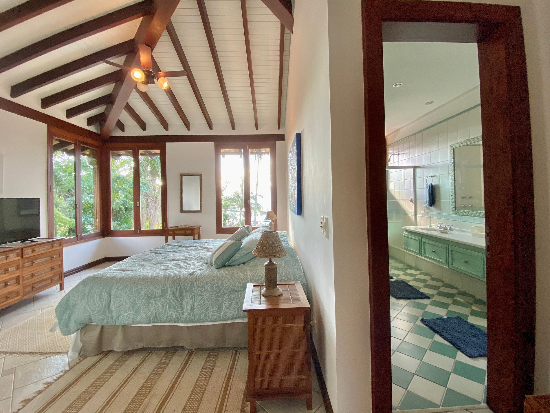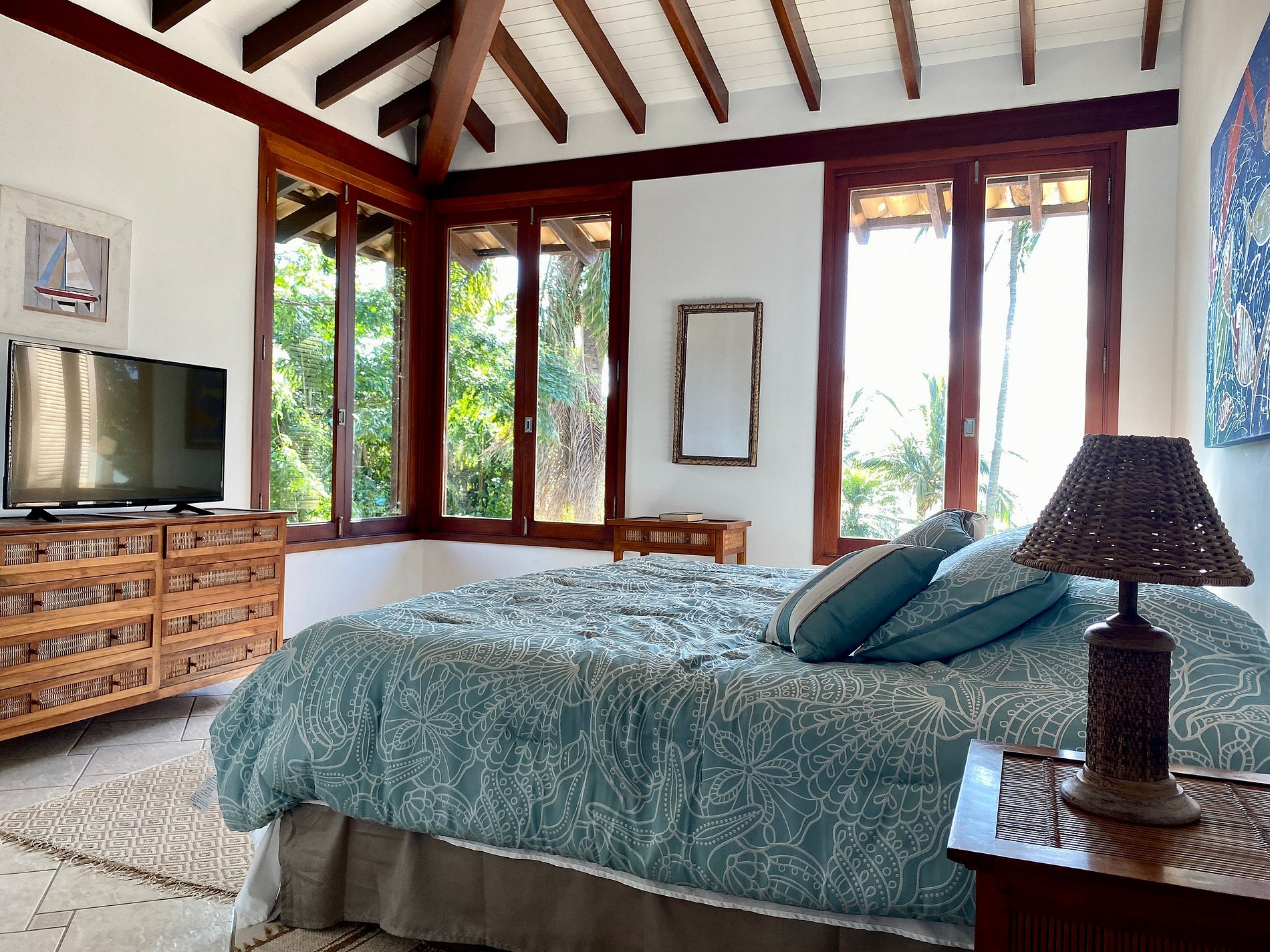 Suíte 1 - 1 cama de casal, cômoda, Smart TV e vista para o jardim e o mar;