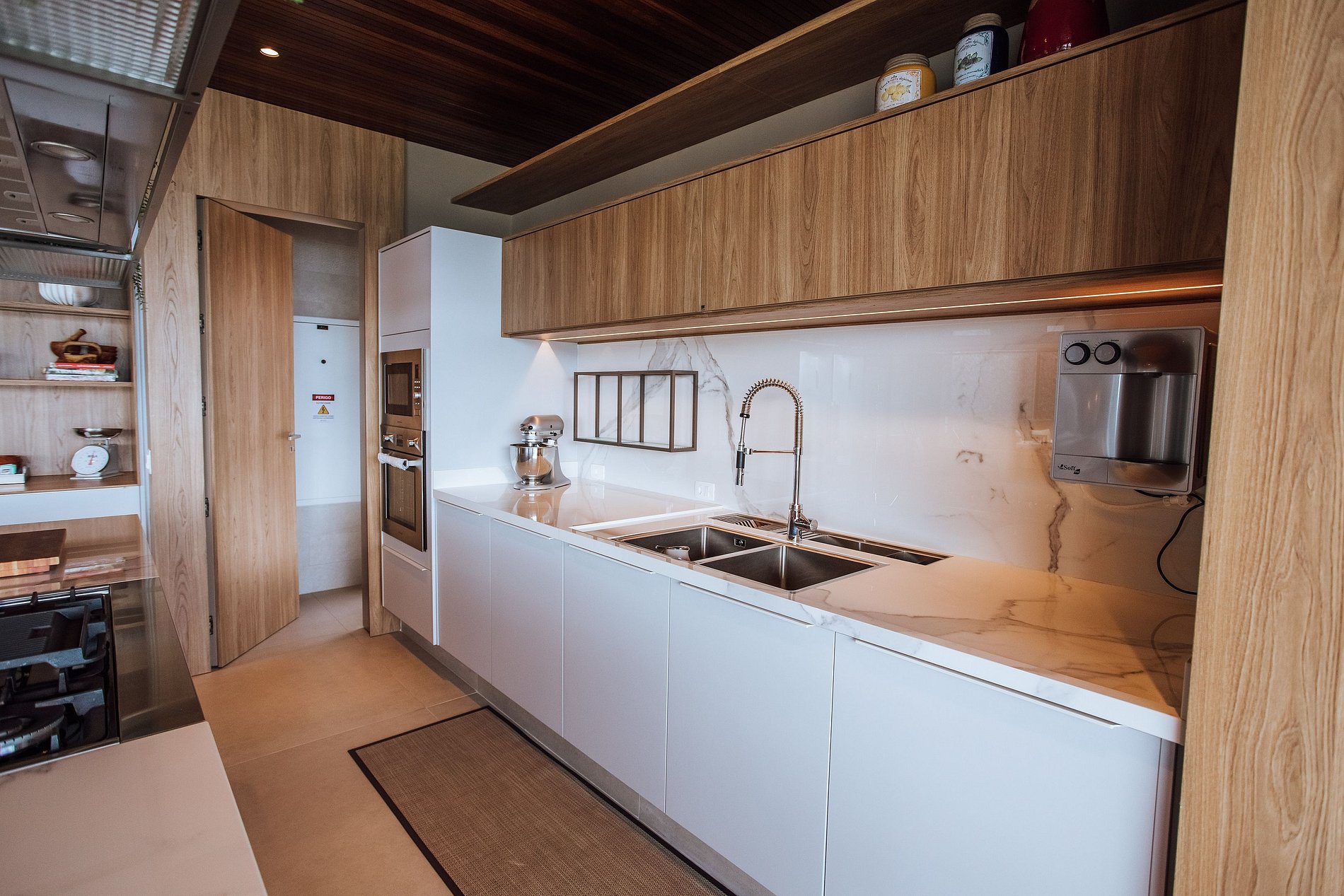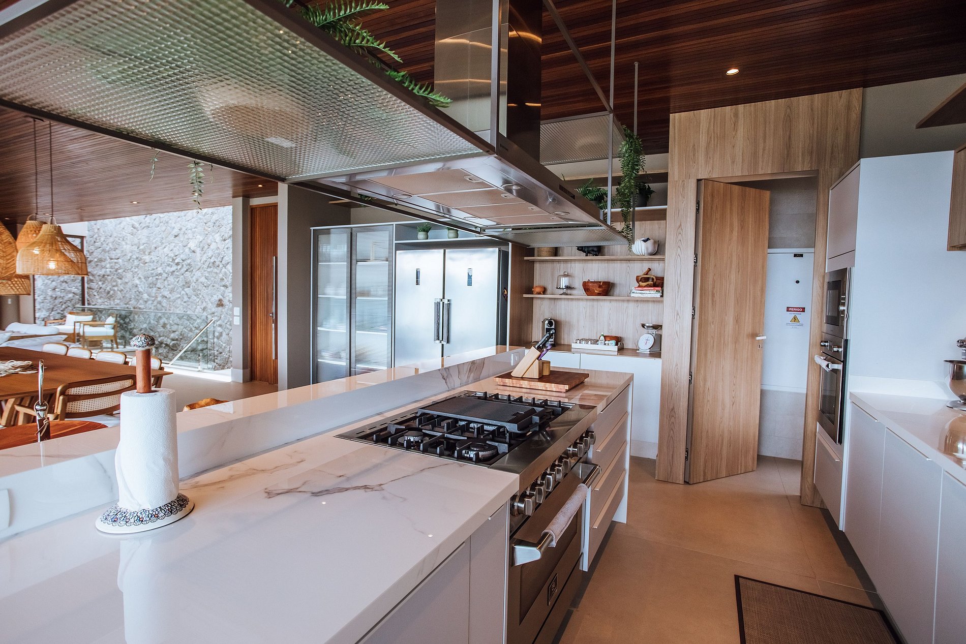 Ambientes sociais integrados: salas de estar, jantar, TV e cozinha completa, com vista deslumbrante para o mar