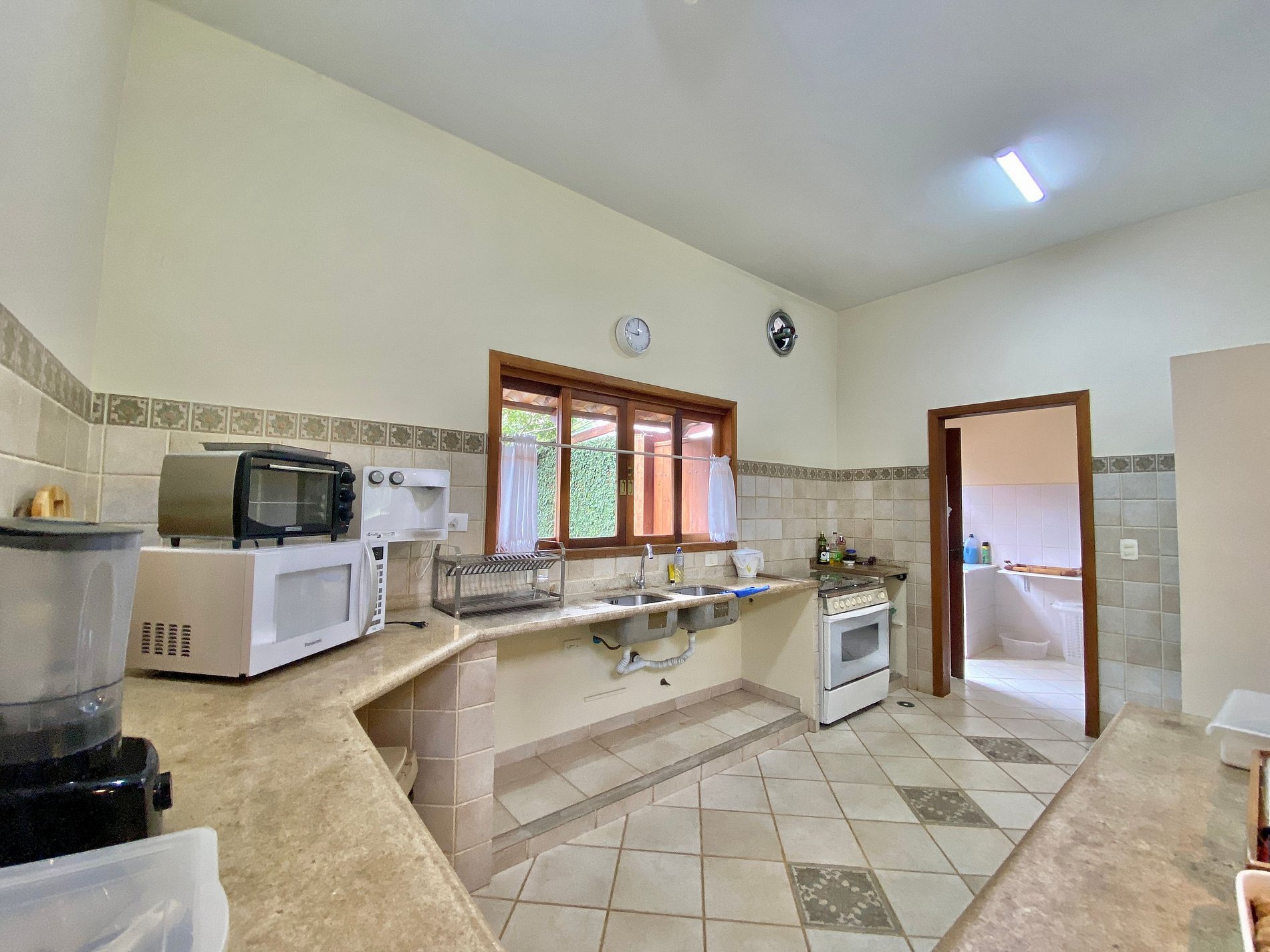 - Cozinha bem equipada, com filtro de água, fogão, forno, geladeira, freezer, liquidificador, louças e talheres, micro-ondas e demais utensílios necessários para a estadia;