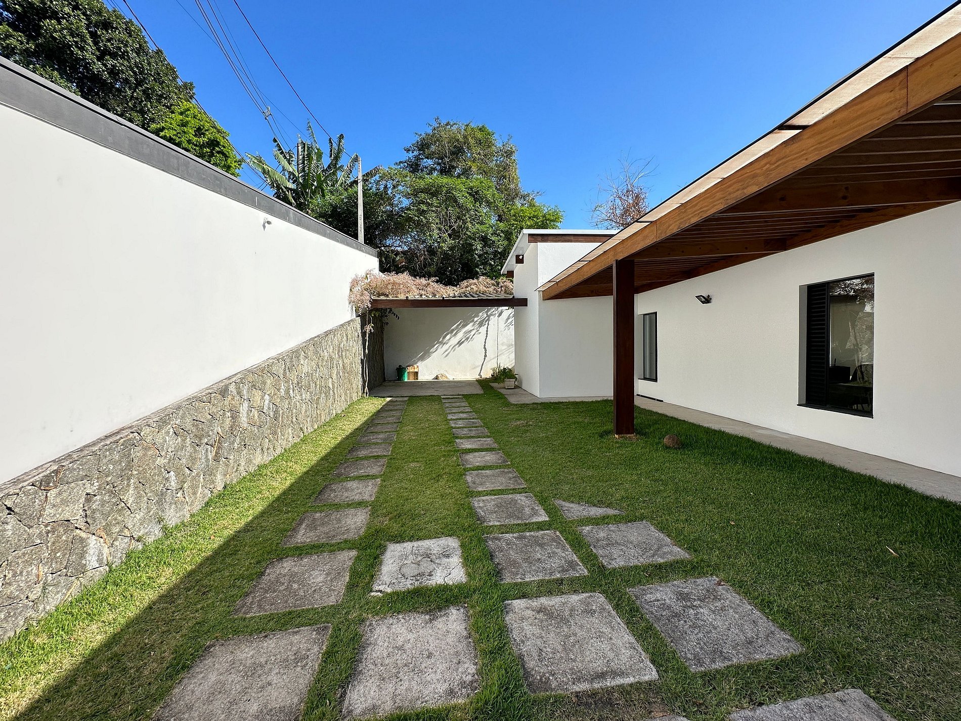 - Área externa com deck de madeira, piscina com pedras Hijau (Indonésia), além de uma churrasqueira portátil e mesa externa, ideal para refeições entre familiares e amigos;