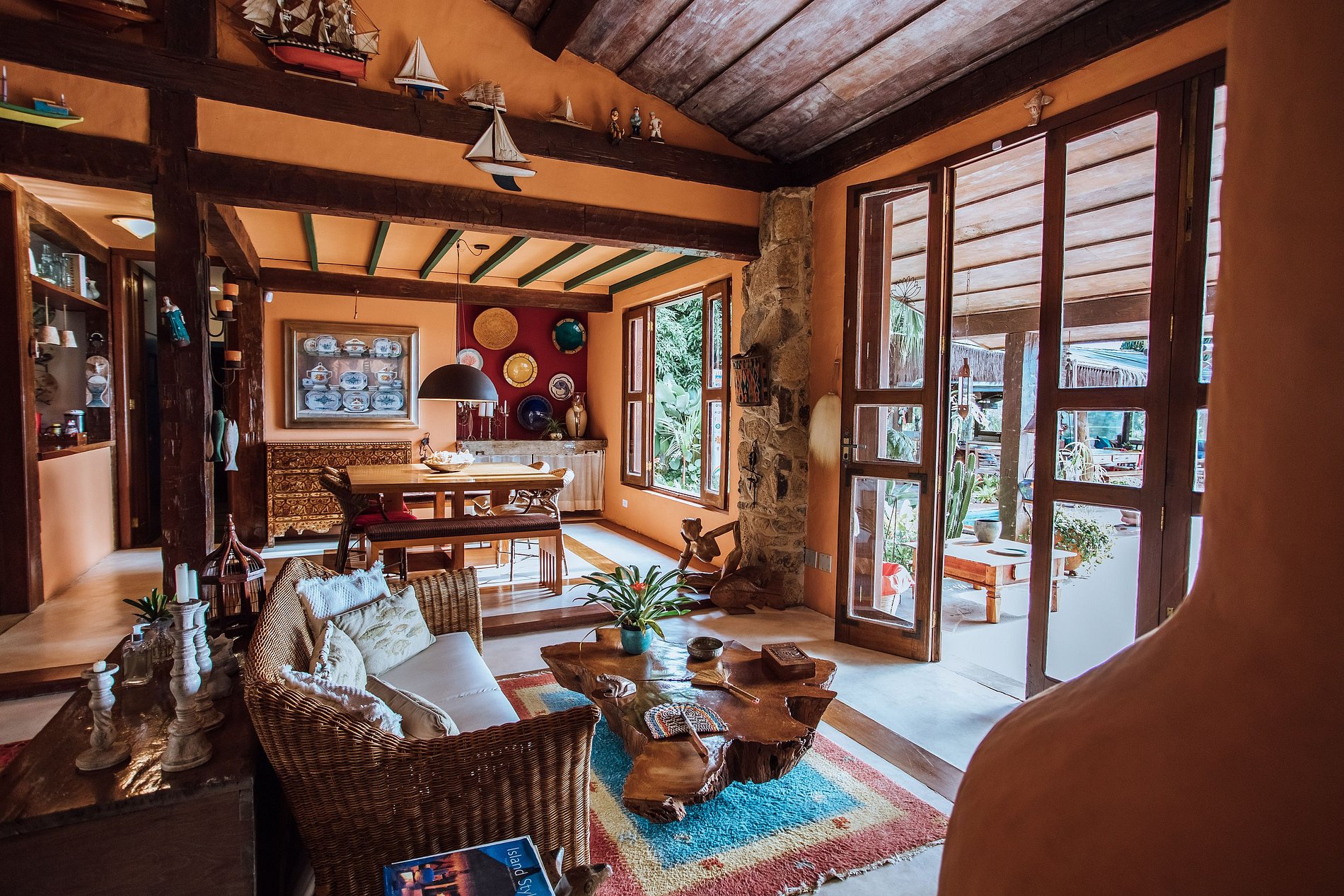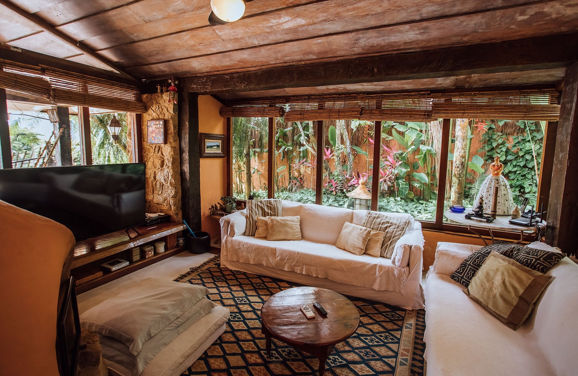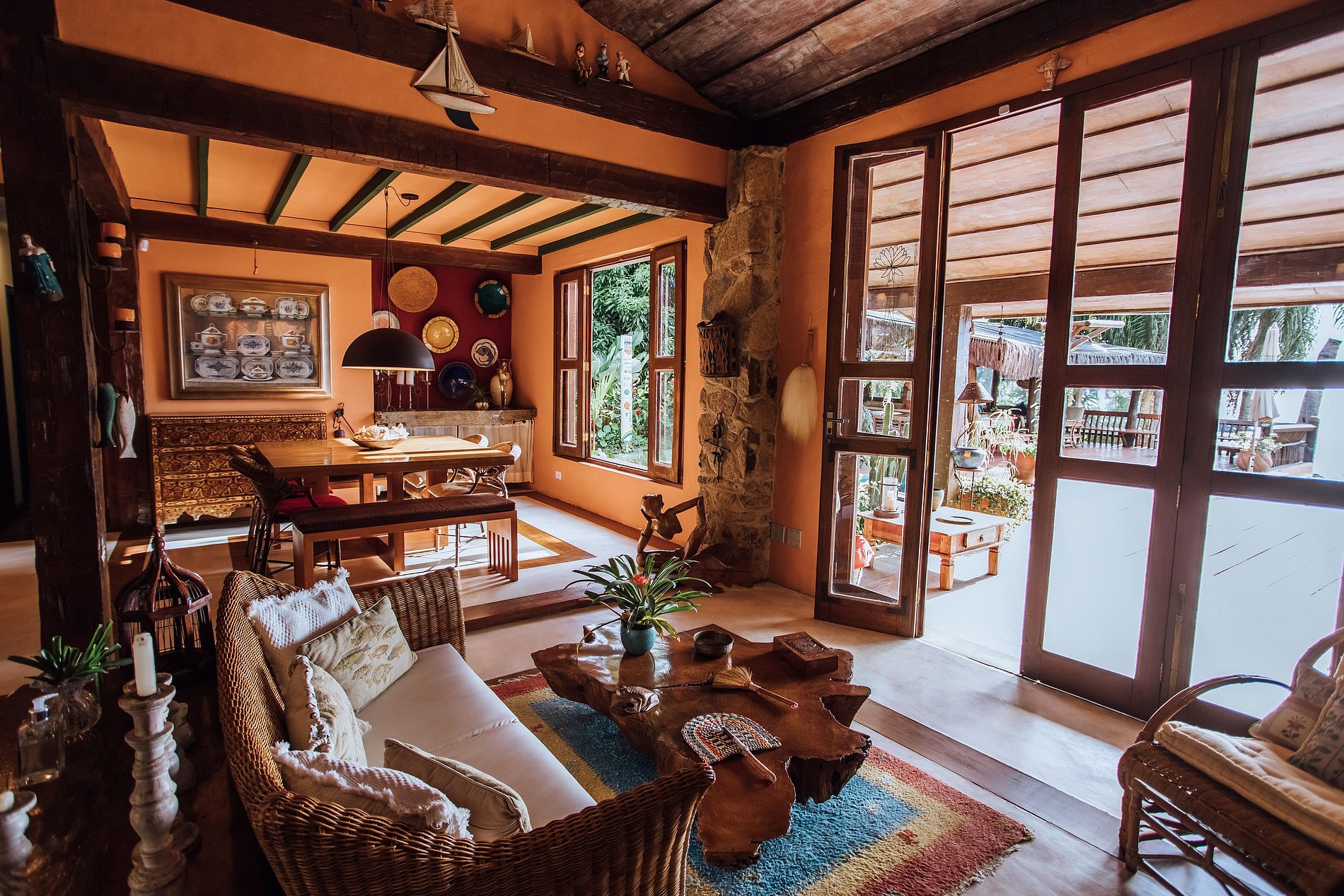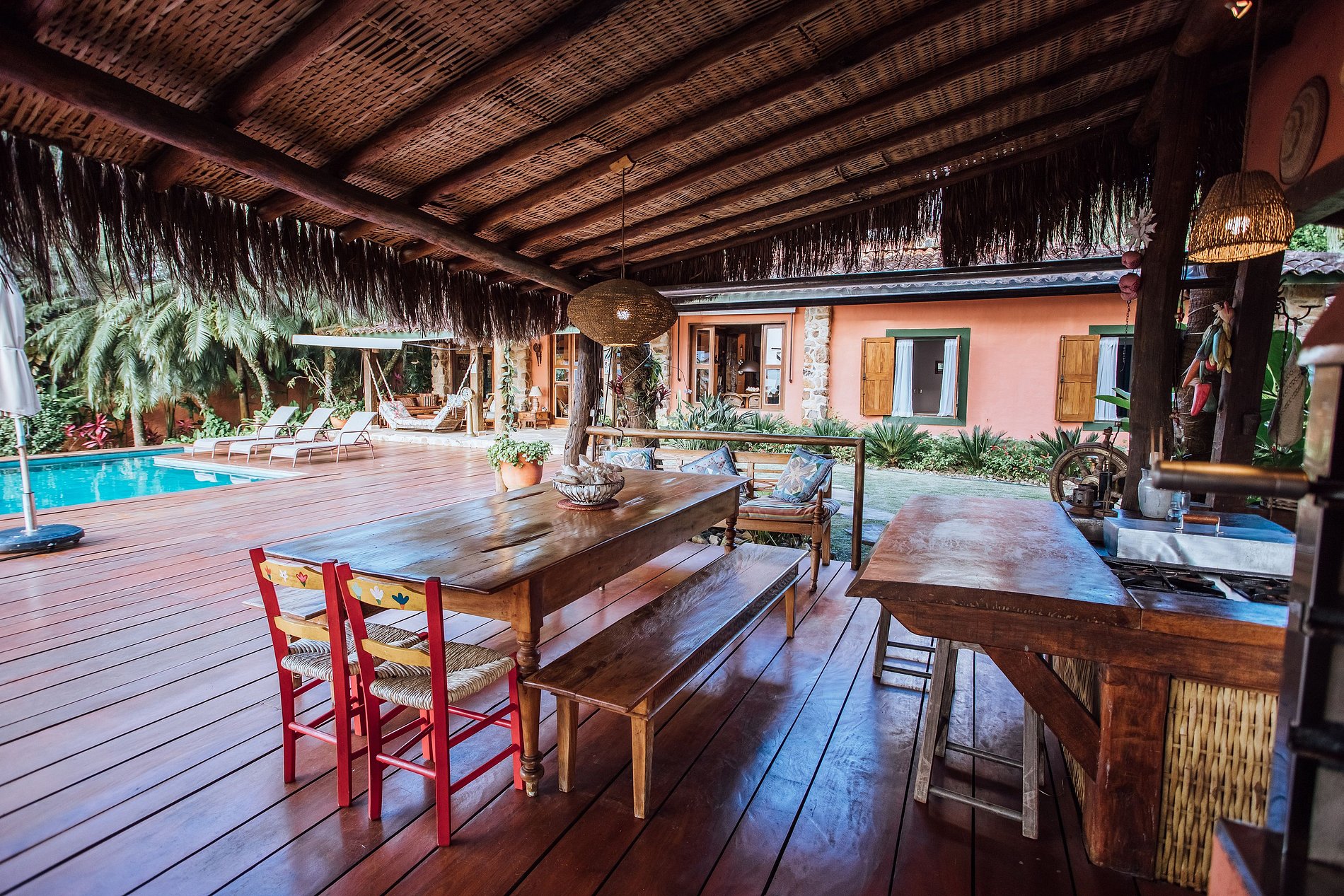 Todos os ambientes da casa são ricamente decorados e charmosos. Desde as salas internas até a enorme área externa que contempla a área de convivência, cozinha completa, mesas e bancos perfeitos para longas conversas.