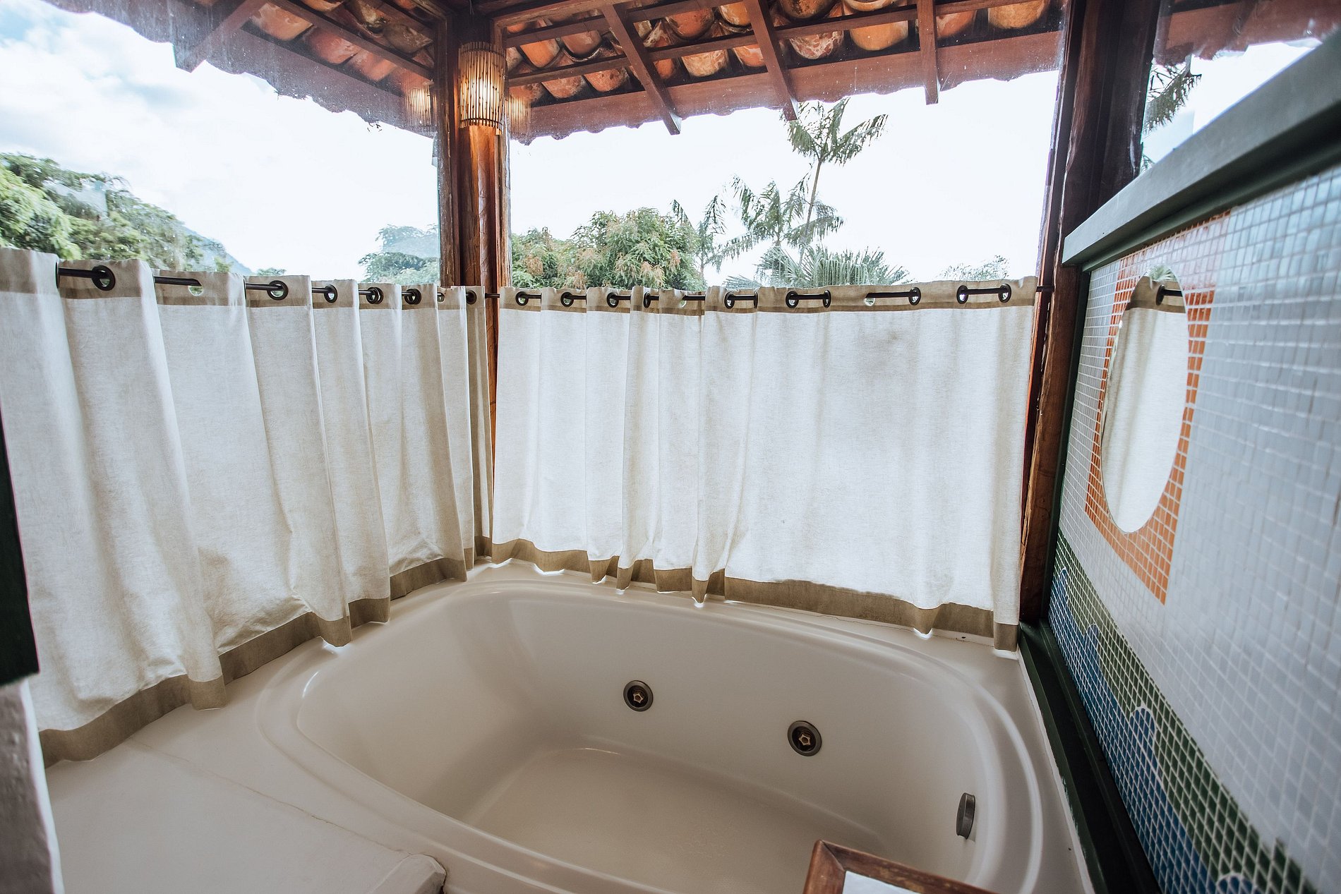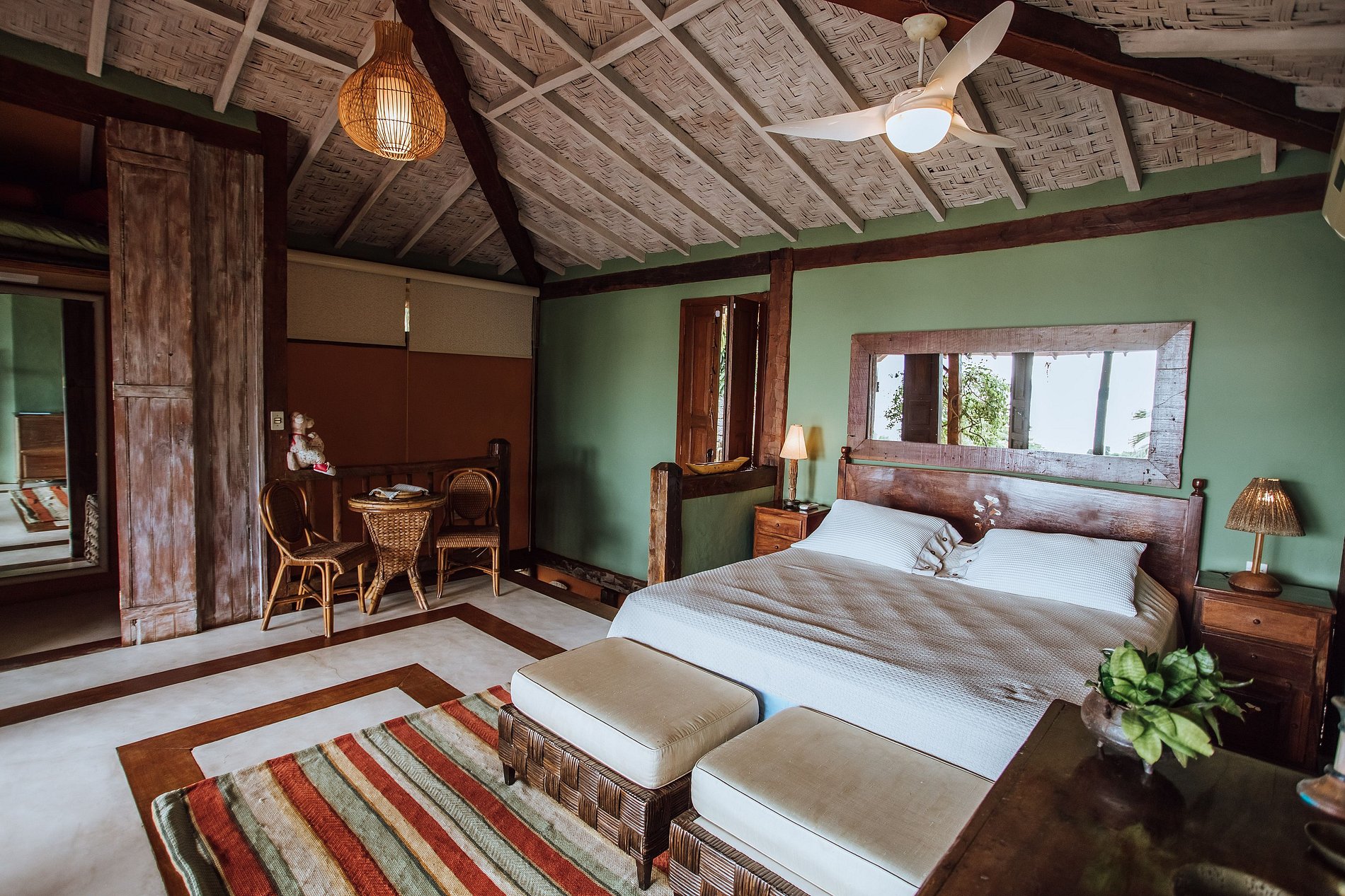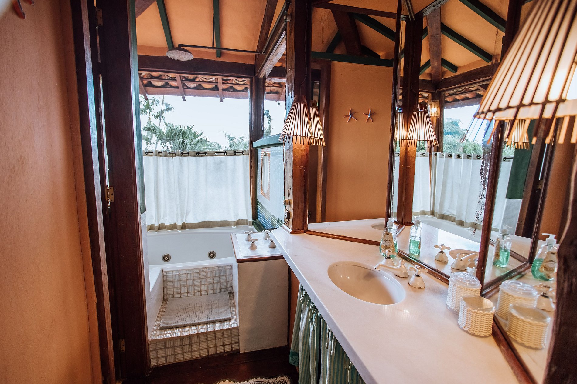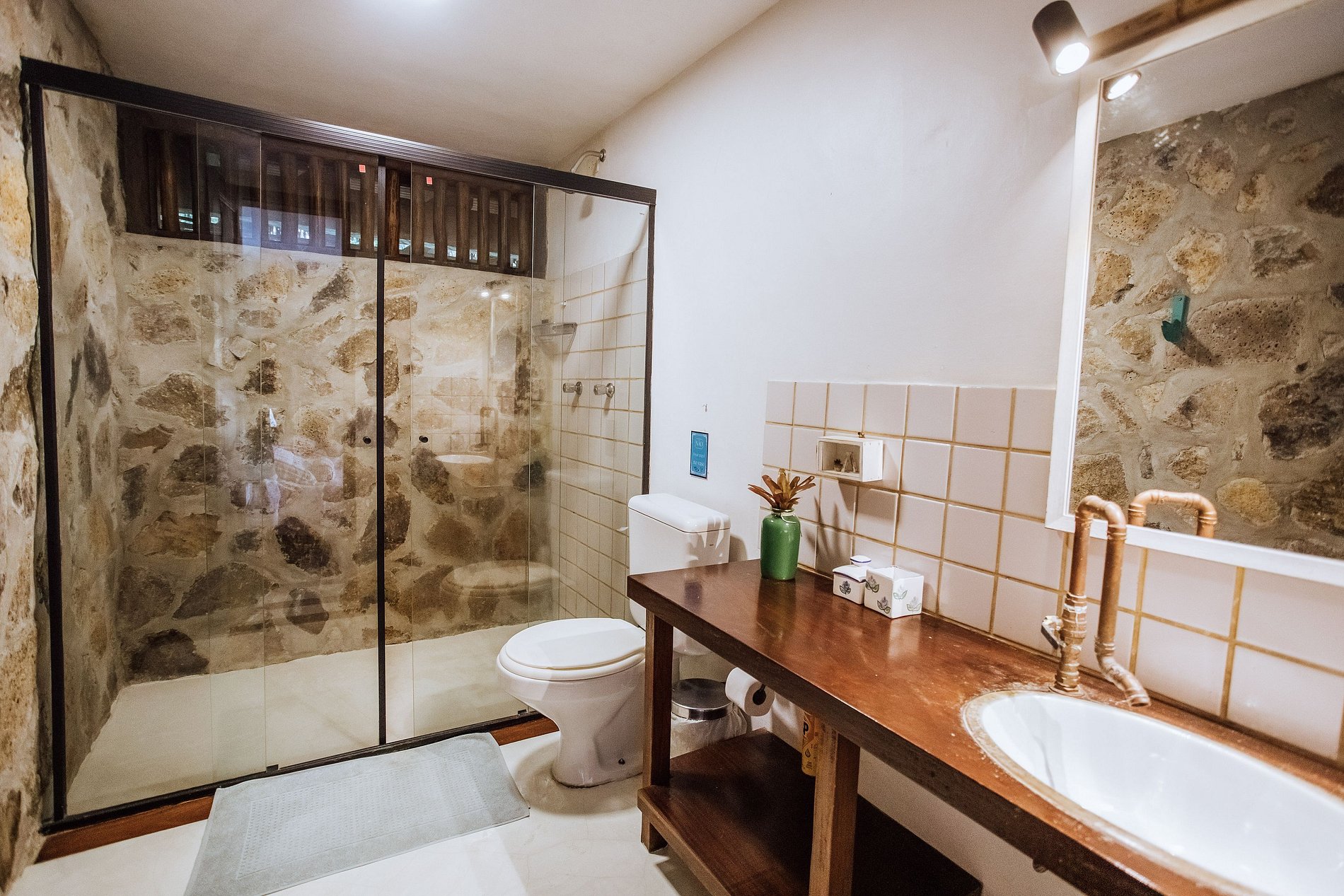 Todas as suítes possuem janelas, vista para a área externa com muito verde, banheiros arejados e rústicos com paredes de pedra, proporcionando uma conexão com a natureza até na hora do banho. Estão na seguinte configuração: