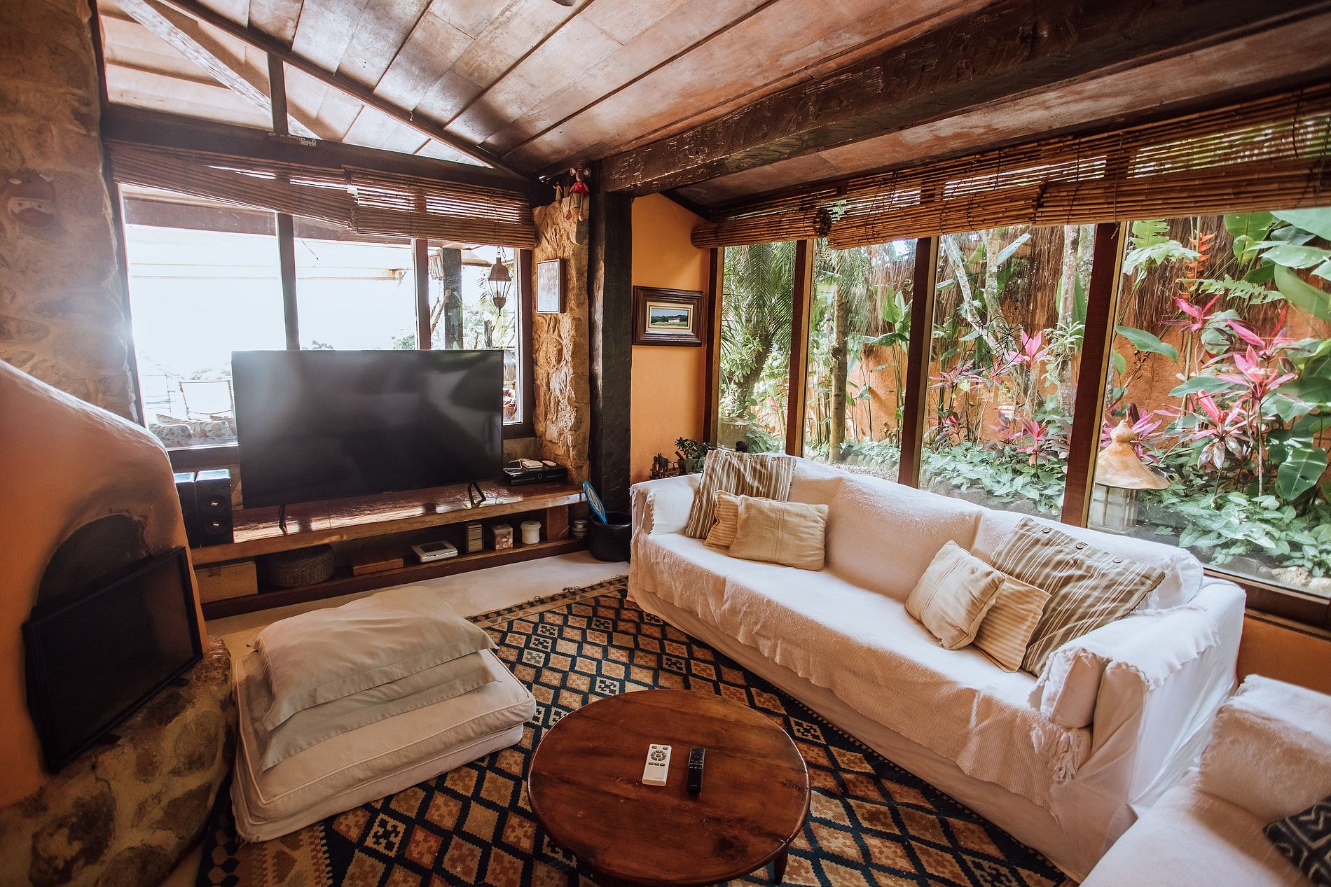 - Ambiente interno com sala ampla e arejada, com claridade natural por todo o espaço, além de lavabo, lareira, decoração rústica, sofás confortáveis, uma super TV para noites de filme e conforto;