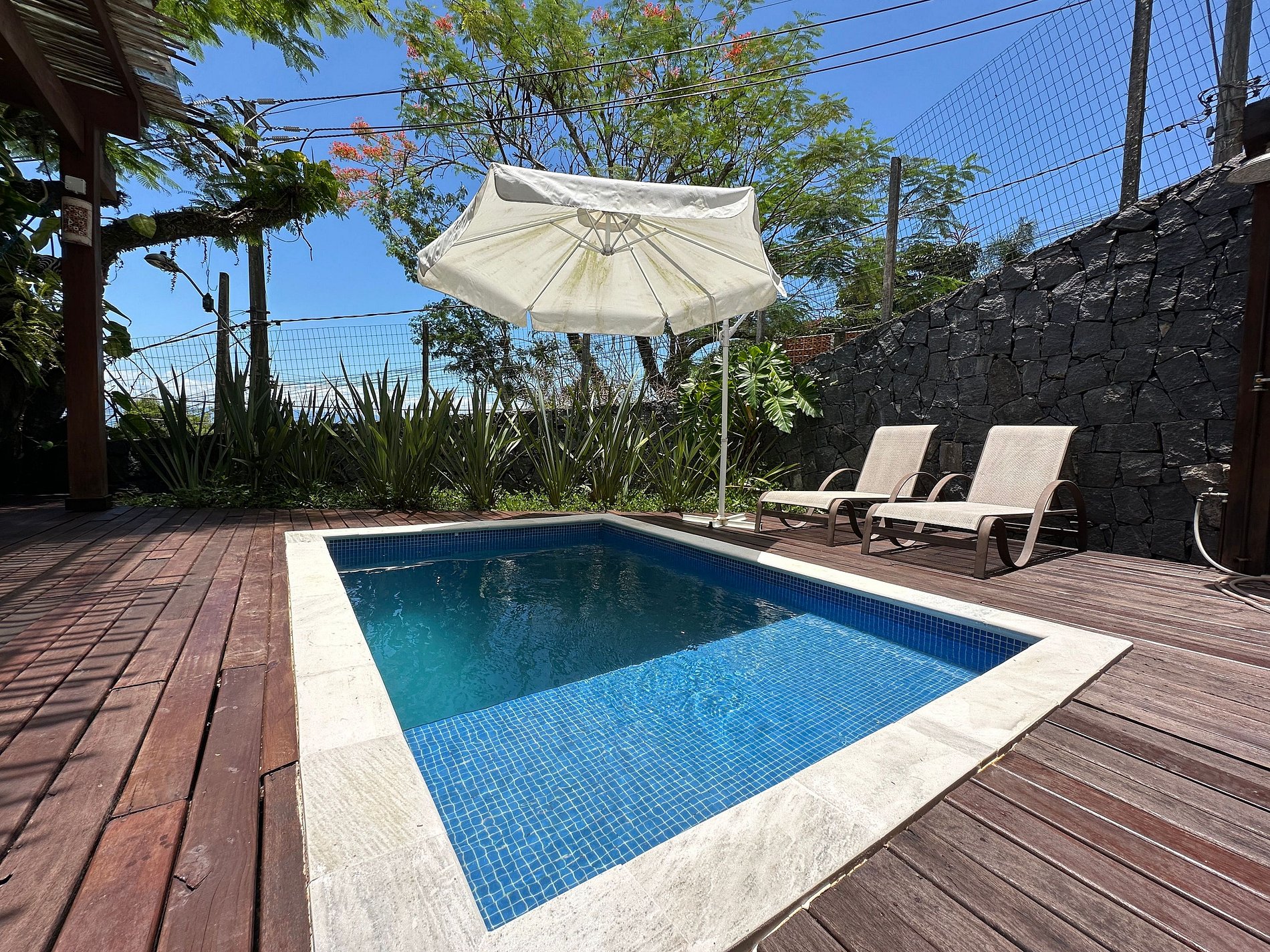Na costeira há uma prainha e uma área de píer com solário sombreado com árvores, basta abrir o portão que dá acesso ao local.