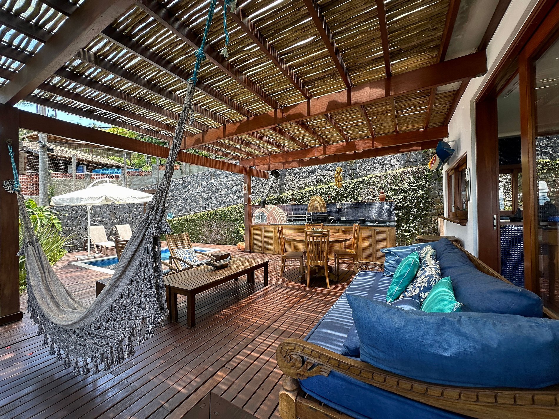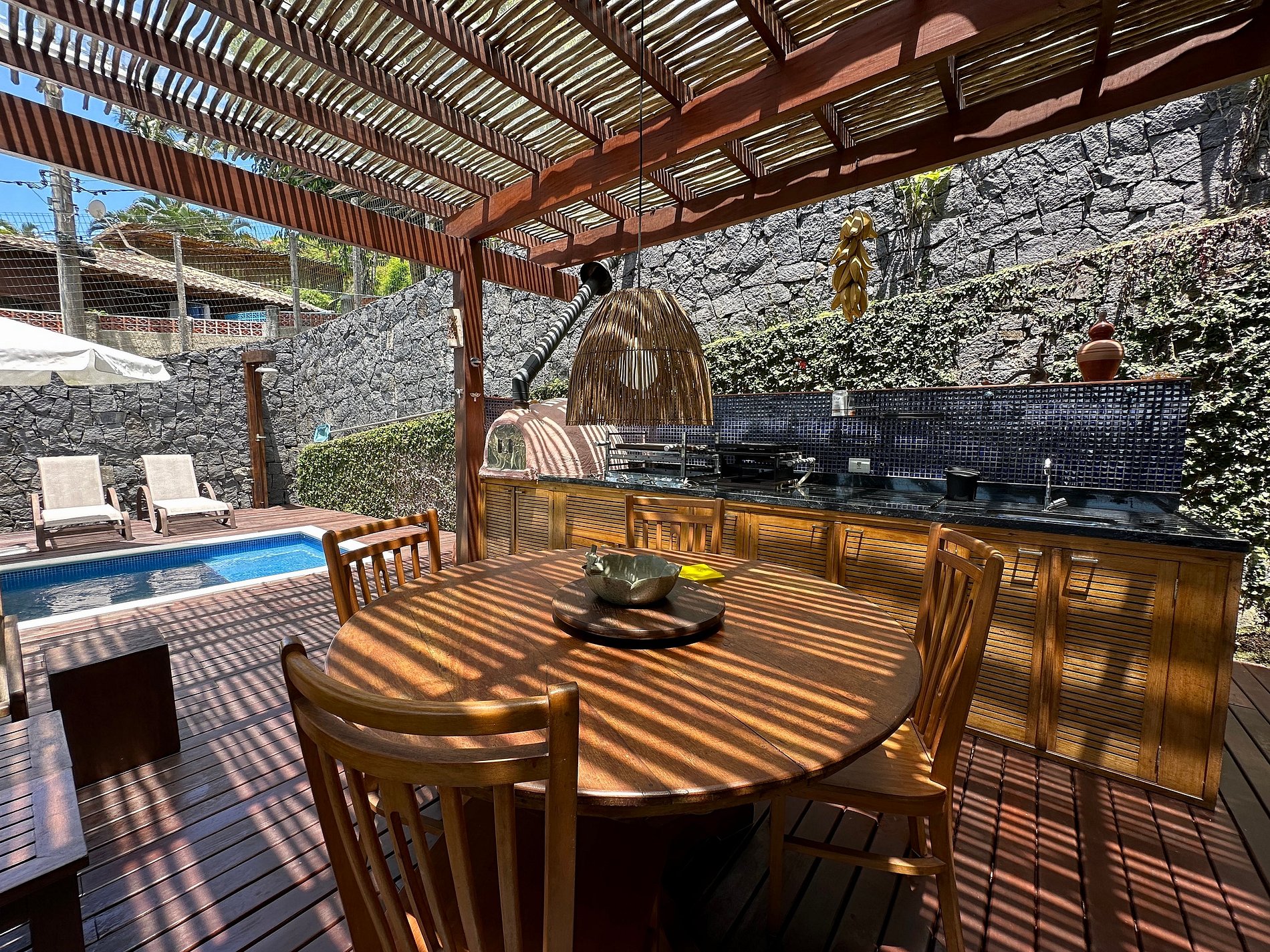 - A parte interna com salas de estar, jantar, TV e cozinha completa, em ambientes muito iluminados e arejados, além de ventiladores de teto. Conta com um lavabo de apoio;