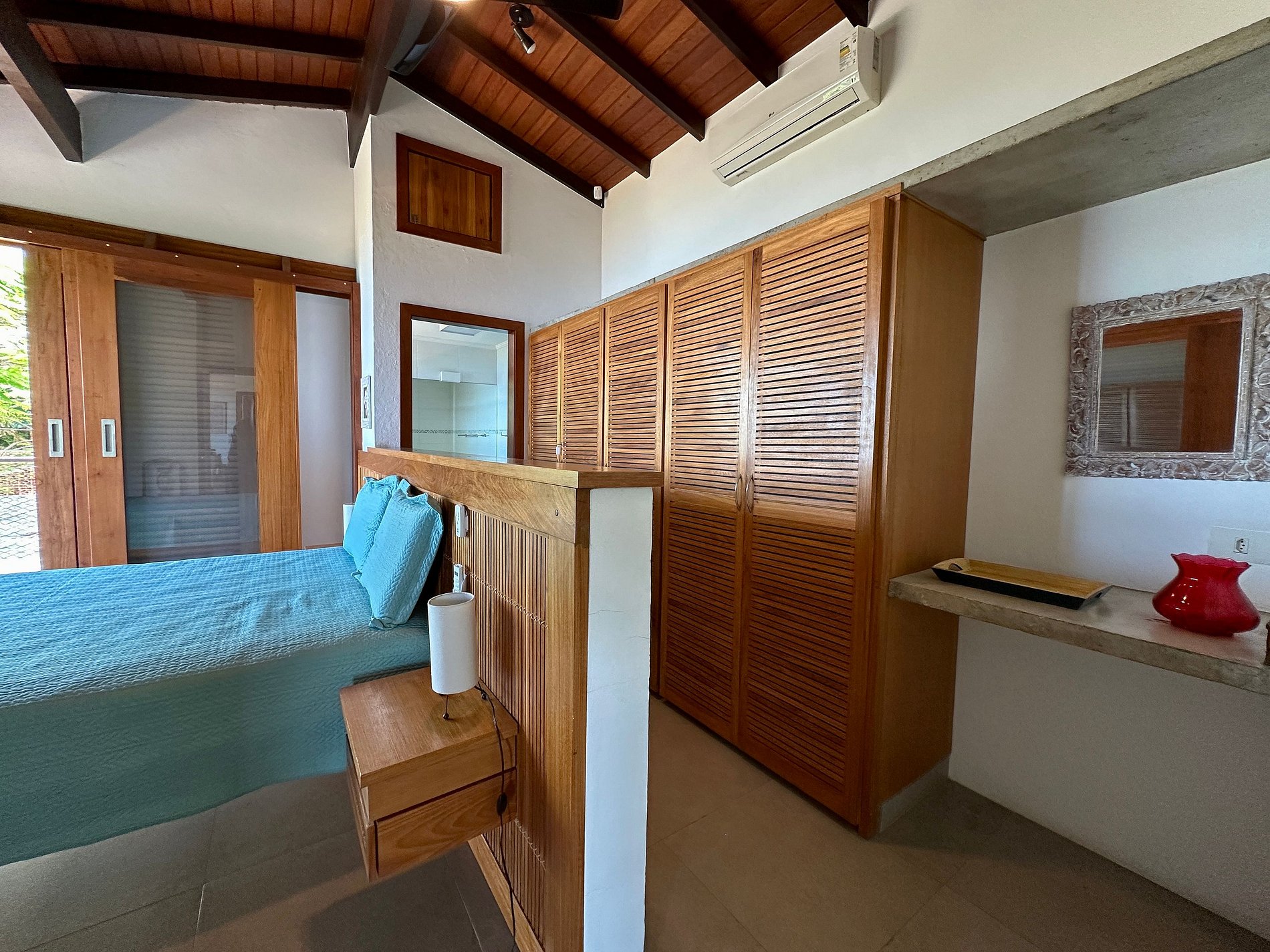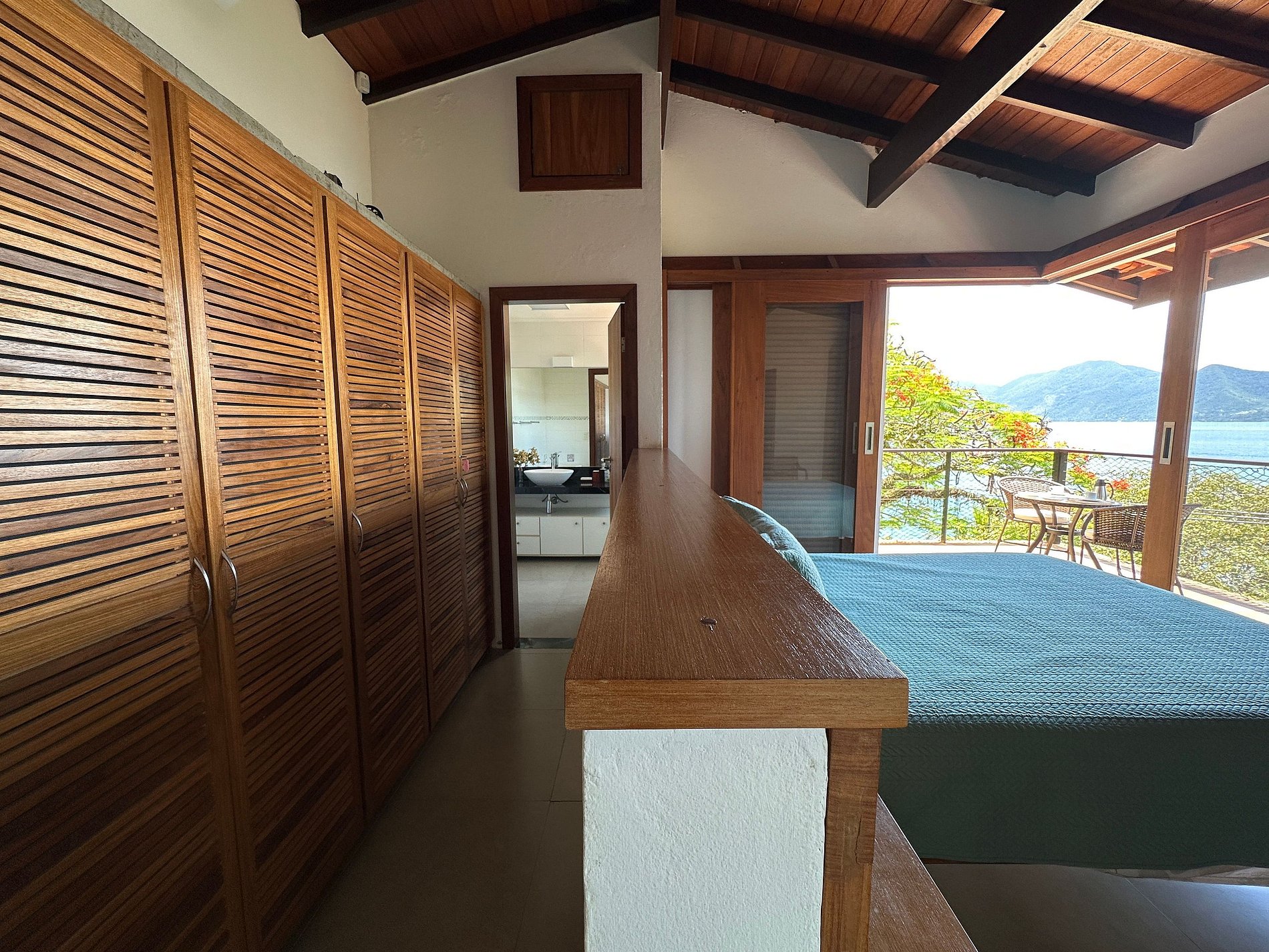 Suíte 1 (superior) - 1 cama de casal queen, closet e varanda com vista para o mar;