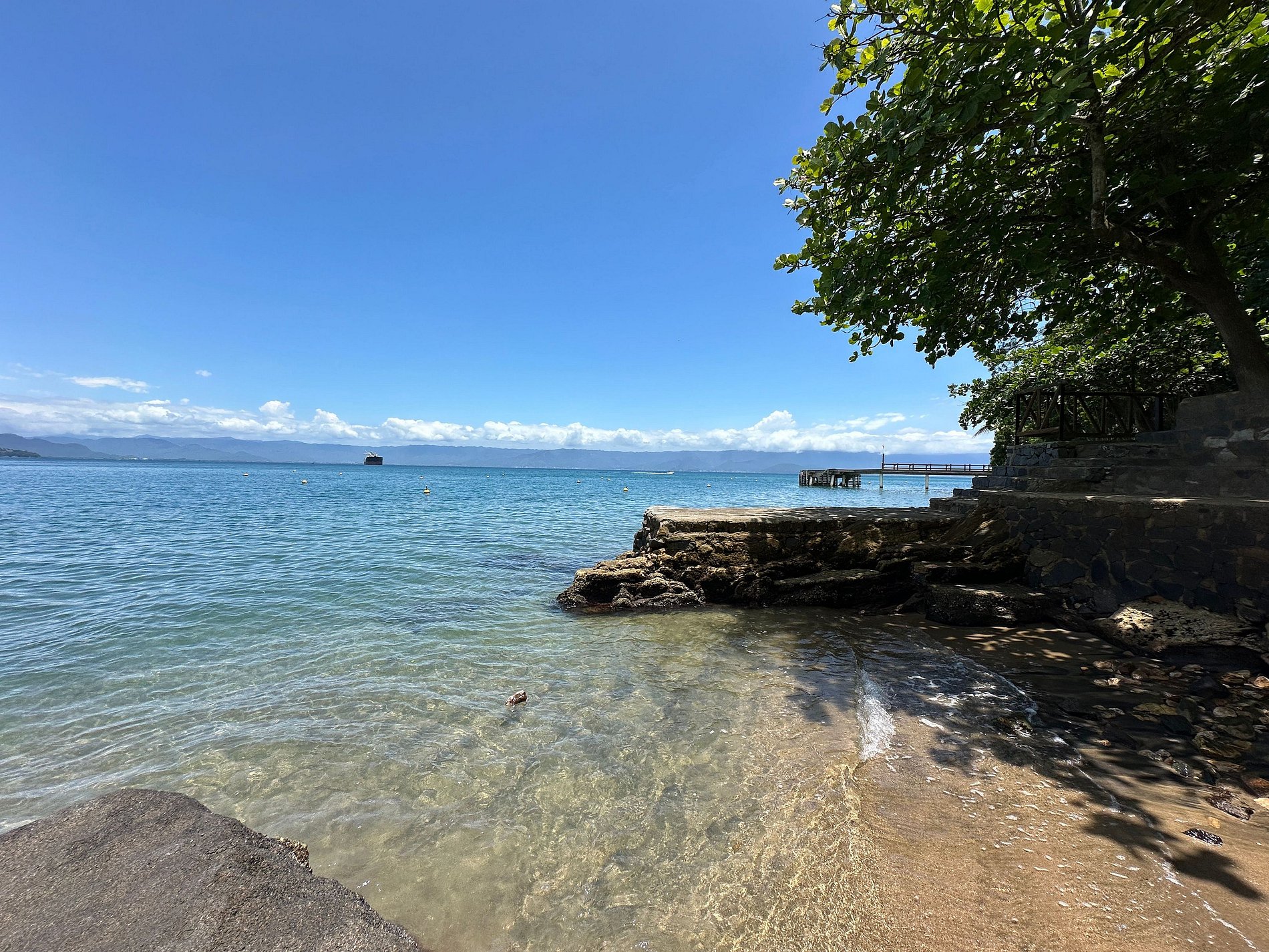 Na costeira há uma prainha e uma área de píer com solário sombreado com árvores, basta abrir o portão que dá acesso ao local.
