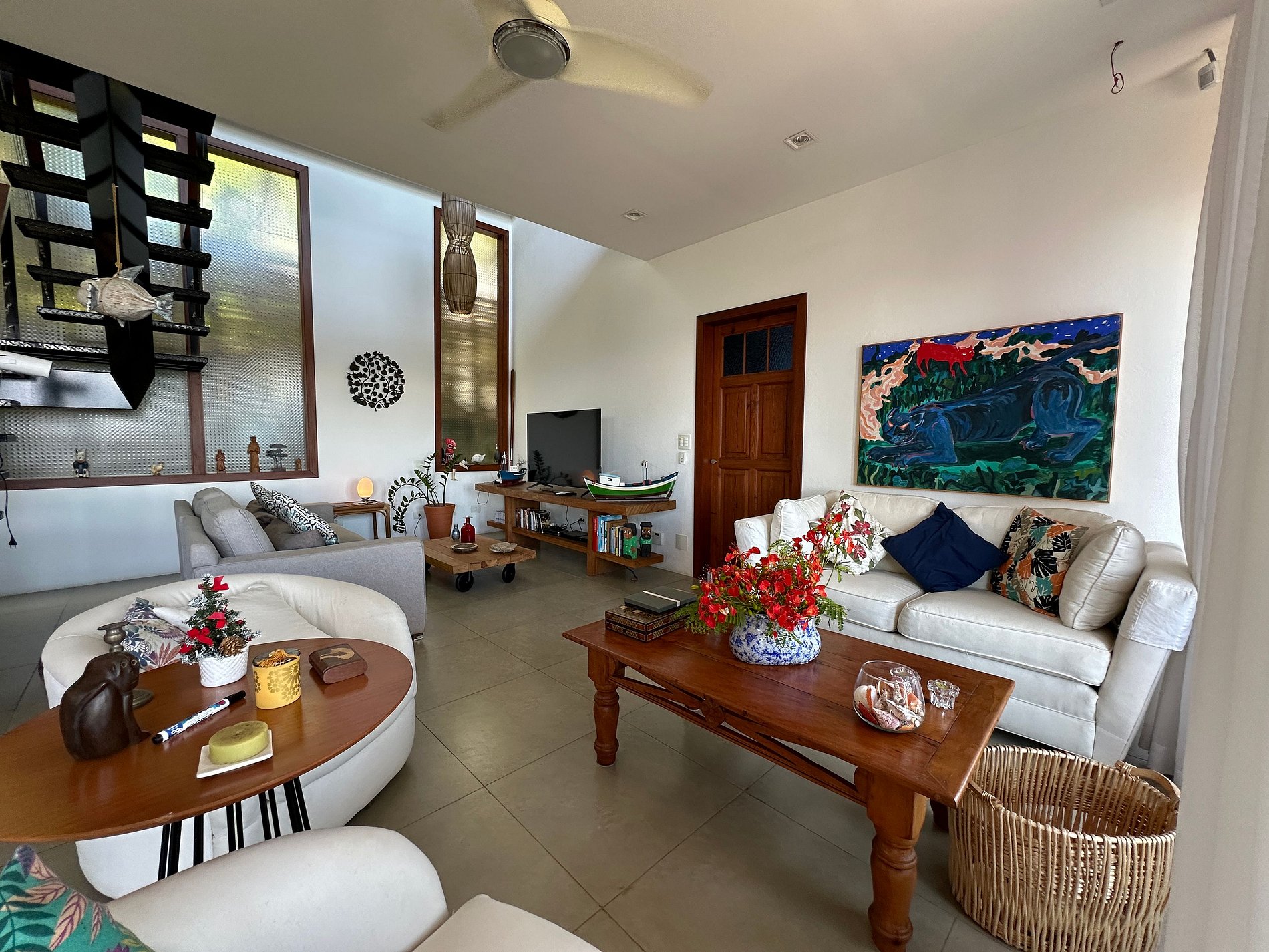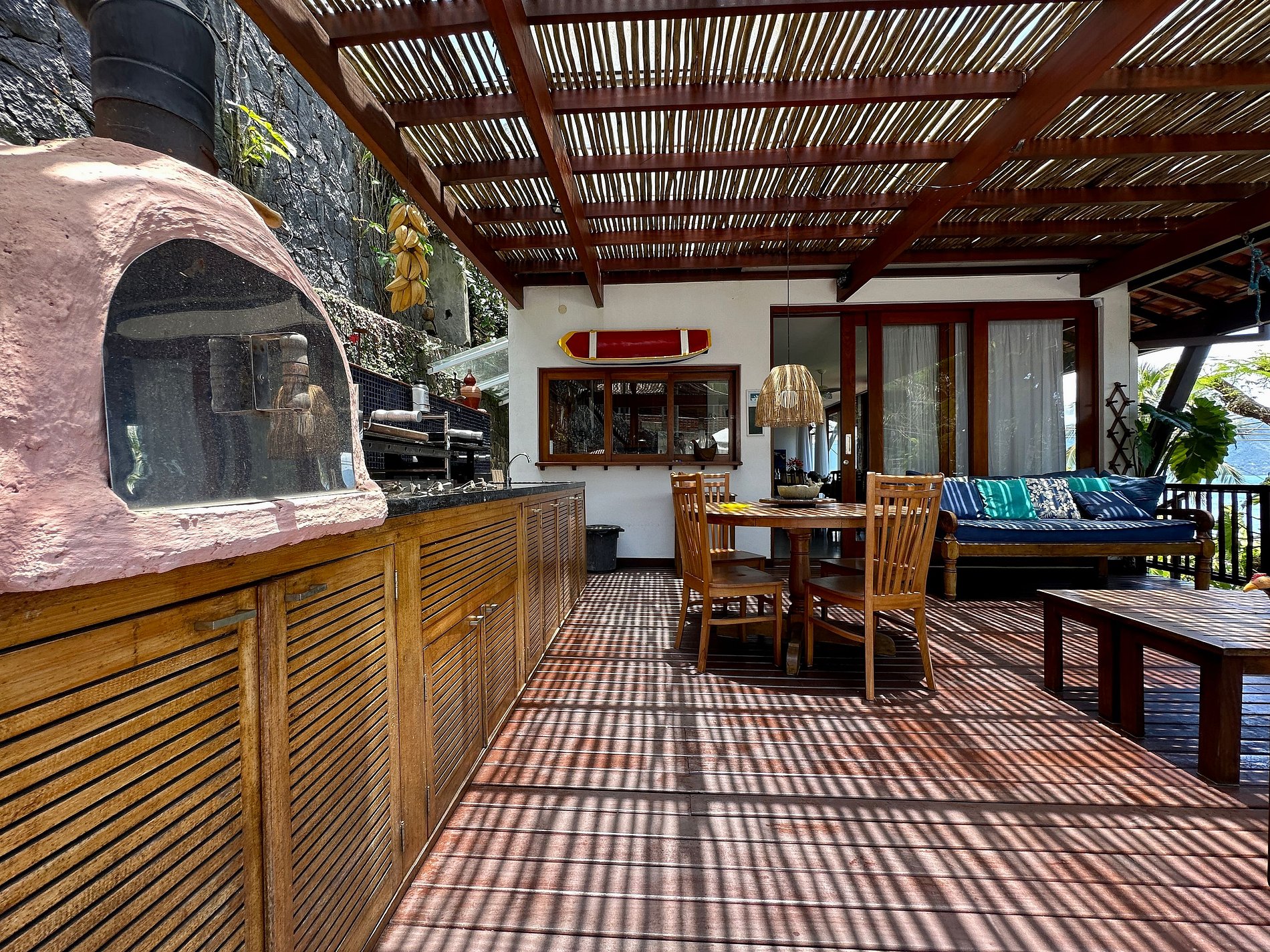 - A parte interna com salas de estar, jantar, TV e cozinha completa, em ambientes muito iluminados e arejados, além de ventiladores de teto. Conta com um lavabo de apoio;
