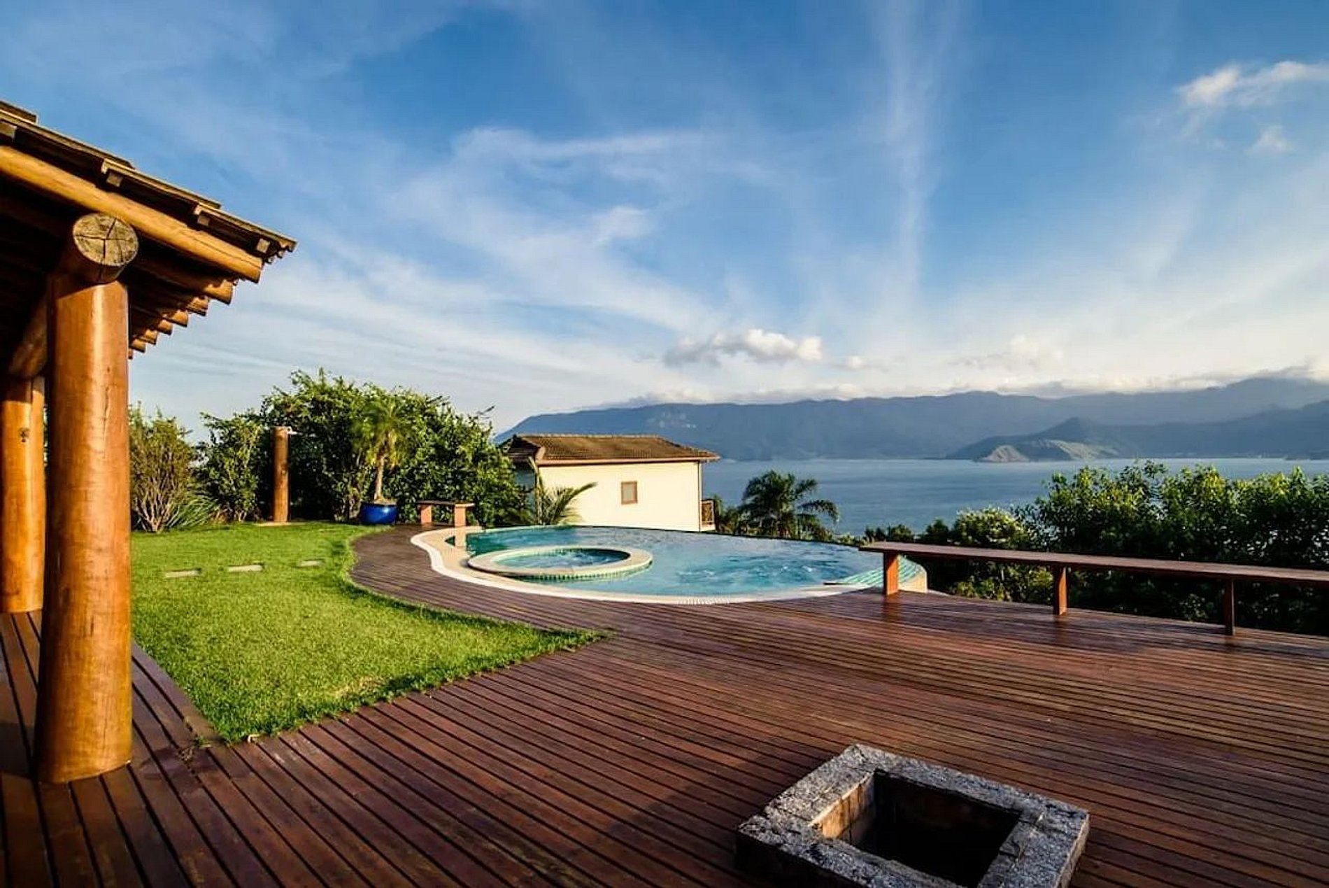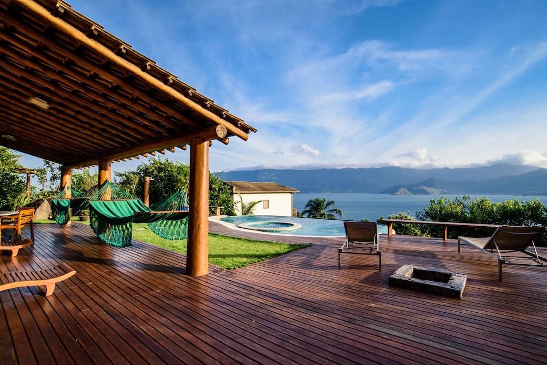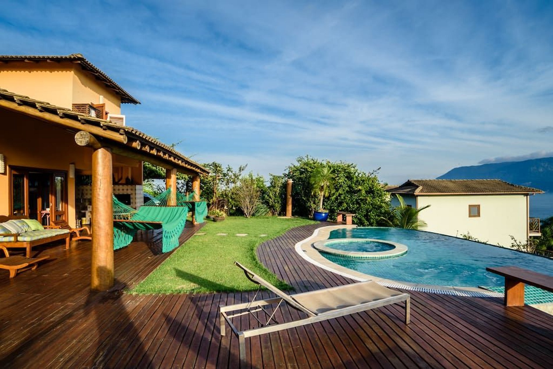 Linda casa com uma vista de tirar o fôlego e um pôr do sol deslumbrante, no luxuoso condomínio Yacamim, na Praia do Curral, a mais badalada ao Sul de Ilhabela. São 4 suítes, todas com ar-condicionado. Área externa sensacional, jardim, amplo varanda com deck de madeira, pit fire, piscina borda infinita, jacuzzi, cromoterapia e vista para o mar, espaço gourmet com churrasqueira, pia de apoio e mesa para refeições ao ar livre. Conta com salas de estar, jantar e TV, além de uma cozinha bem equipada. Dispõe de todos os acessos para TVs a cabo e ótimo sinal de Wi-fi. Garagem para 4 veículos.