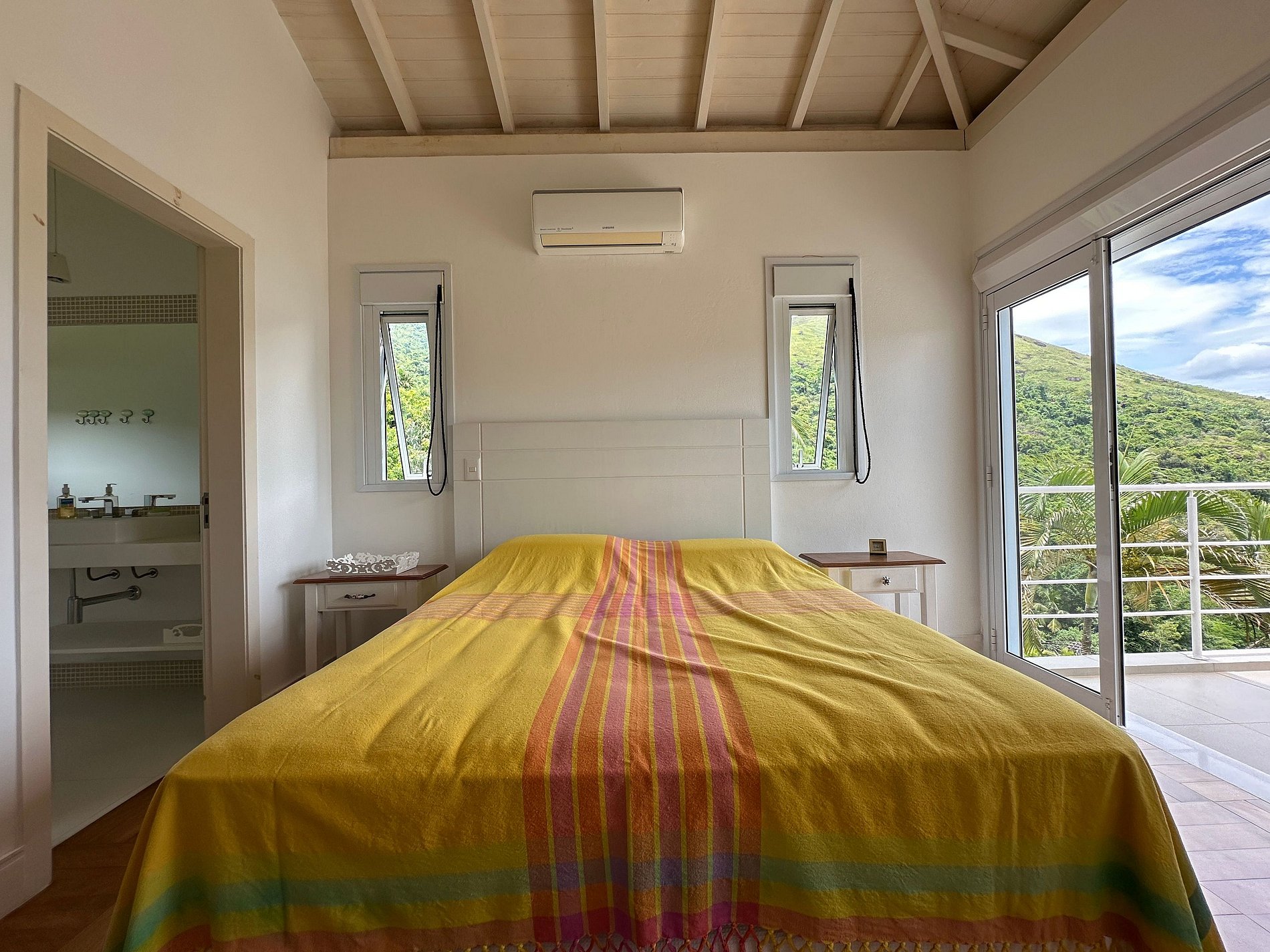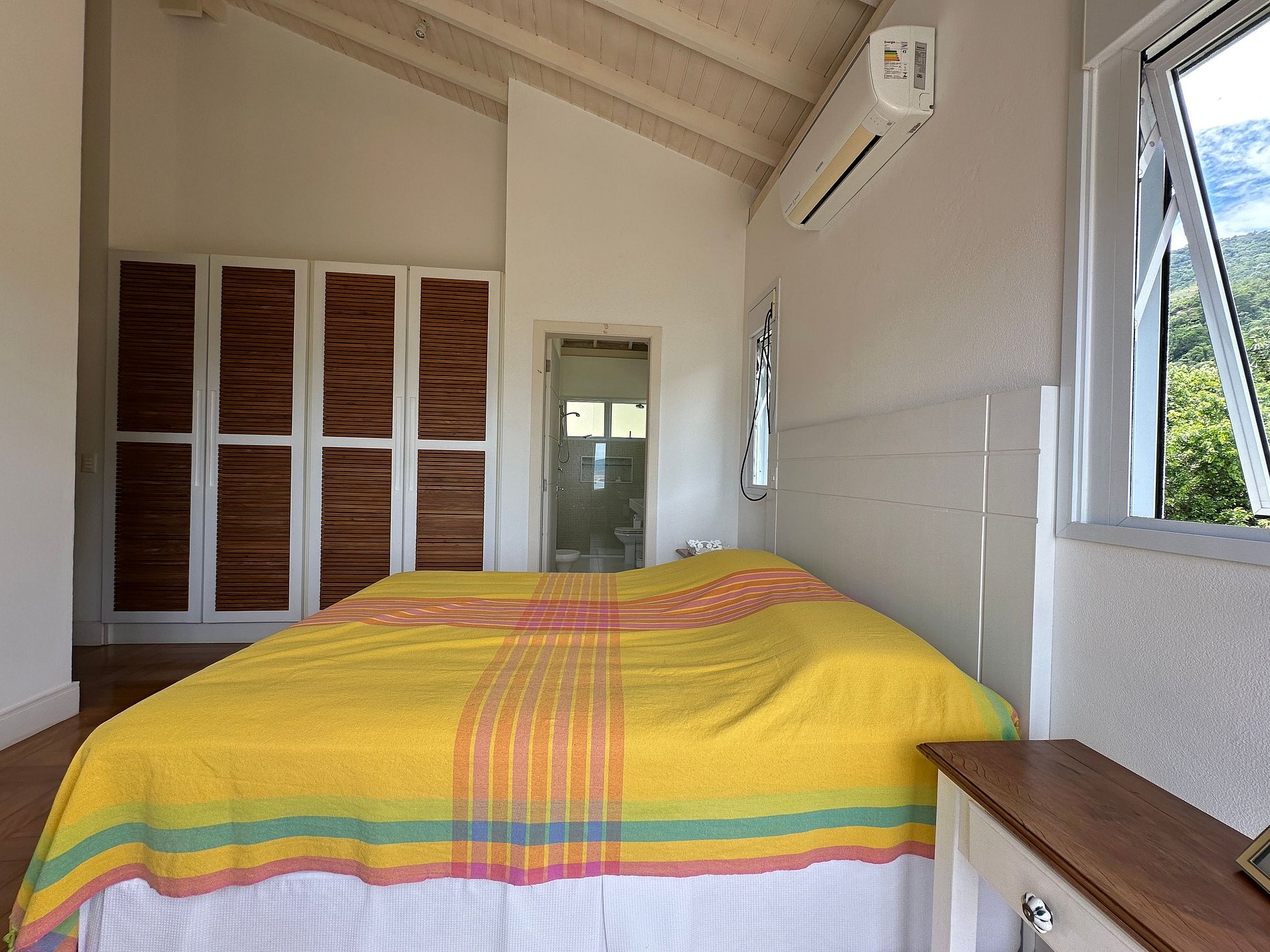 São 3 suítes e 2 quartos, todos com enxoval completo e ar-condicionado, na seguinte configuração: