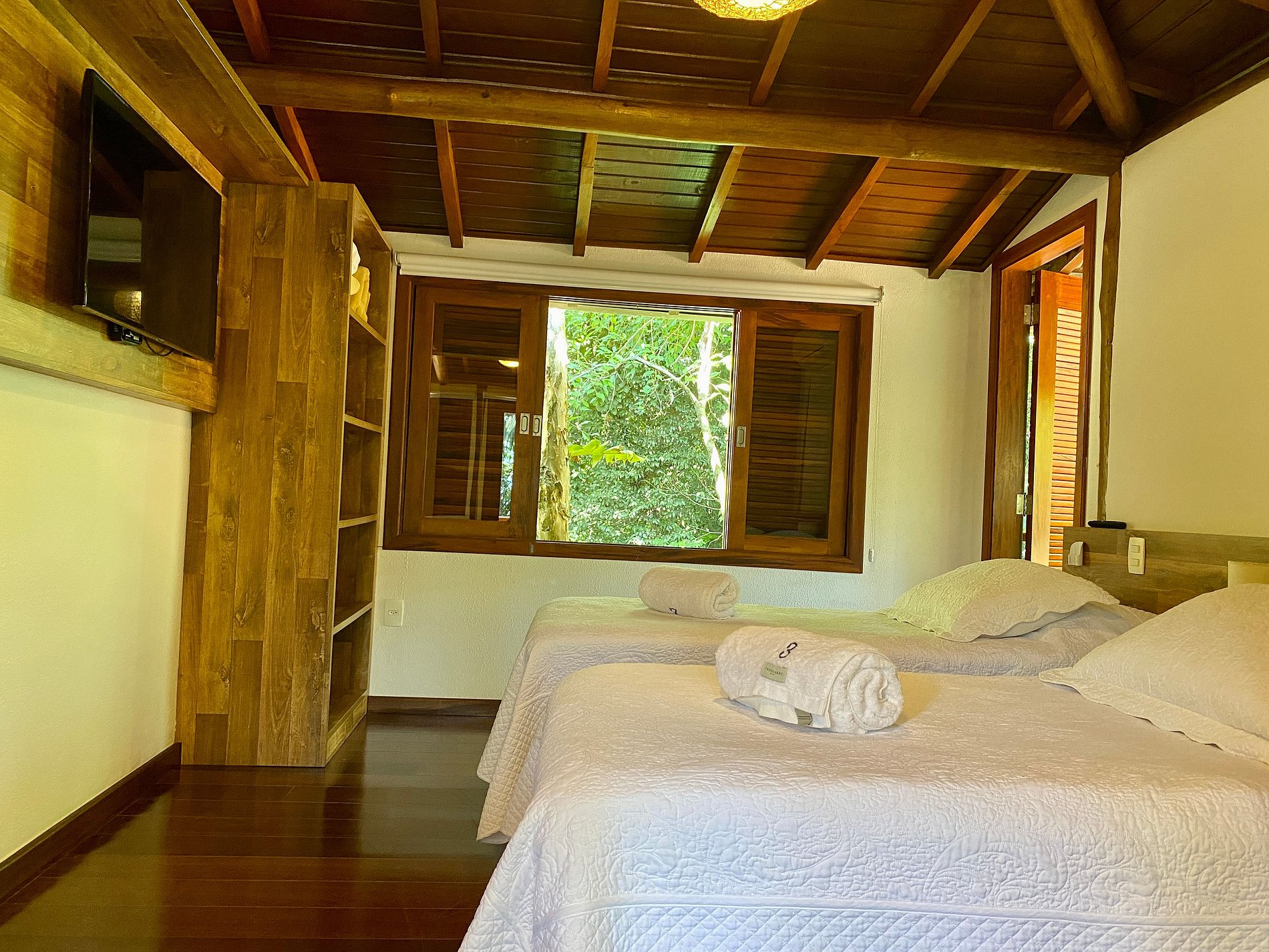 Suíte 1 - Andar superior: 1 cama de casal queen e 2 camas de solteiro com bicama, dois ambientes que dividem o mesmo banheiro;