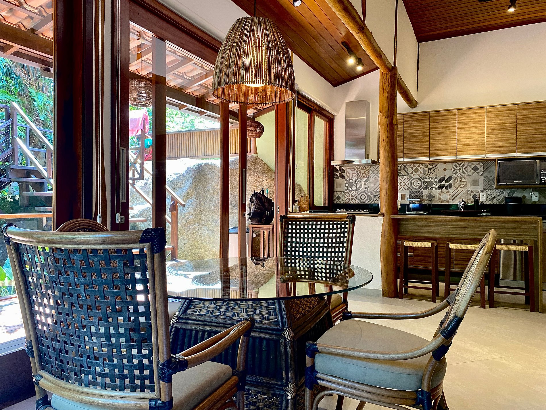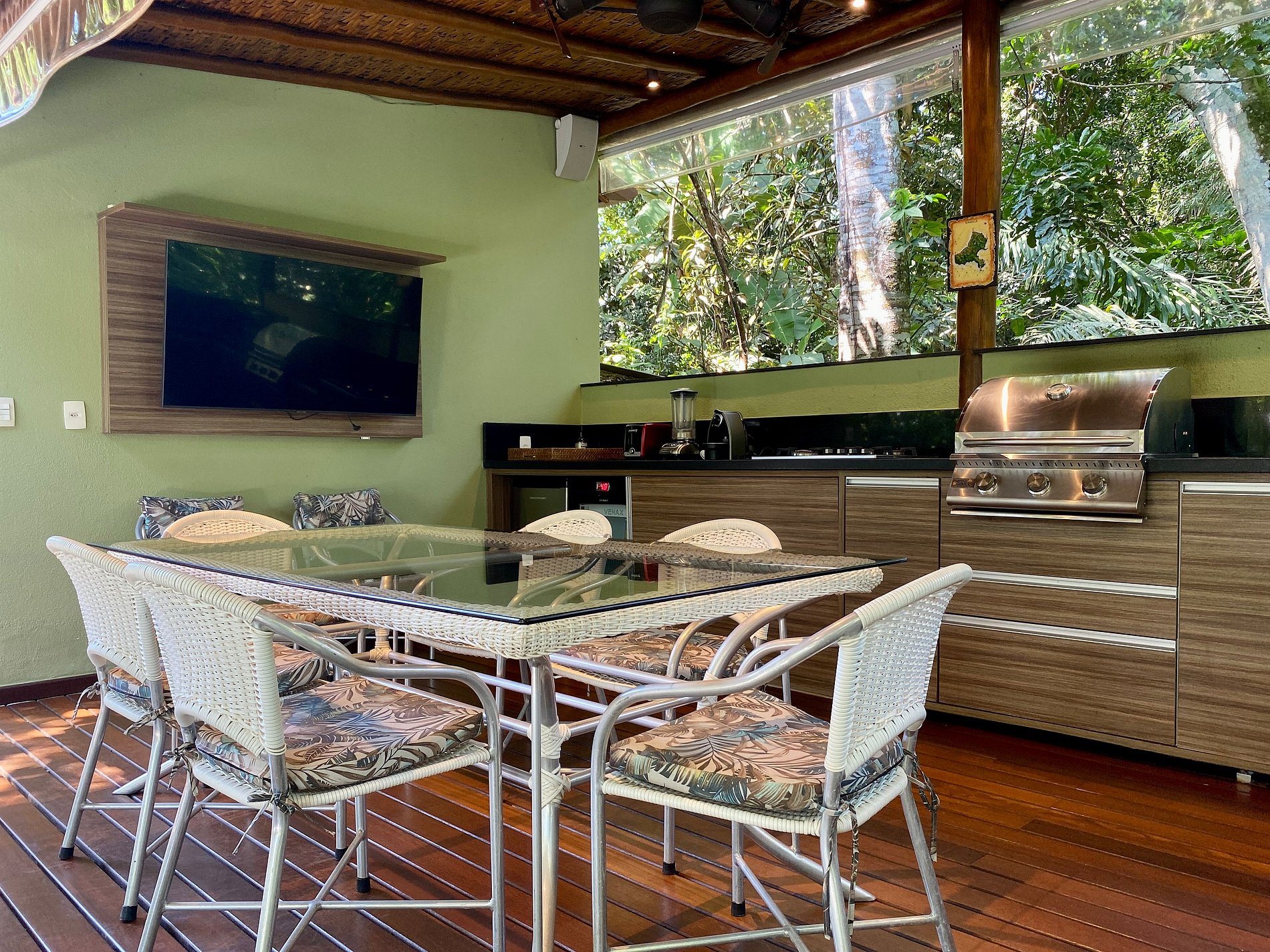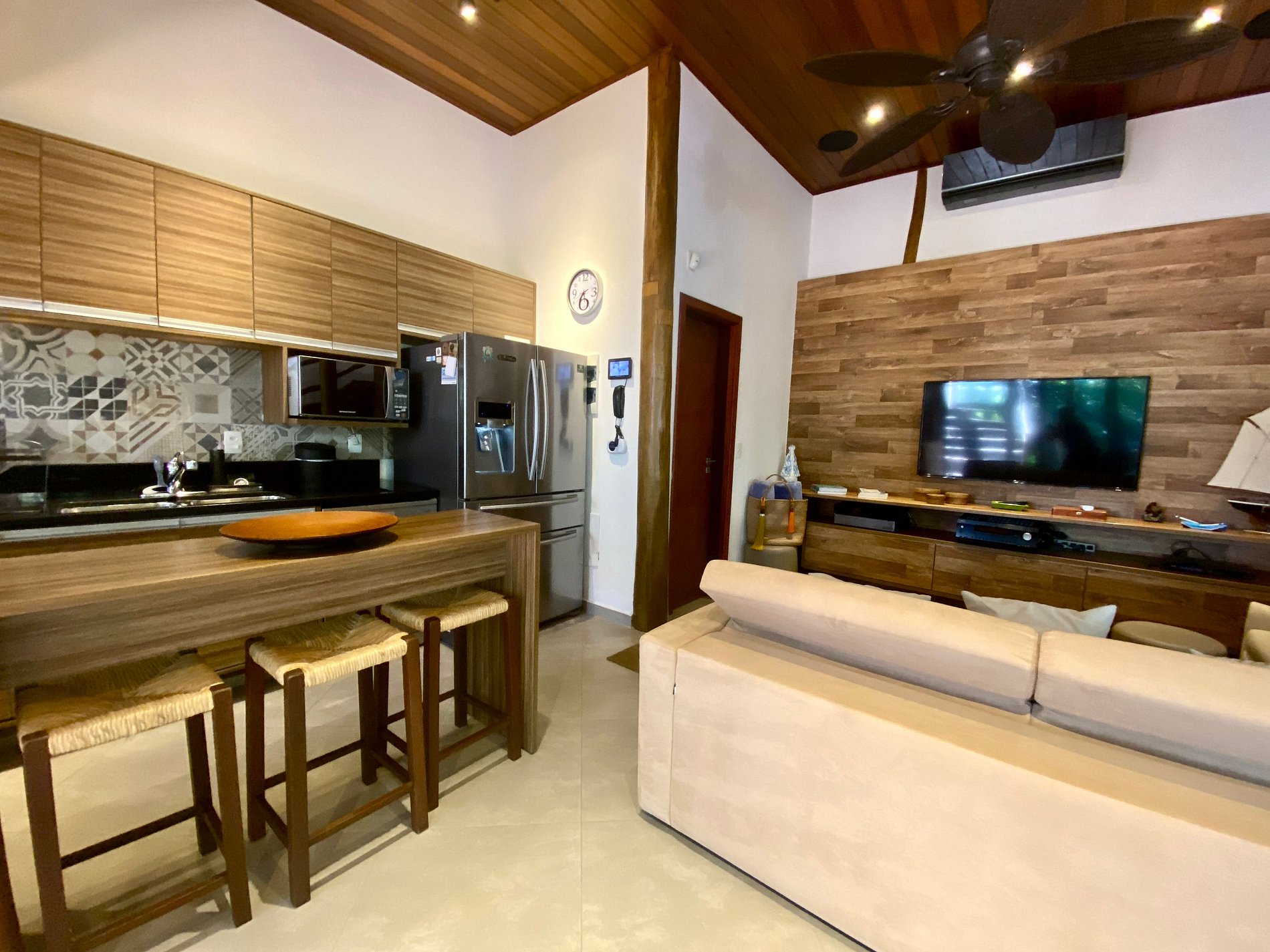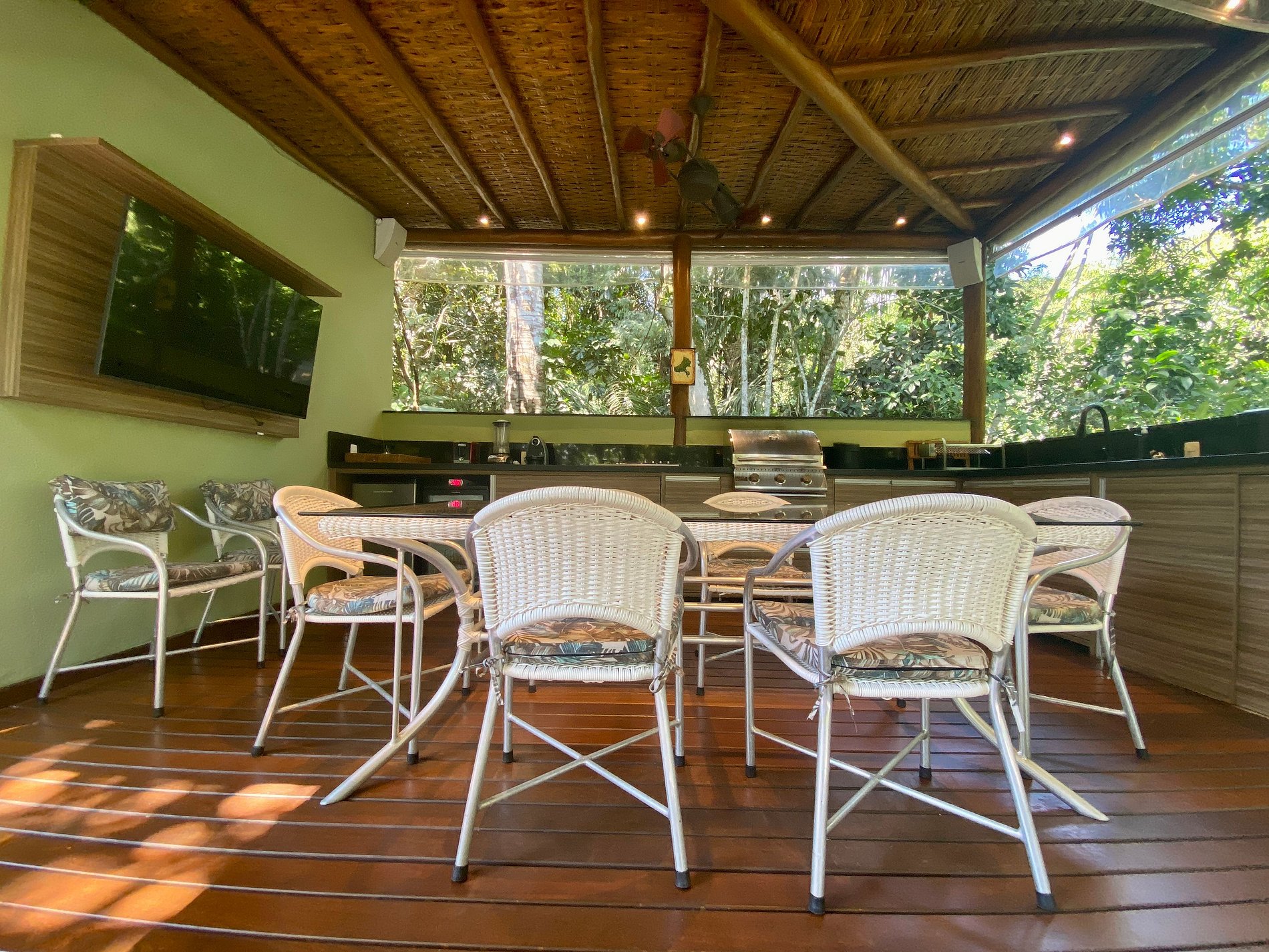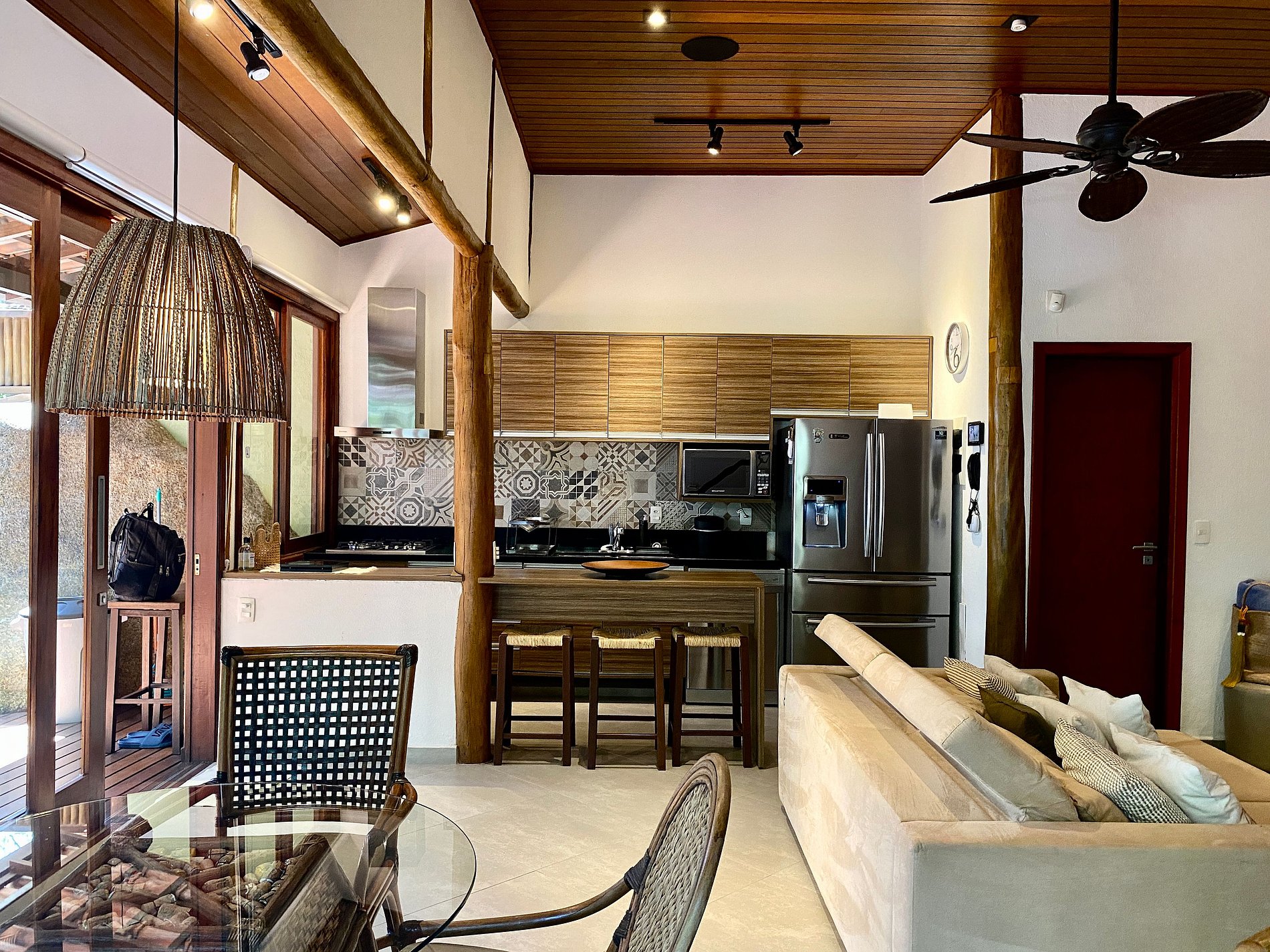 - Área interna muito aconchegante e com uma decoração de muito bom gosto, conta com banheiro completo, salas de estar, jantar e cozinha completa, em ambiente totalmente integrado, com ar-condicionado;