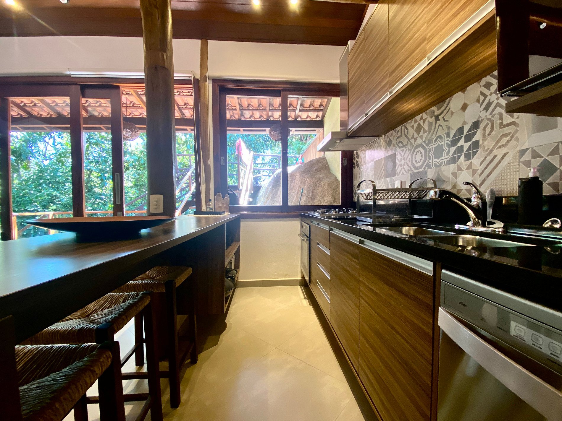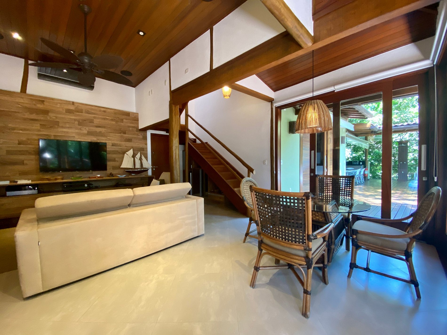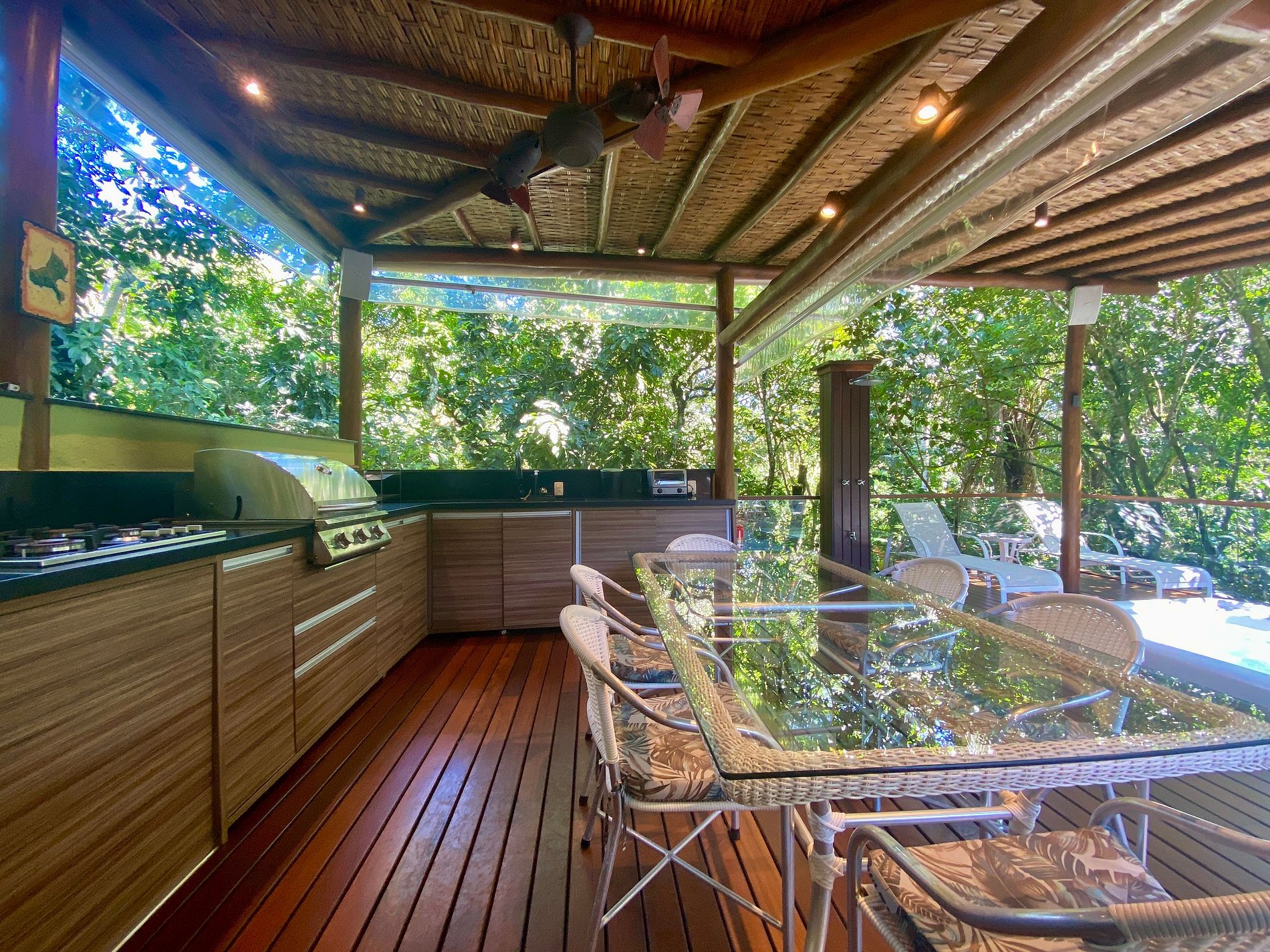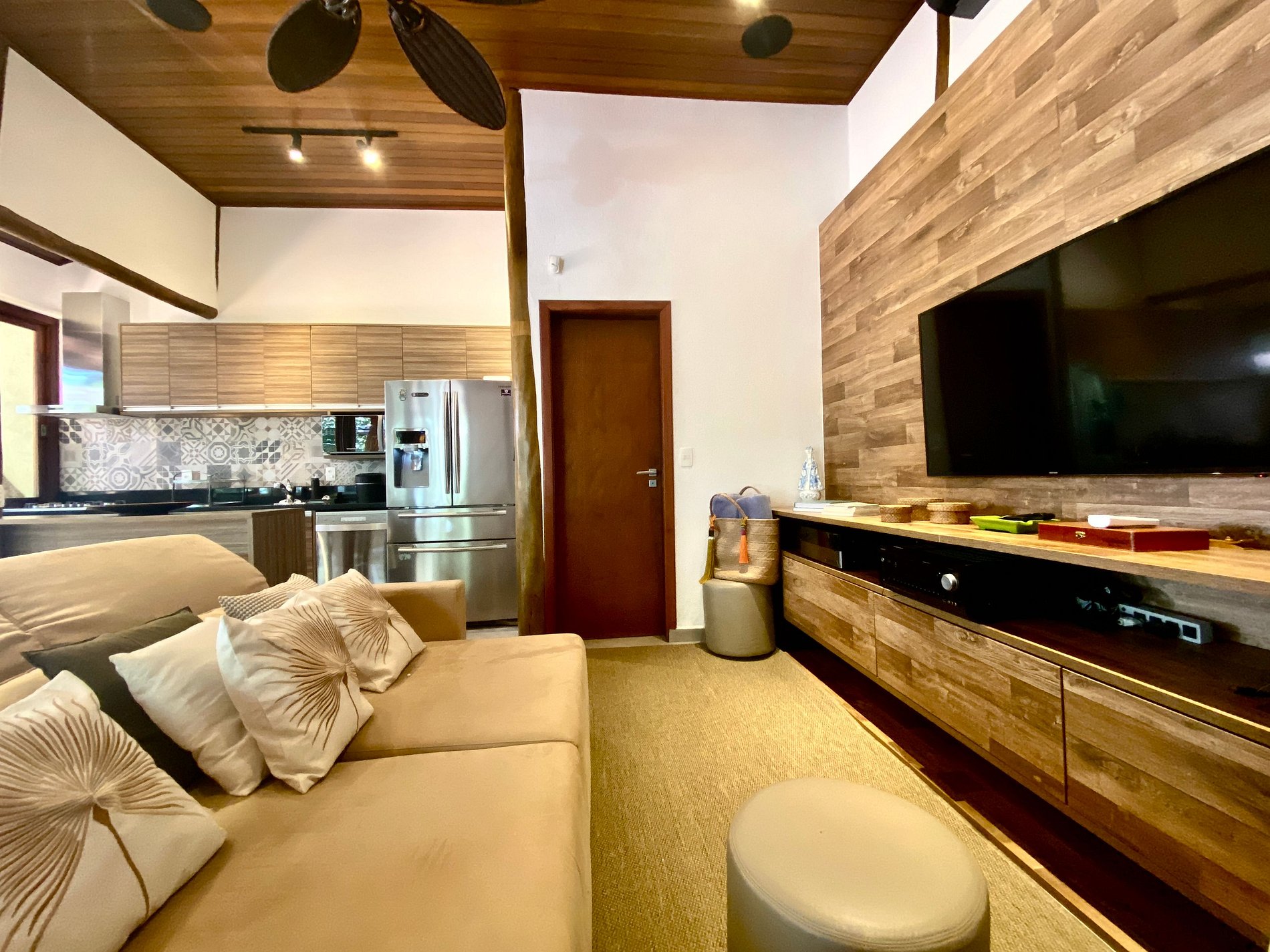 - Área interna muito aconchegante e com uma decoração de muito bom gosto, conta com banheiro completo, salas de estar, jantar e cozinha completa, em ambiente totalmente integrado, com ar-condicionado;