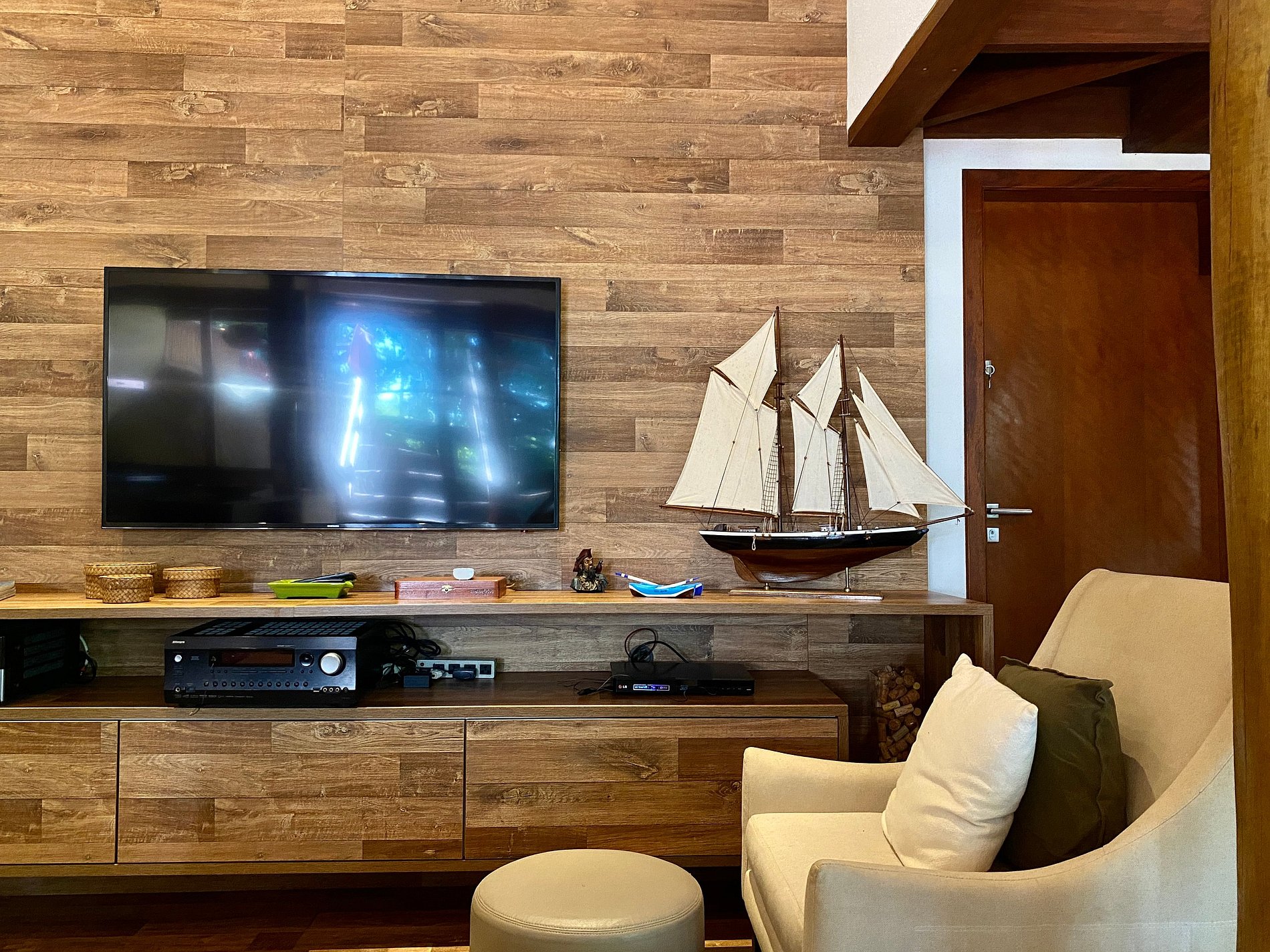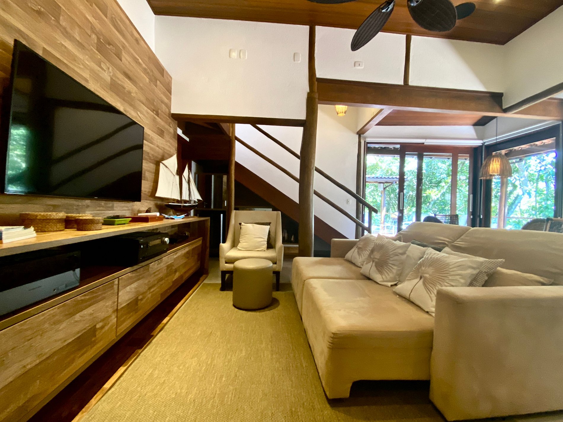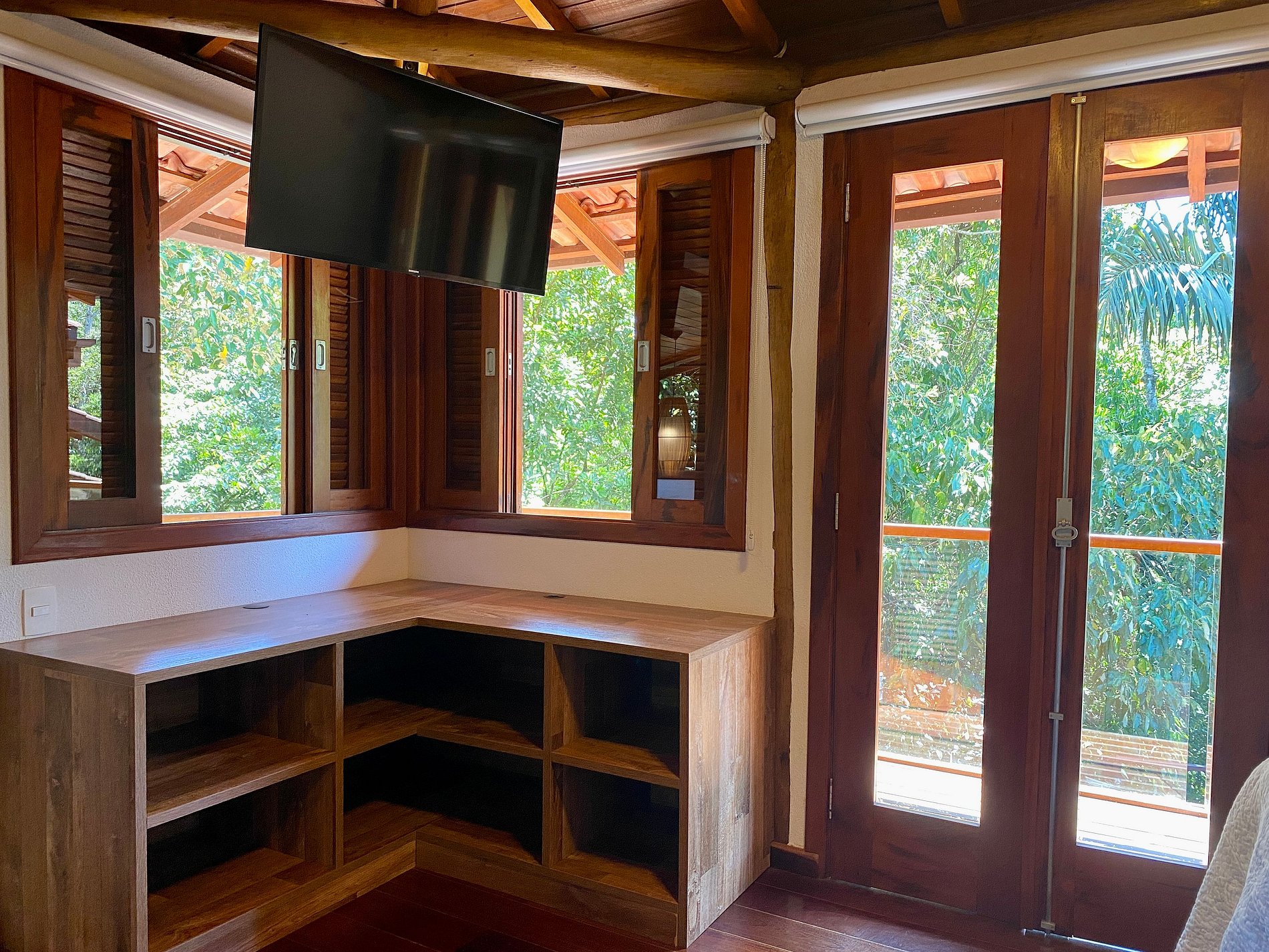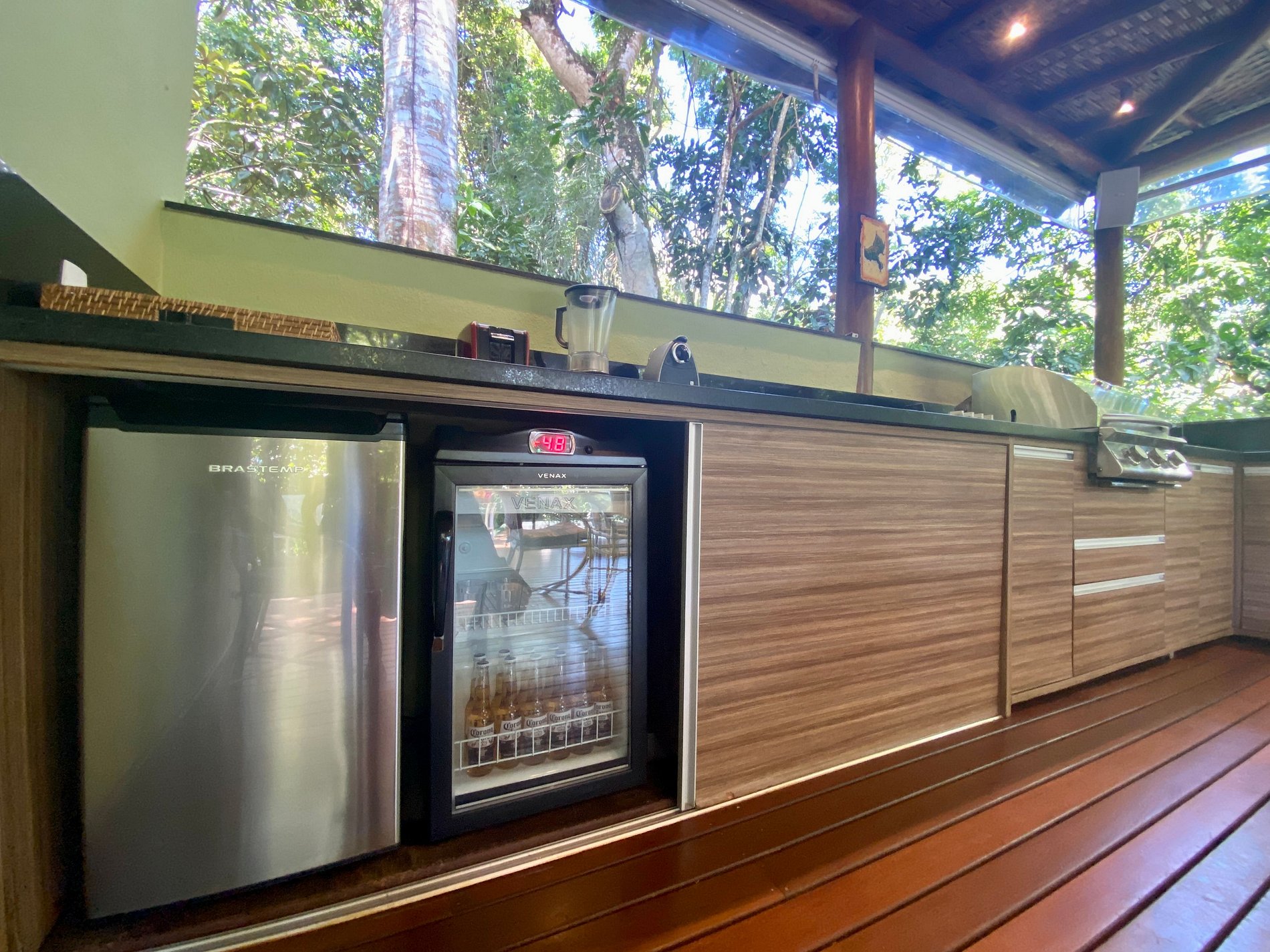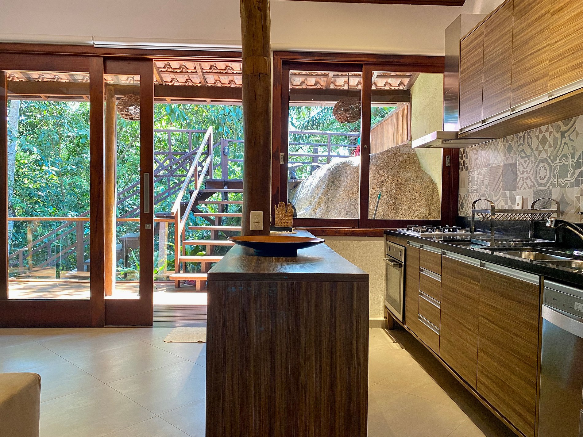 - Área interna muito aconchegante e com uma decoração de muito bom gosto, conta com banheiro completo, salas de estar, jantar e cozinha completa, em ambiente totalmente integrado, com ar-condicionado;