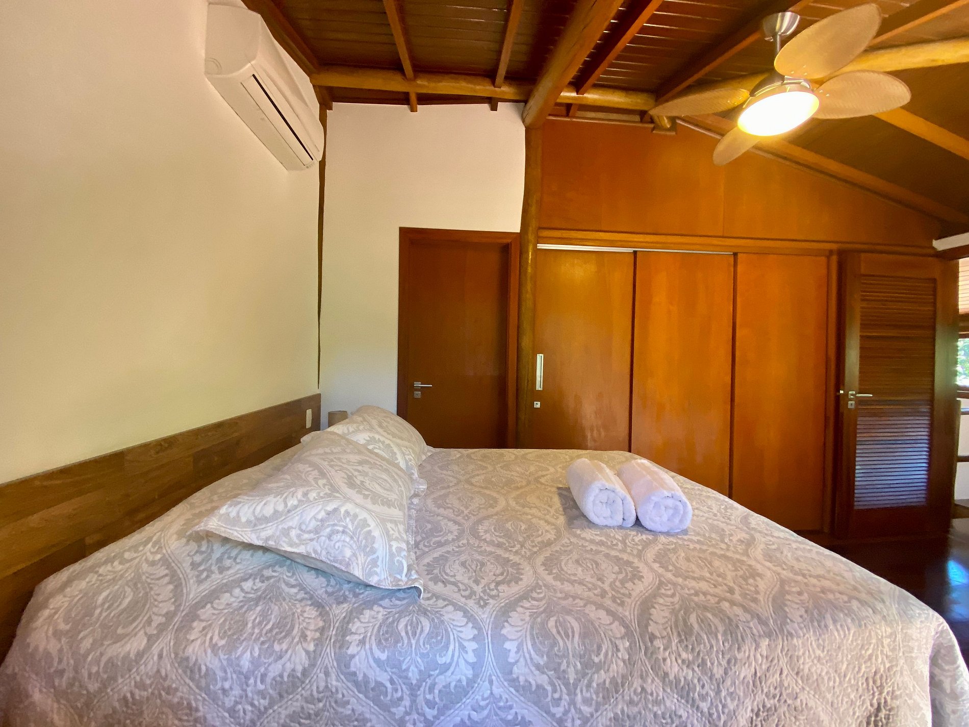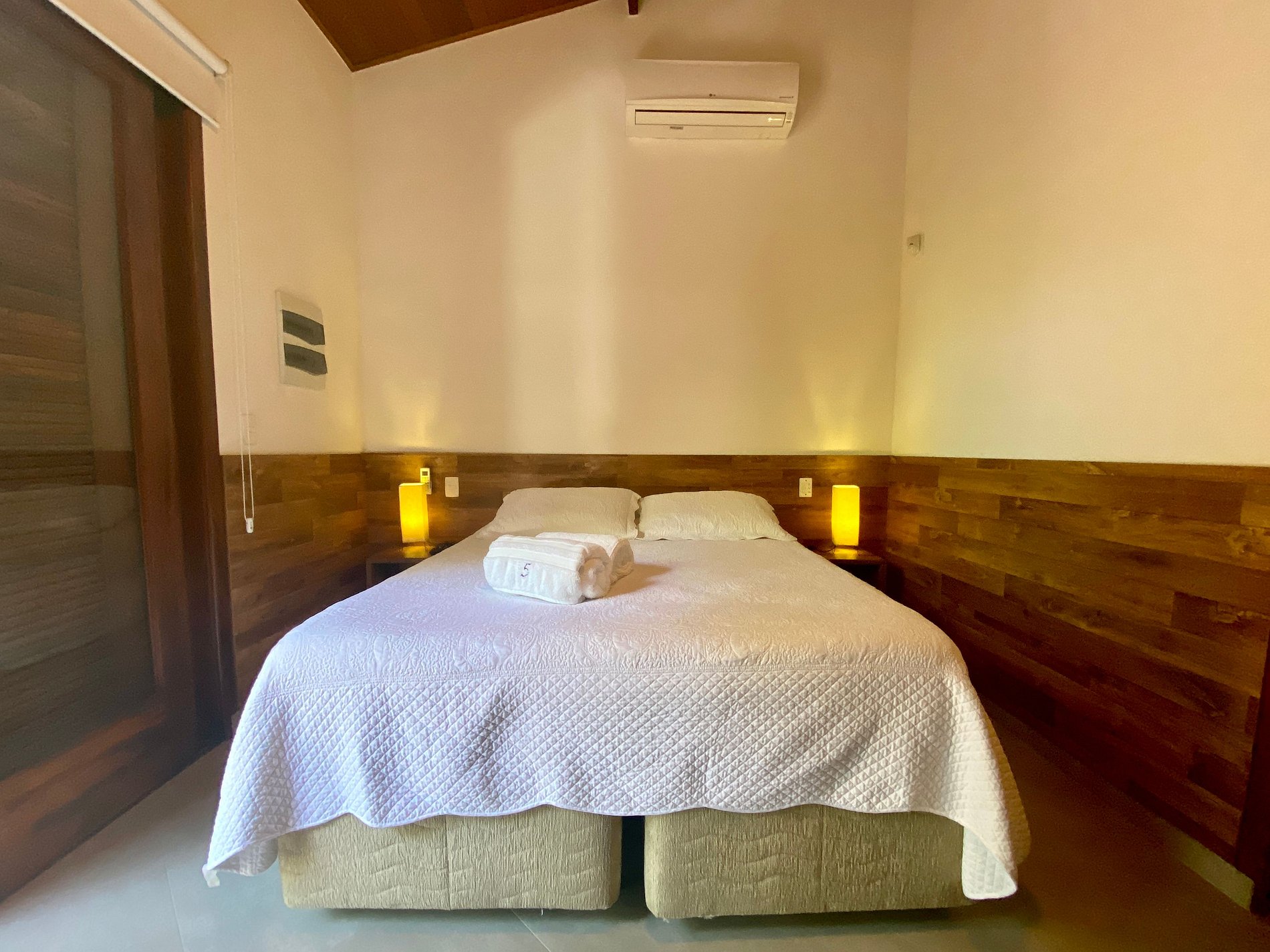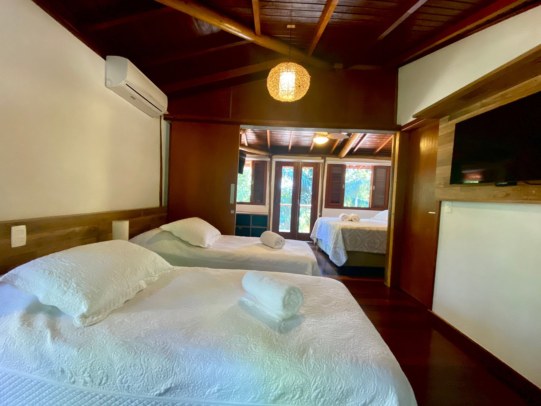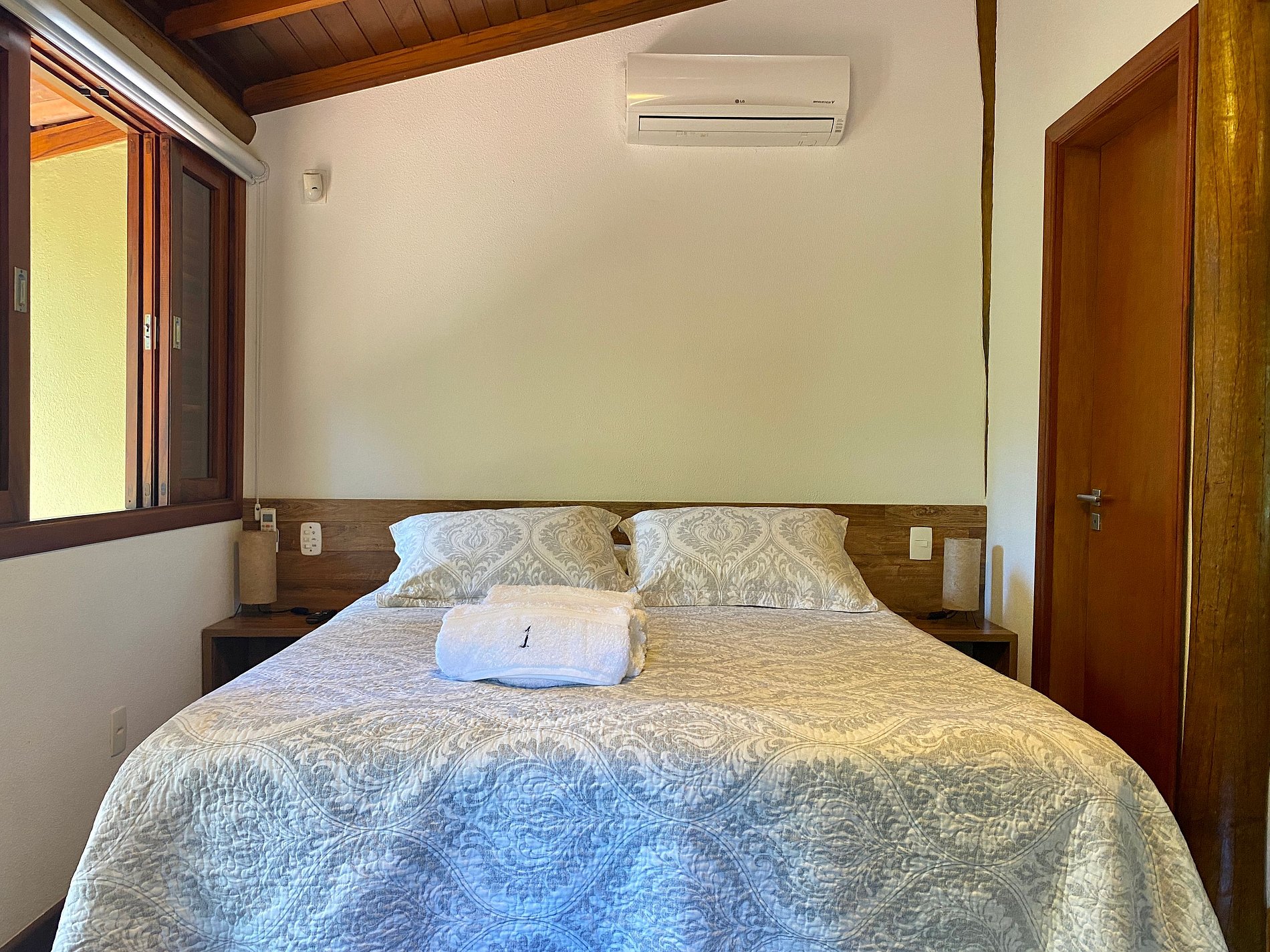 - São 2 suítes, ambas com ar-condicionado, enxoval completo, na seguinte configuração: