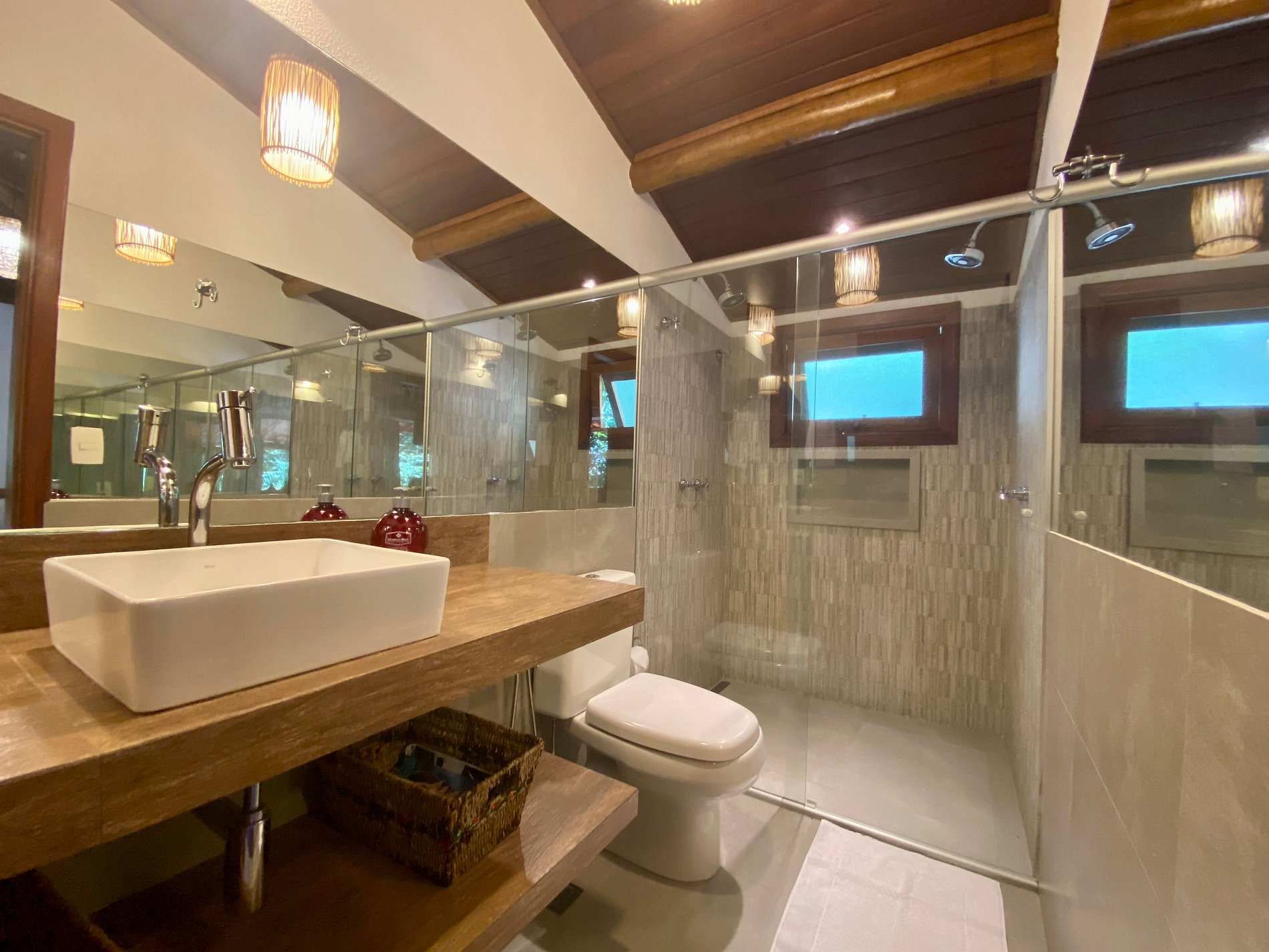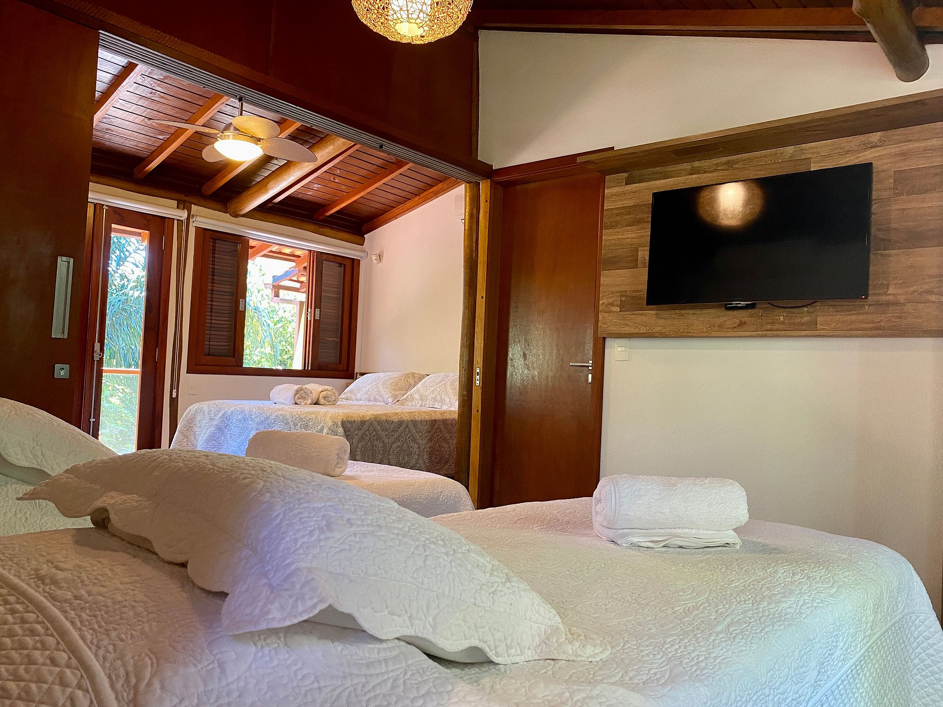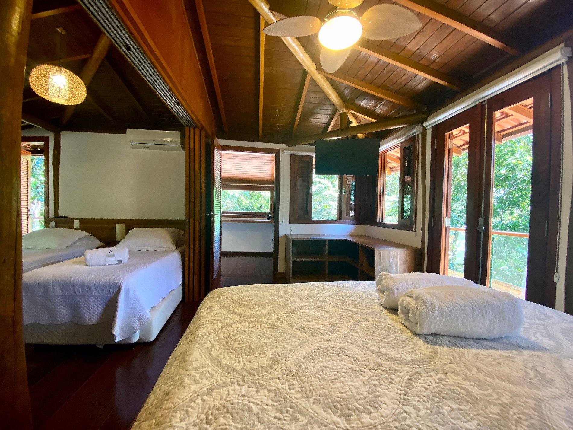 Suíte 1 - Andar superior: 1 cama de casal queen e 2 camas de solteiro com bicama, dois ambientes que dividem o mesmo banheiro;