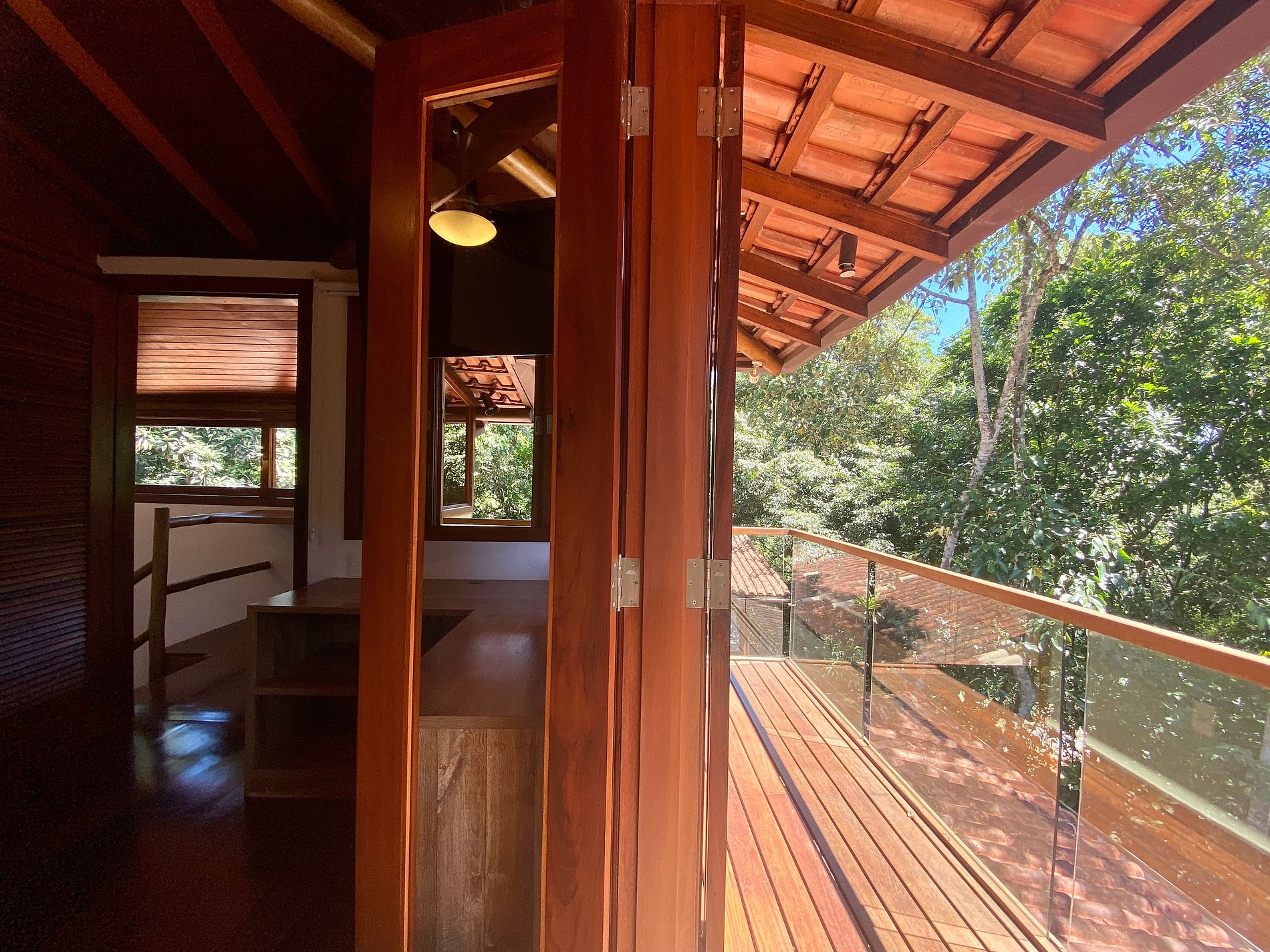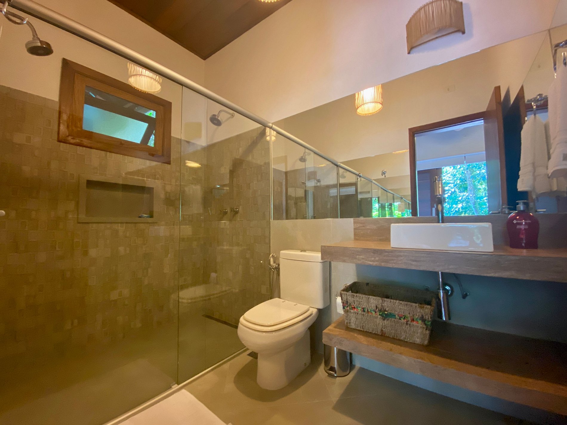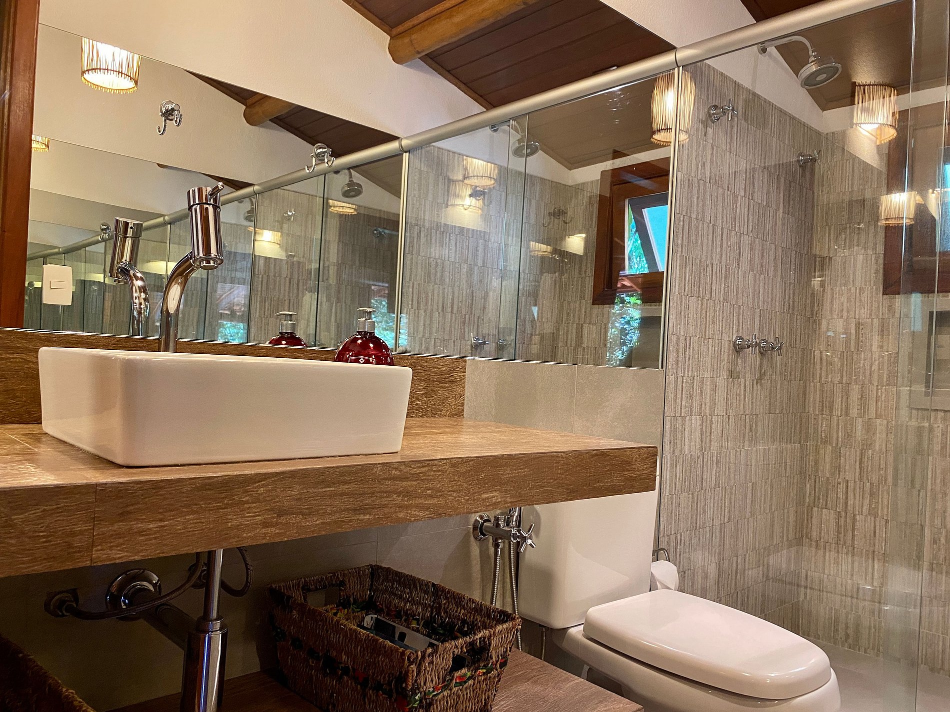 Suíte 1 - Andar superior: 1 cama de casal queen e 2 camas de solteiro com bicama, dois ambientes que dividem o mesmo banheiro;