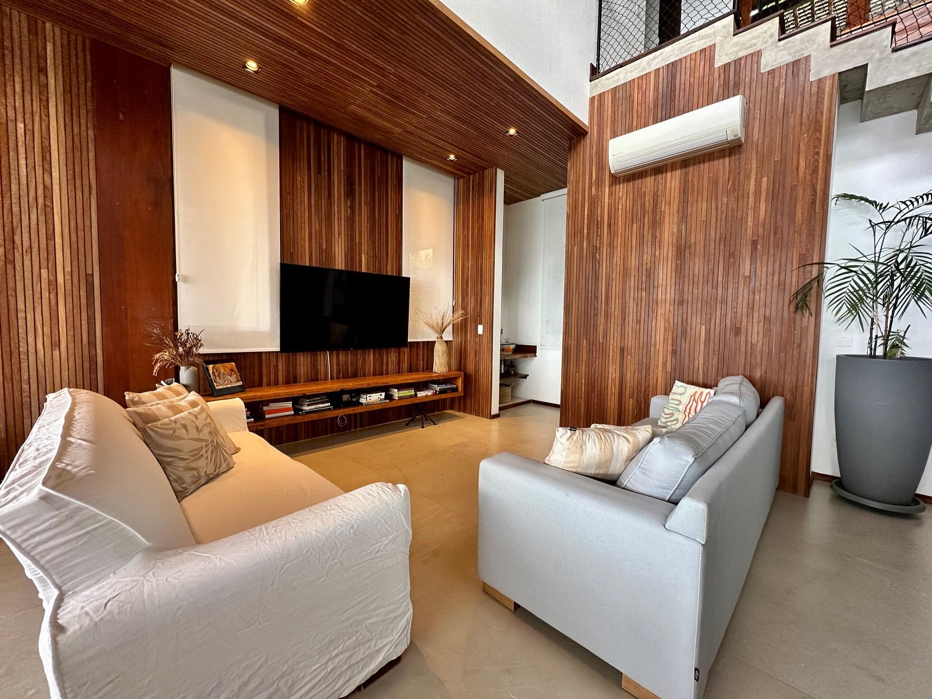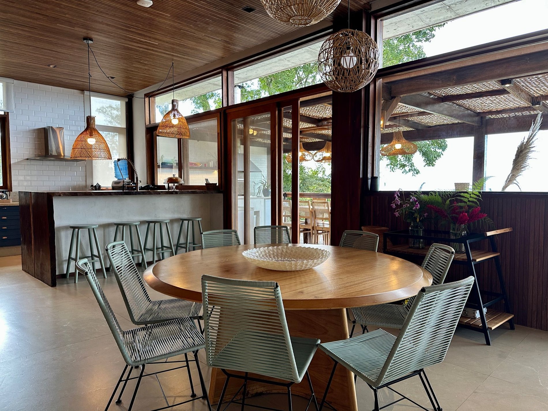 - Toda área interna é climatizada (3 aparelhos de ar-condicionado), com decoração de muito bom gosto, salas de estar, jantar, TV e cozinha completa, em ambiente integrado, iluminado e muito arejado. Conta com um lavabo de apoio;