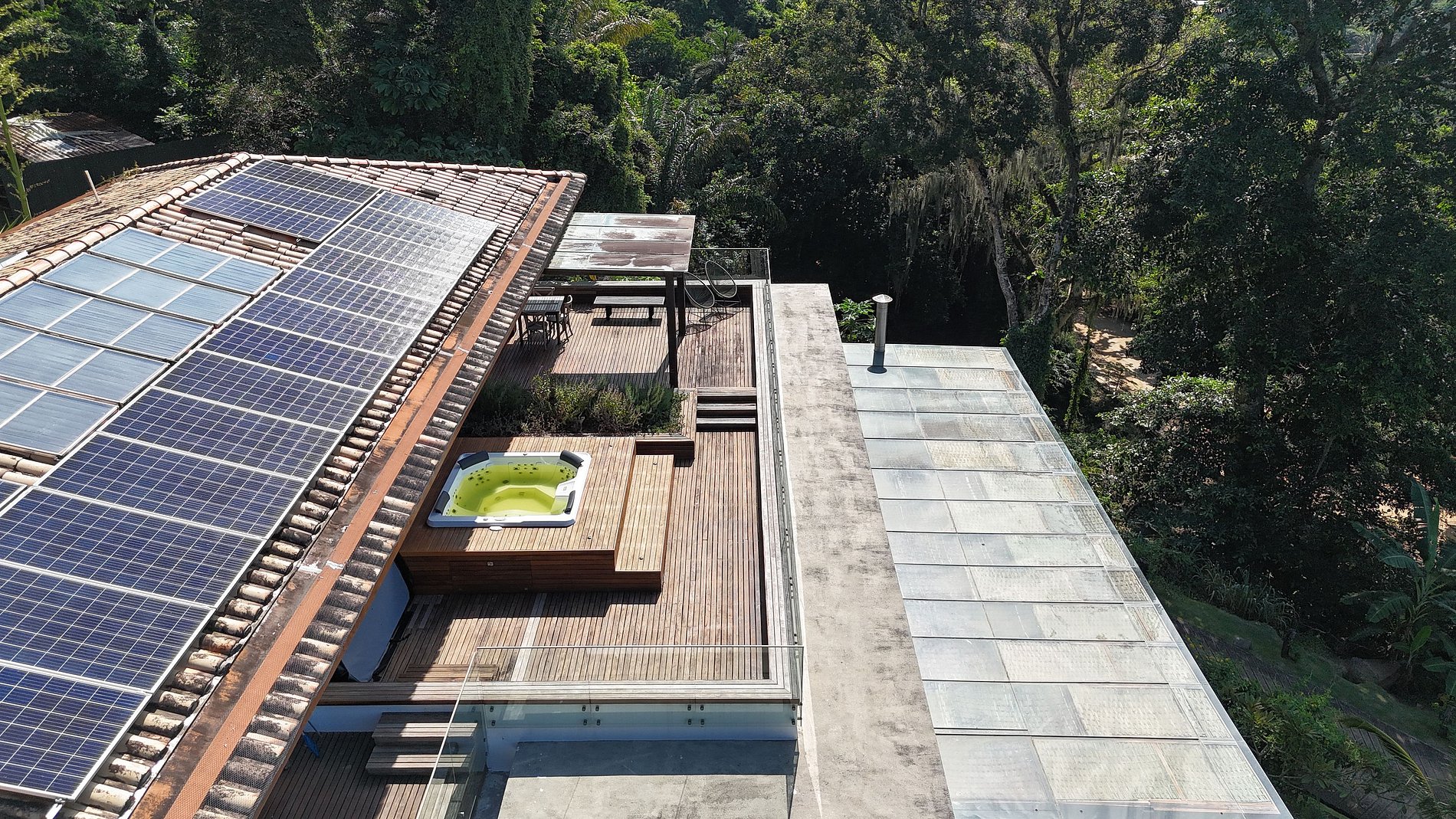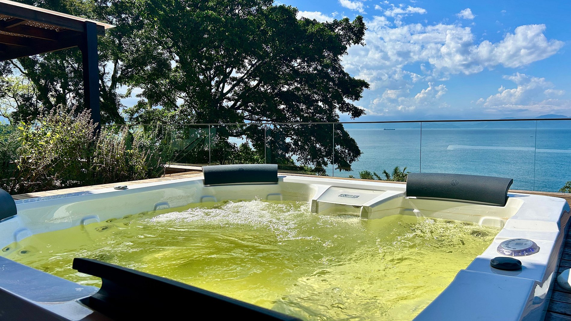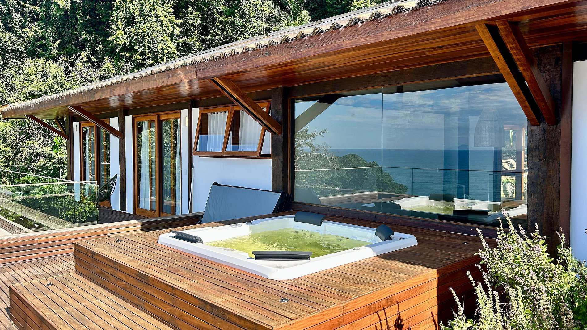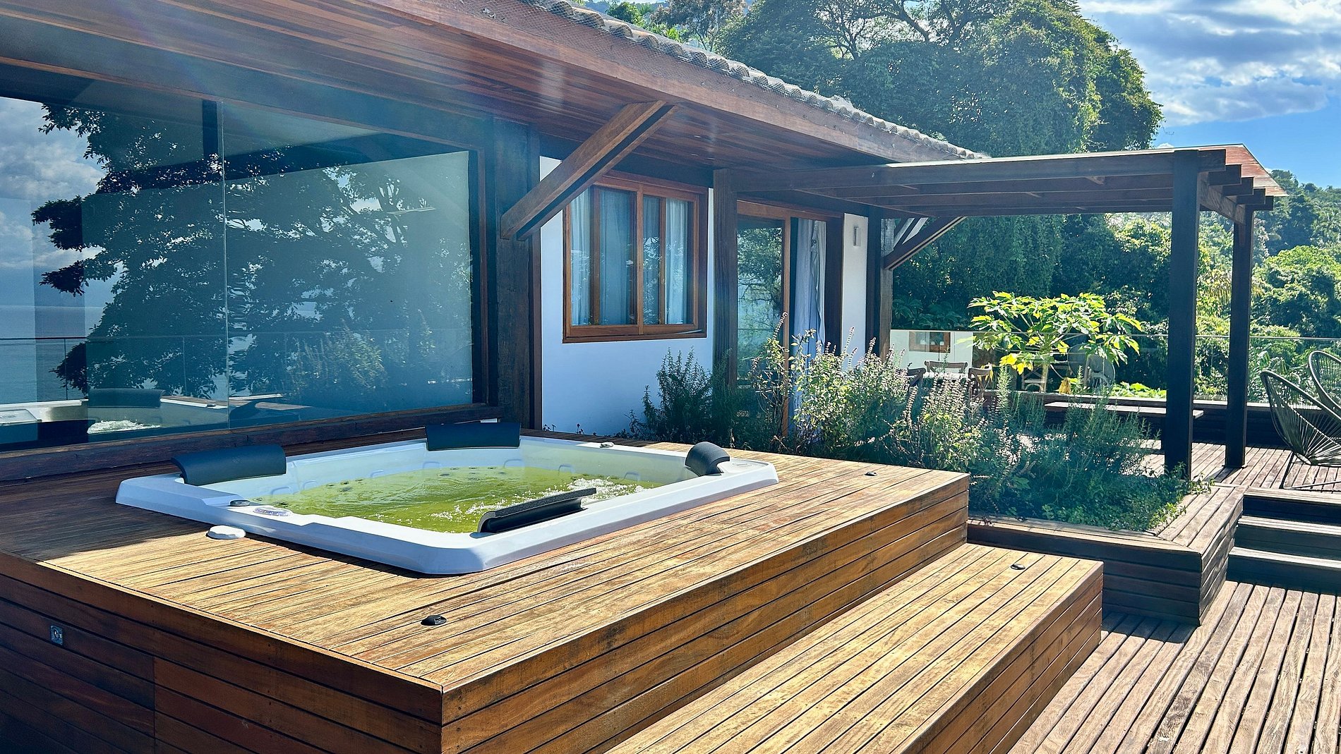 - Na parte superior da casa uma jacuzzi com aquecimento e deck de madeira. Um local pensado para relaxar e descansar, apreciando a bela vista mar e montanha;