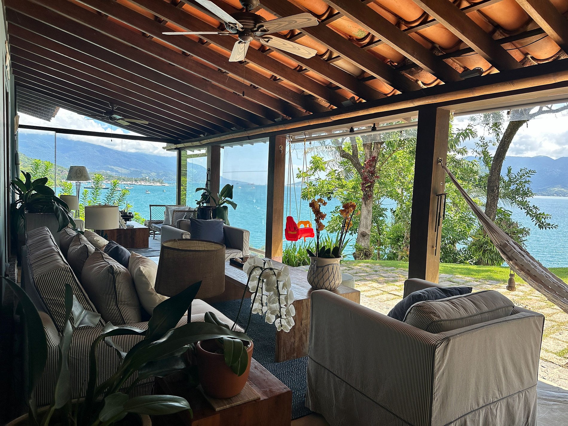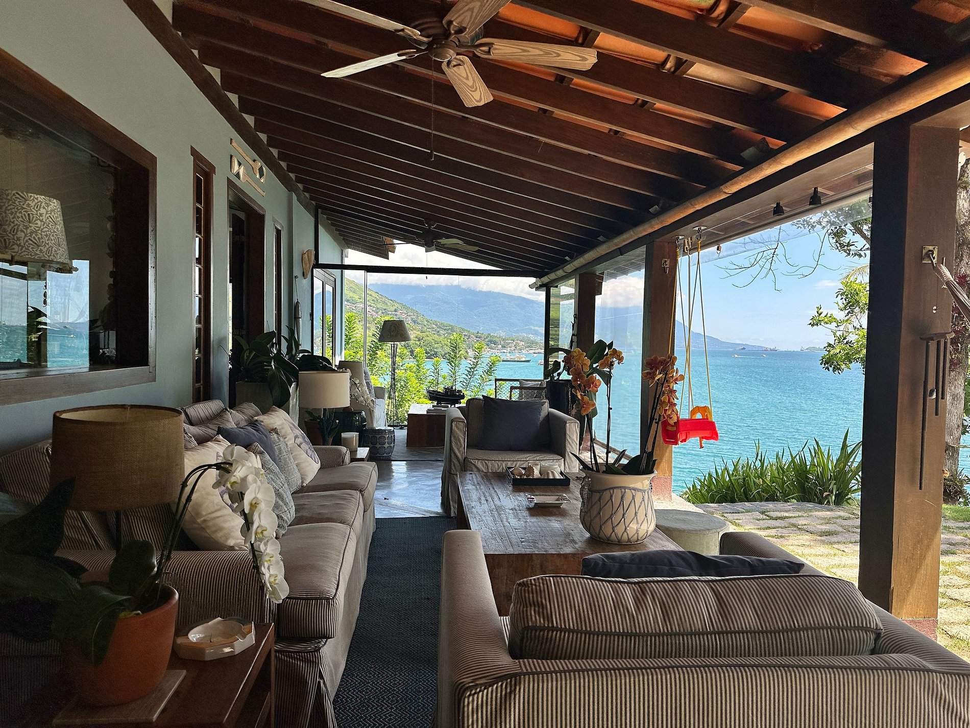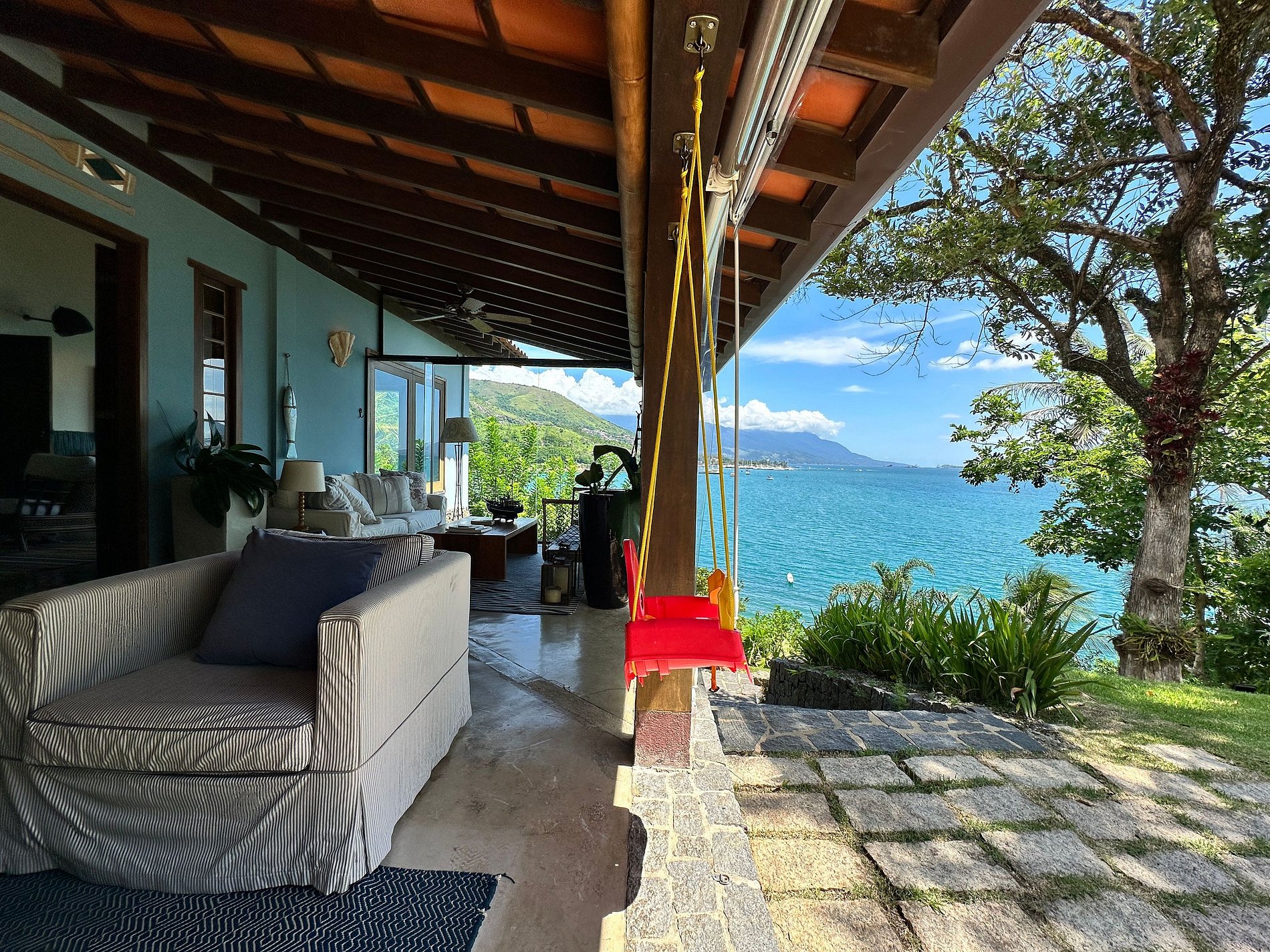 - Ampla varanda com mobiliada, com redes e de frente para um agradável jardim, com belíssima vista para o mar;