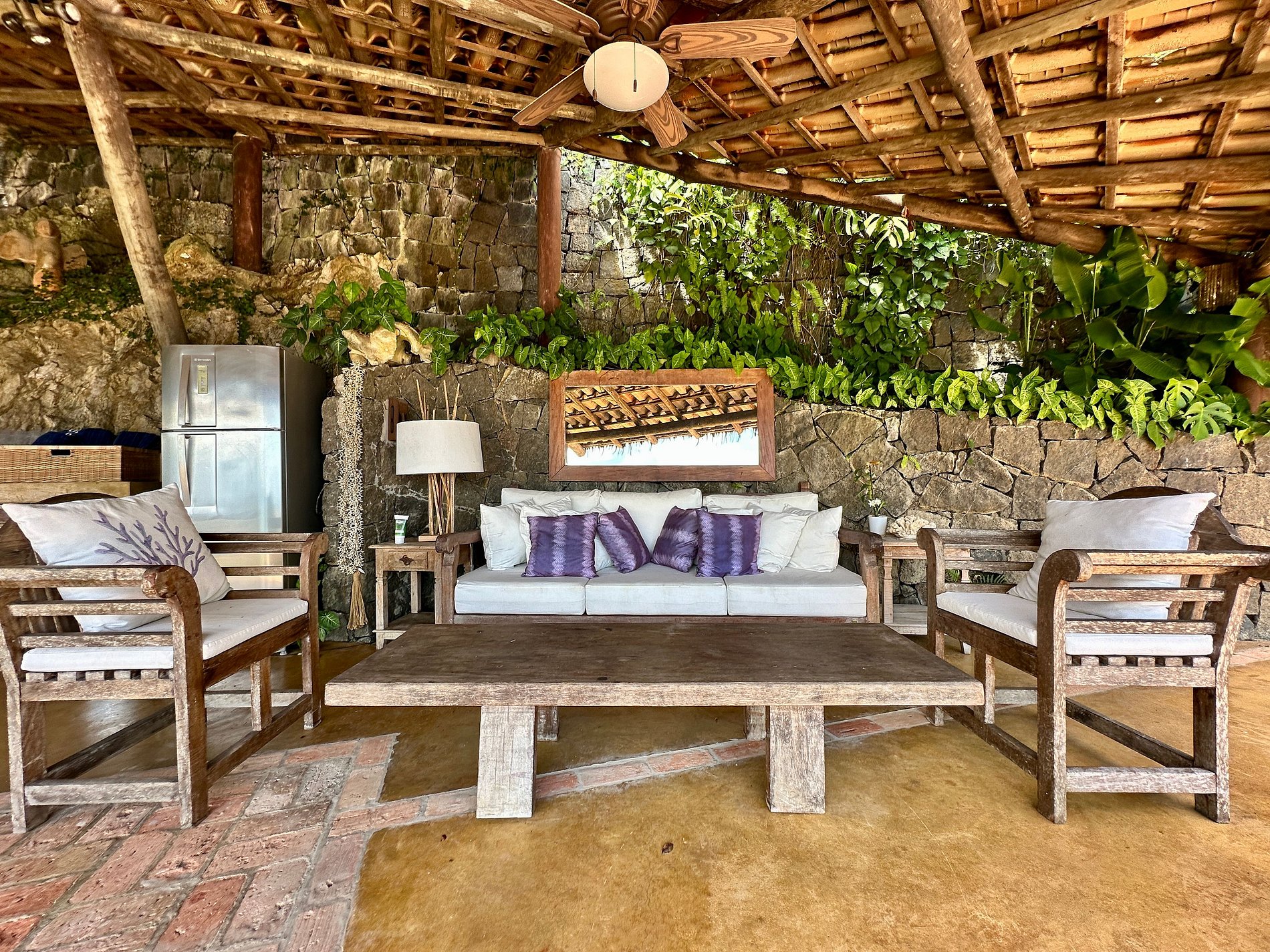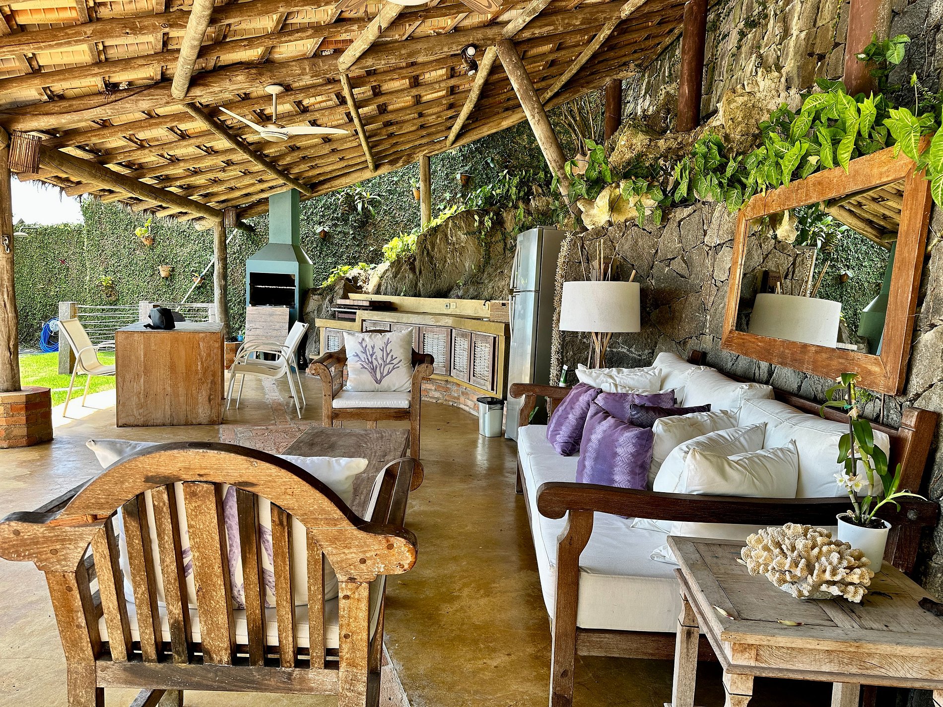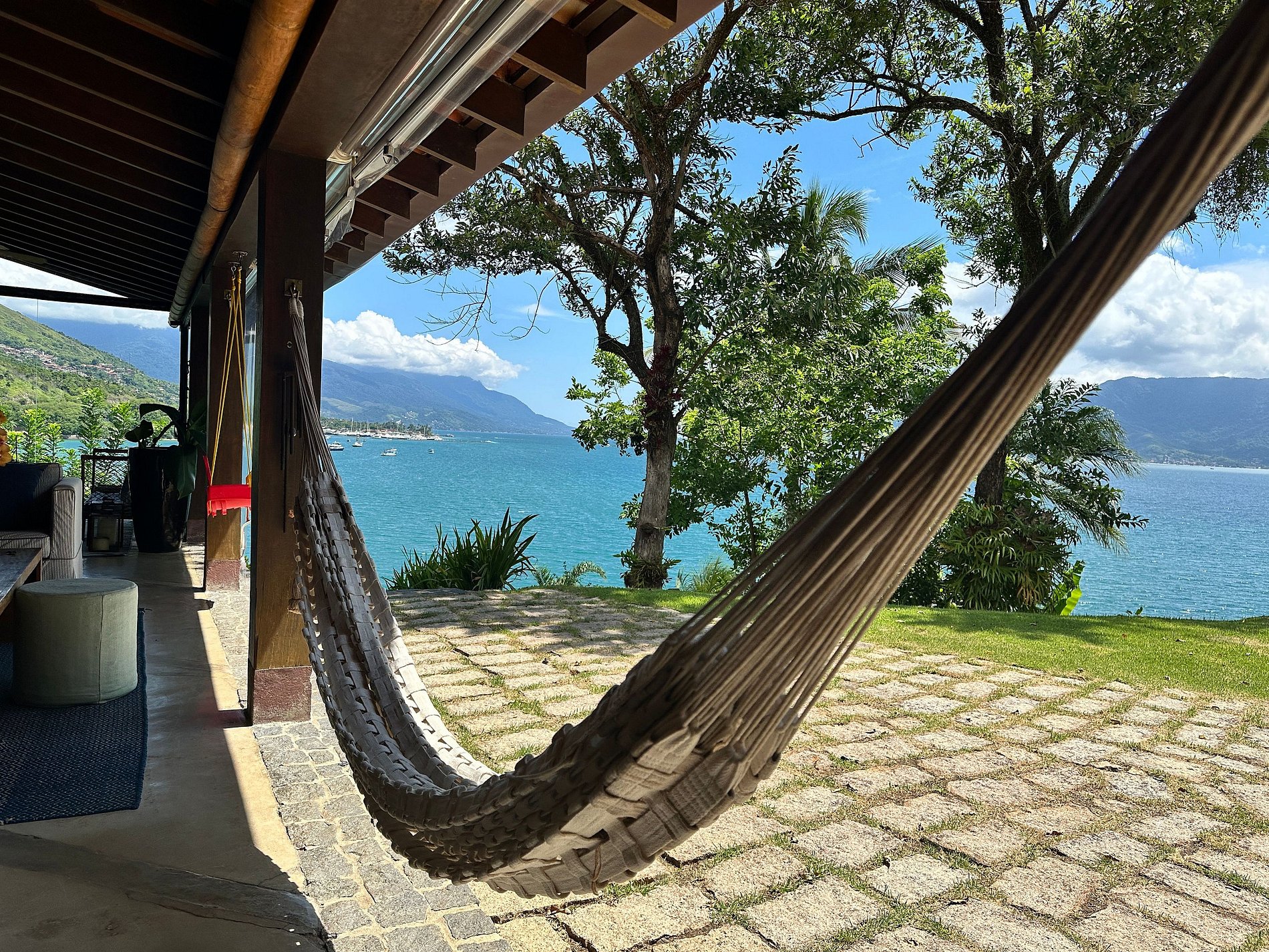 - Ampla varanda com mobiliada, com redes e de frente para um agradável jardim, com belíssima vista para o mar;