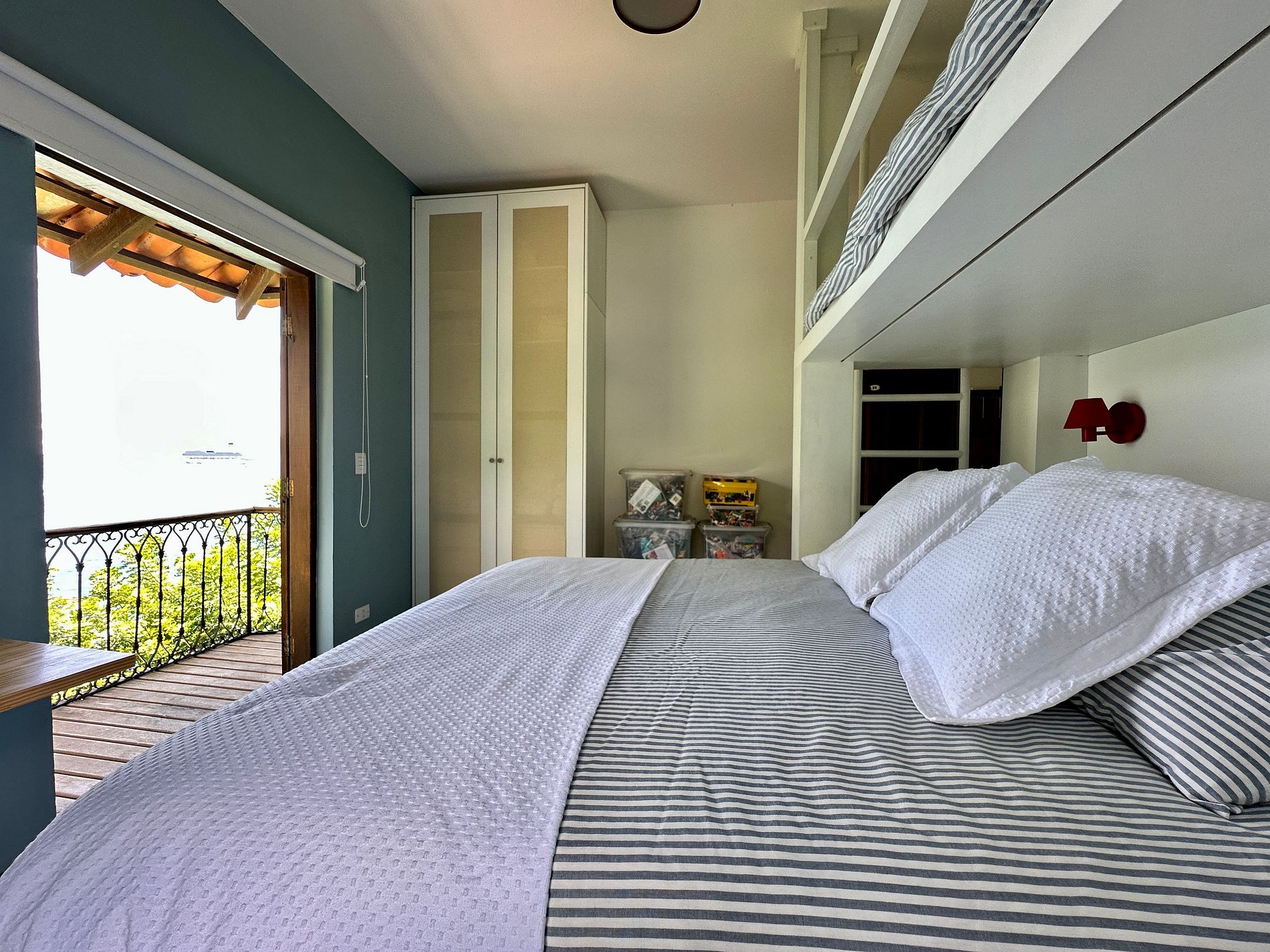 Quarto 1 (térreo) - 1 cama de casal, 1 cama de solteiro suspensa e varanda com vista para o mar;