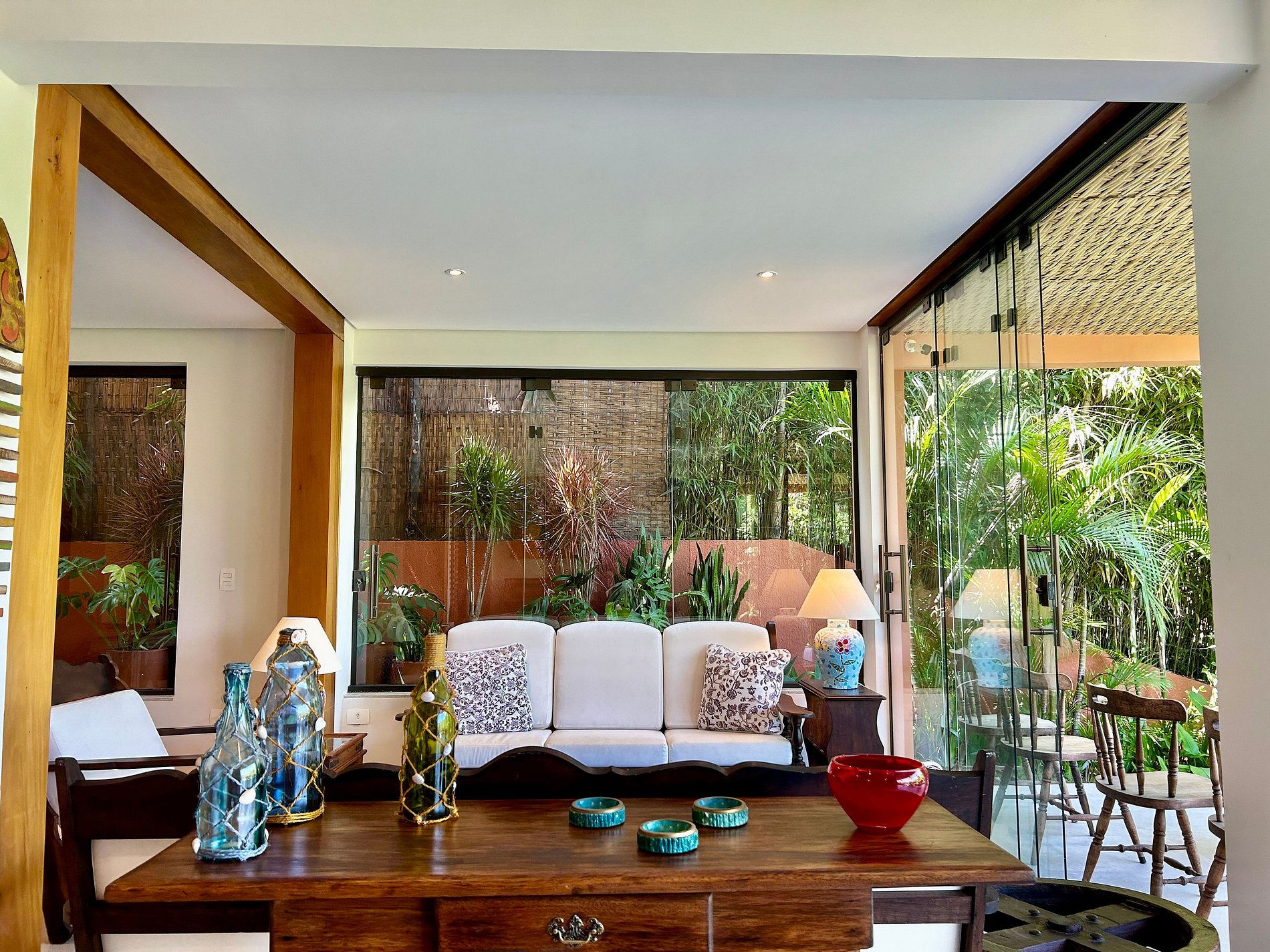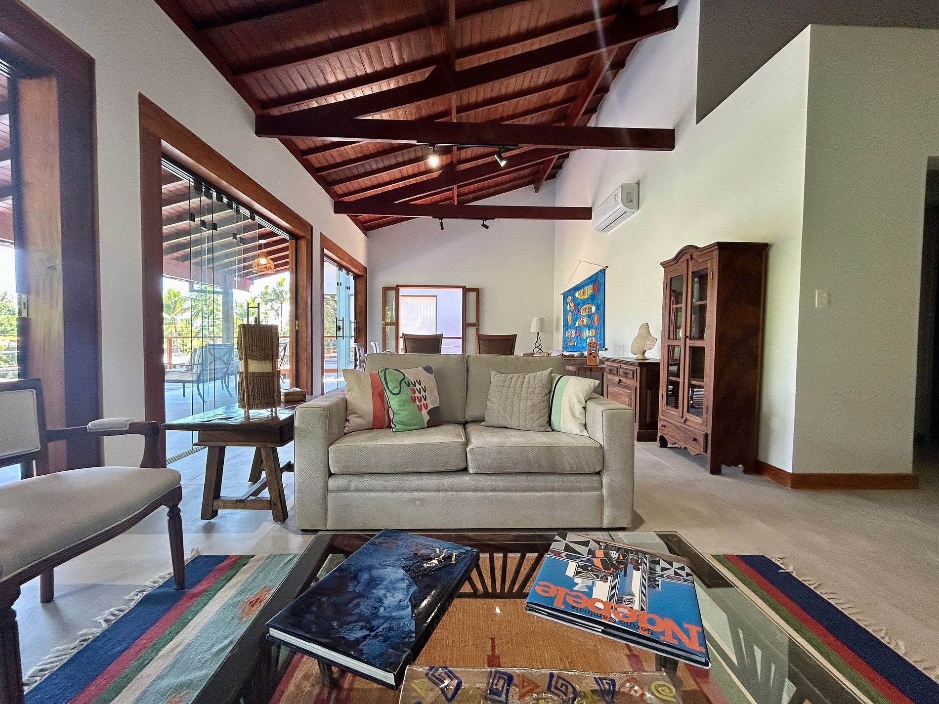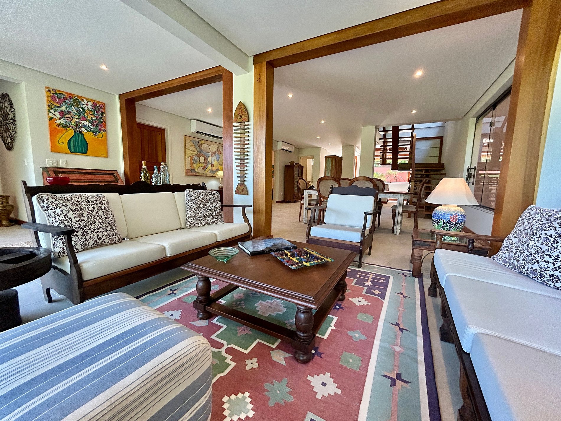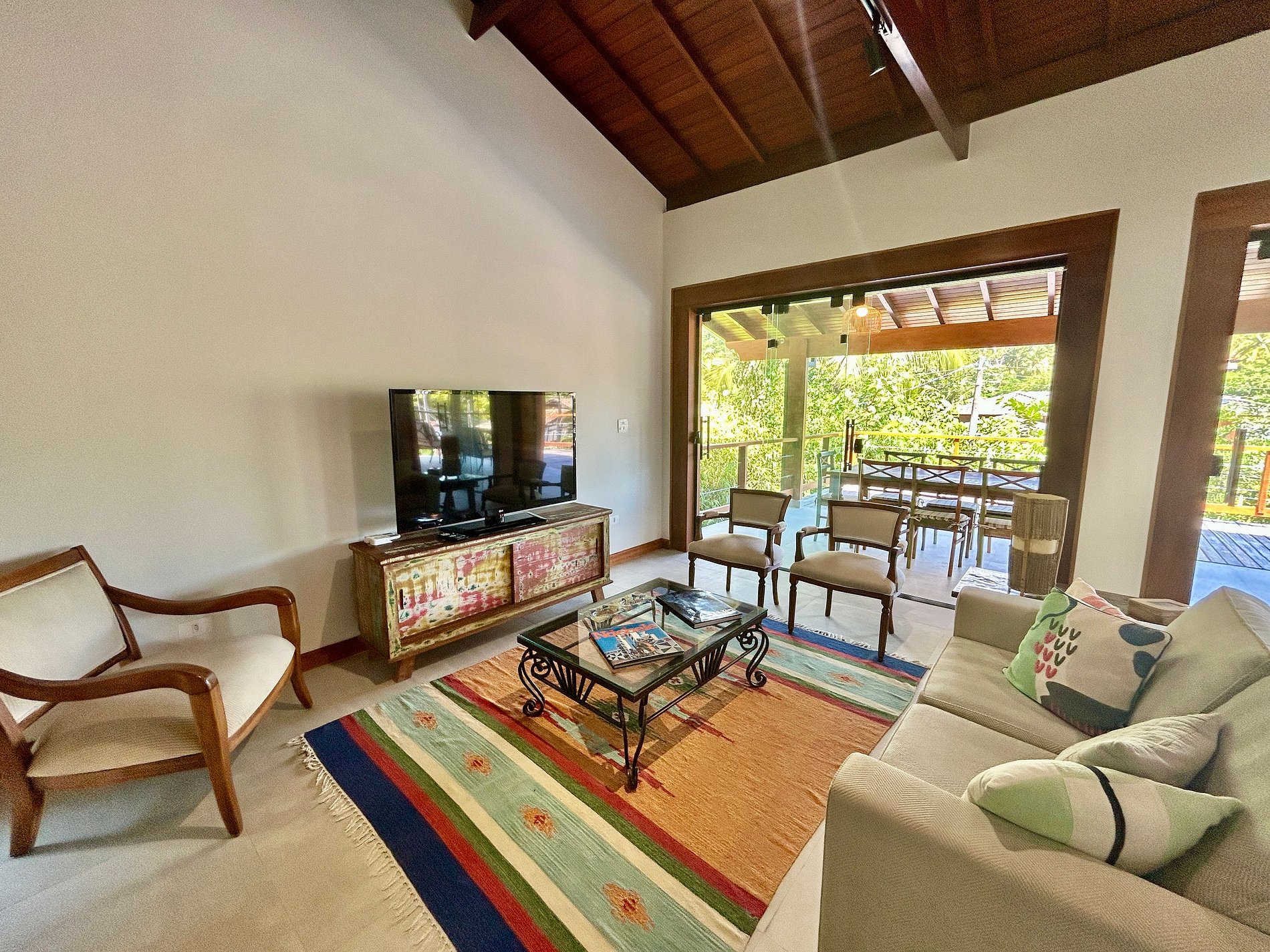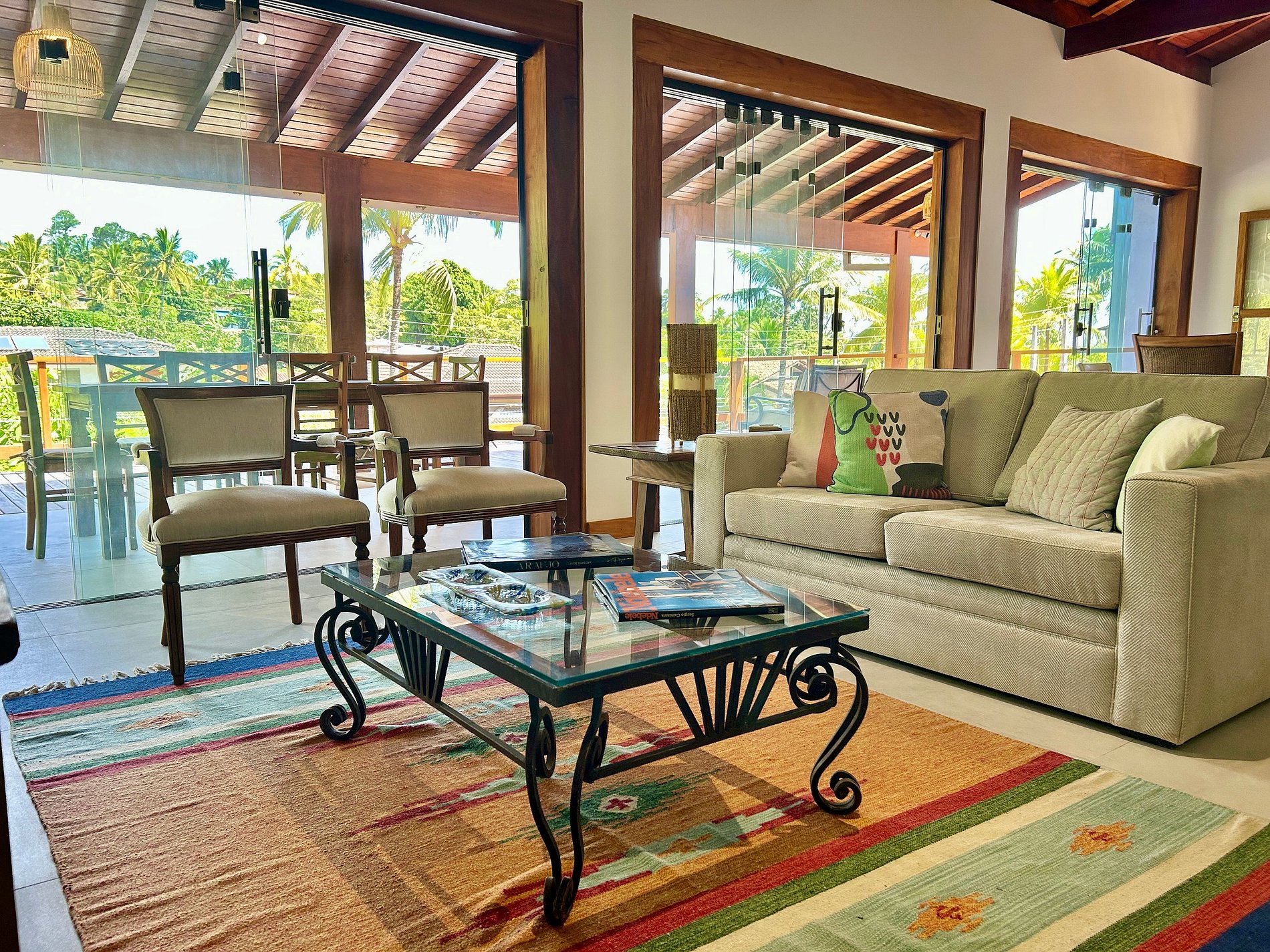 Uma das experiências mais acolhedoras e confortáveis de Ilhabela. Casa moderna e muito bem decorada, no São Mathias, tradicional condomínio pé na areia, na praia da Feiticeira, ao Sul de Ilhabela, onde o quintal é o mar. Ideal para 12 pessoas. São 6 suítes, todas com ar-condicionado. Salas de estar, jantar, cozinha e varanda integradas. Sala de TV e estar, varanda e deck no andar superior. Smart TV e Wi-fi. Área externa deliciosa, com piscina, churrasqueira portátil, belo jardim. É pet friendly!