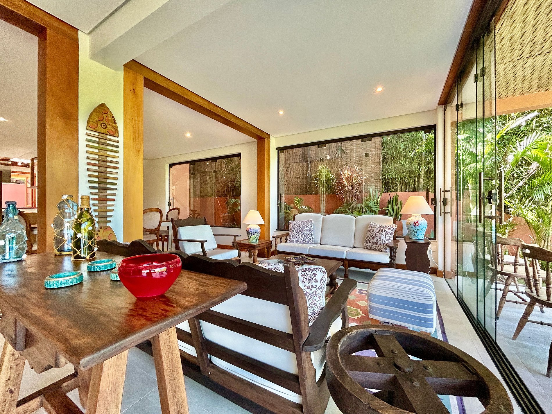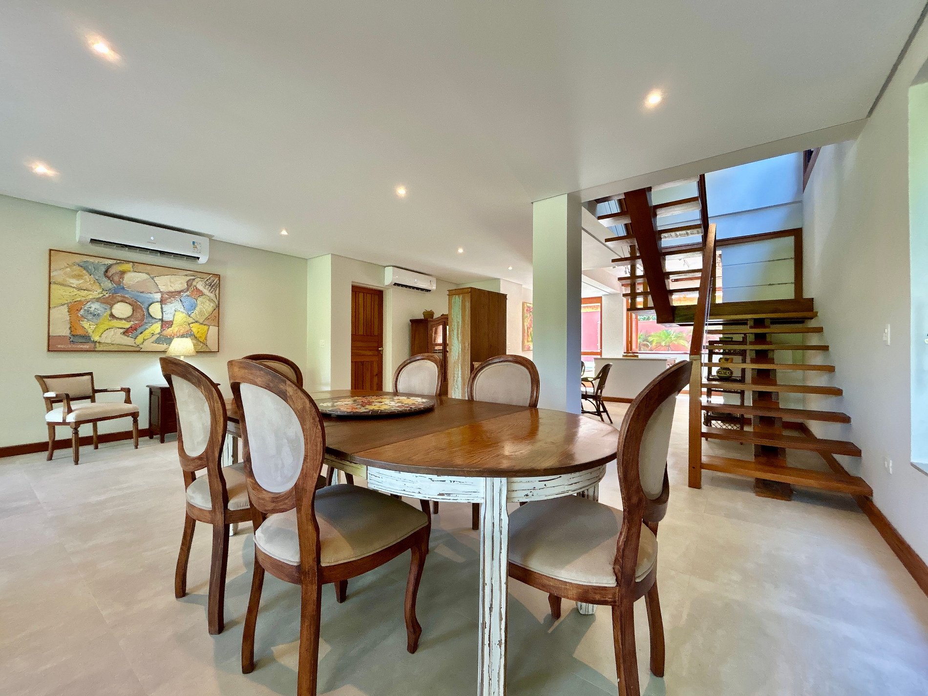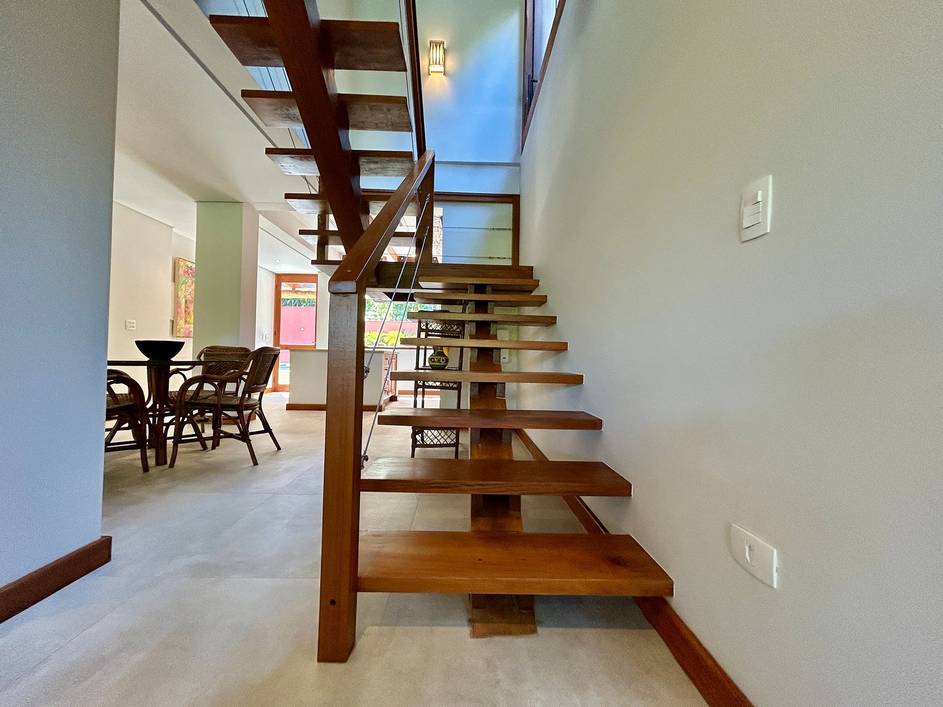 - A área social interna é acolhedora, agradável e com uma decoração de muito bom gosto. No térreo há um lavabo, salas de estar, jantar, varanda e cozinha moderna, em ambiente integrado. No andar superior, uma ampla sala de TV e estar, integradas à uma varanda com deck de madeira e mesa para refeições ao ar livre;
